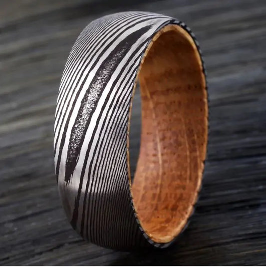 Wood Grain Damascus Steel and Whiskey Barrel Ring