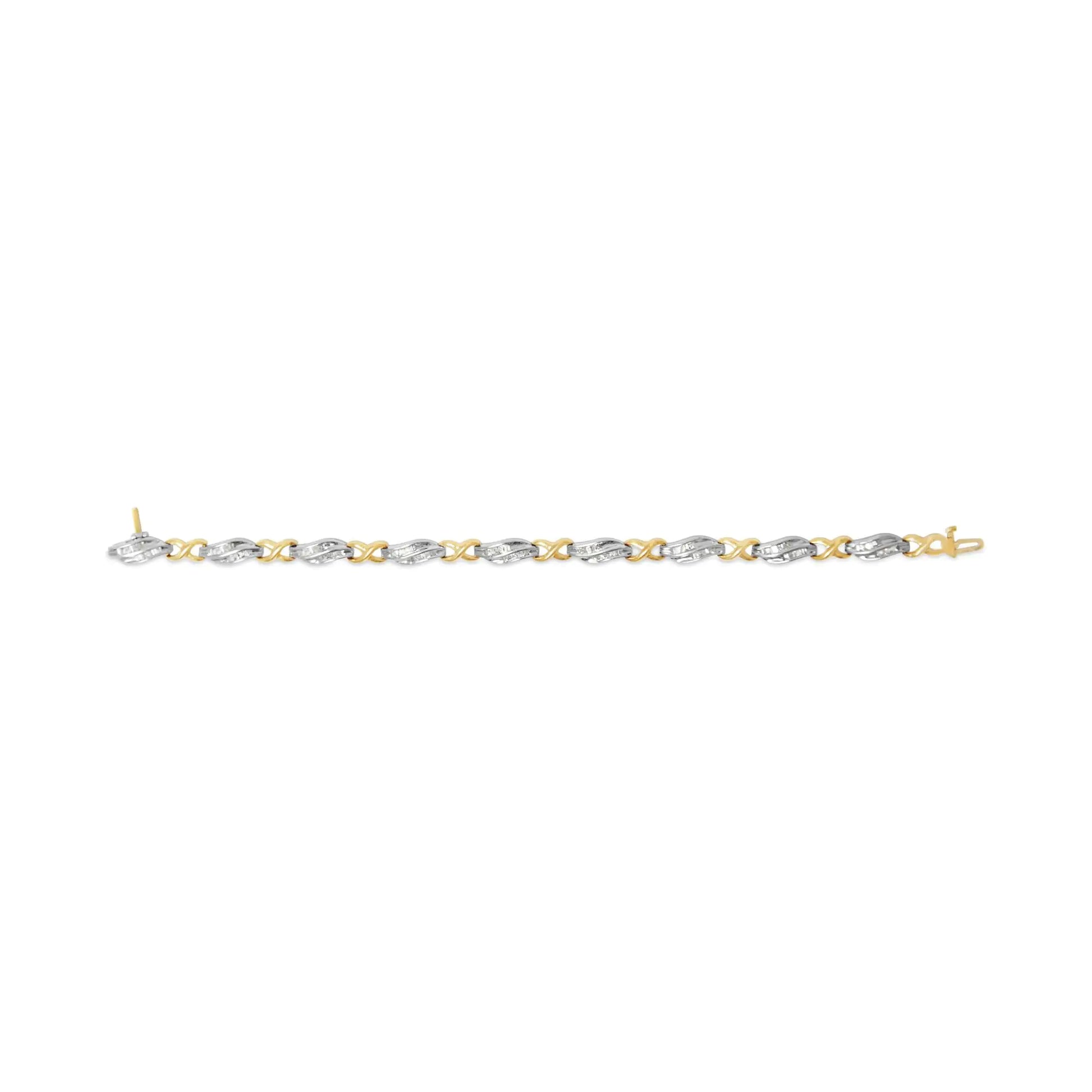This stunning 10K two-tone gold bracelet is a must-have for any fashion-forward woman. With a total diamond weight of 1.00 cttw and 116 baguette diamonds in a chic chevron wave link design, this bracelet is sure to turn heads. The diamonds are I-J in color and have an I2-I3 clarity, making them a great value without sacrificing on sparkle. The channel setting ensures the diamonds stay securely in place, while the box clasp keeps the bracelet comfortably on your wrist. Perfect for any occasion, this baguette diamond infinity design link bracelet is a timeless piece that will be treasured for years to come.