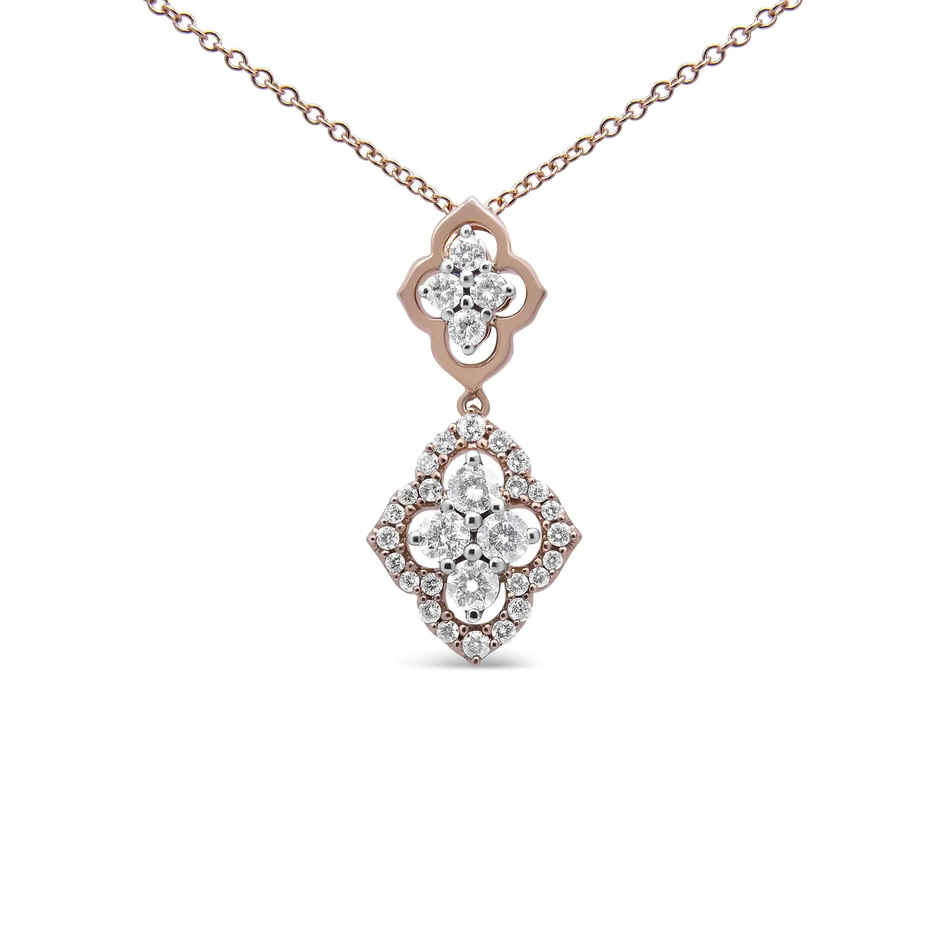 Accent your outfits with this exquisite diamond pendant necklace. This geometrically-inspired pendant features two unique quatrefoil designs. The top quatrefoil features four round white diamonds in a shared prong setting surrounded by a complementing frame of 14k rose gold openwork. The lower quatrefoil takes the piece by storm with four larger white diamonds as the centerpiece in a shared prong setting, surrounded by an openwork frame that is adorned with smaller round white diamonds in a shared prong setting. This sensational piece is crafted in genuine 14k rose gold, a metal that will stay tarnish free for years to come! The 3/4 cttw diamonds are of an approximate H-I color and I1-I2 clarity. This stunning pendant extends from an 18" box chain and secures with a spring ring clasp.