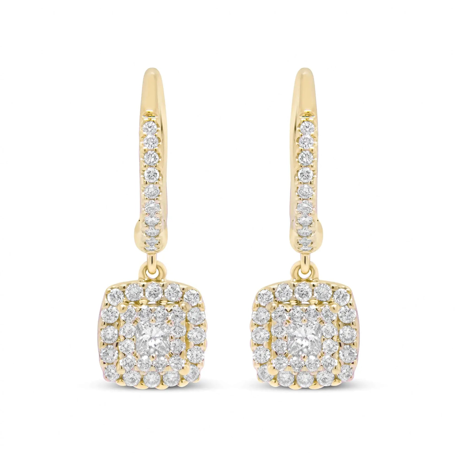 Layer on the sparkle wearing these supremely divine double halo dangle earrings made from genuine 14k yellow gold. At the center of each earring is a gleaming princess-cut diamond in an invisible setting that perfectly showcases this sparkling white stone in all its glory. A double halo design embraces this centerpiece with round diamonds in prong settings. The diamonds that decorate this stunning pair total 5/8 cttw with an approximate H-I Color and SI1-SI2 Clarity. The latch findings keep these earrings safe and secure on your ears for comfortable, worry-free wear all day long.