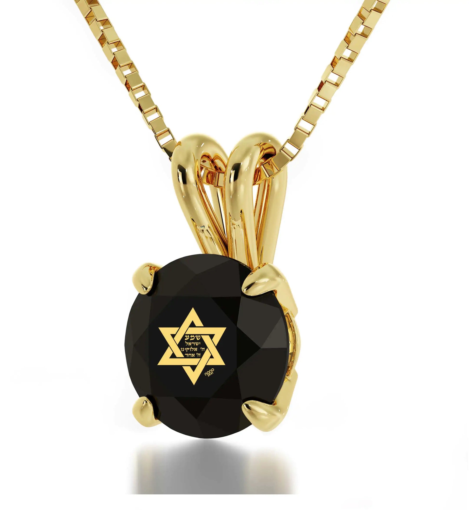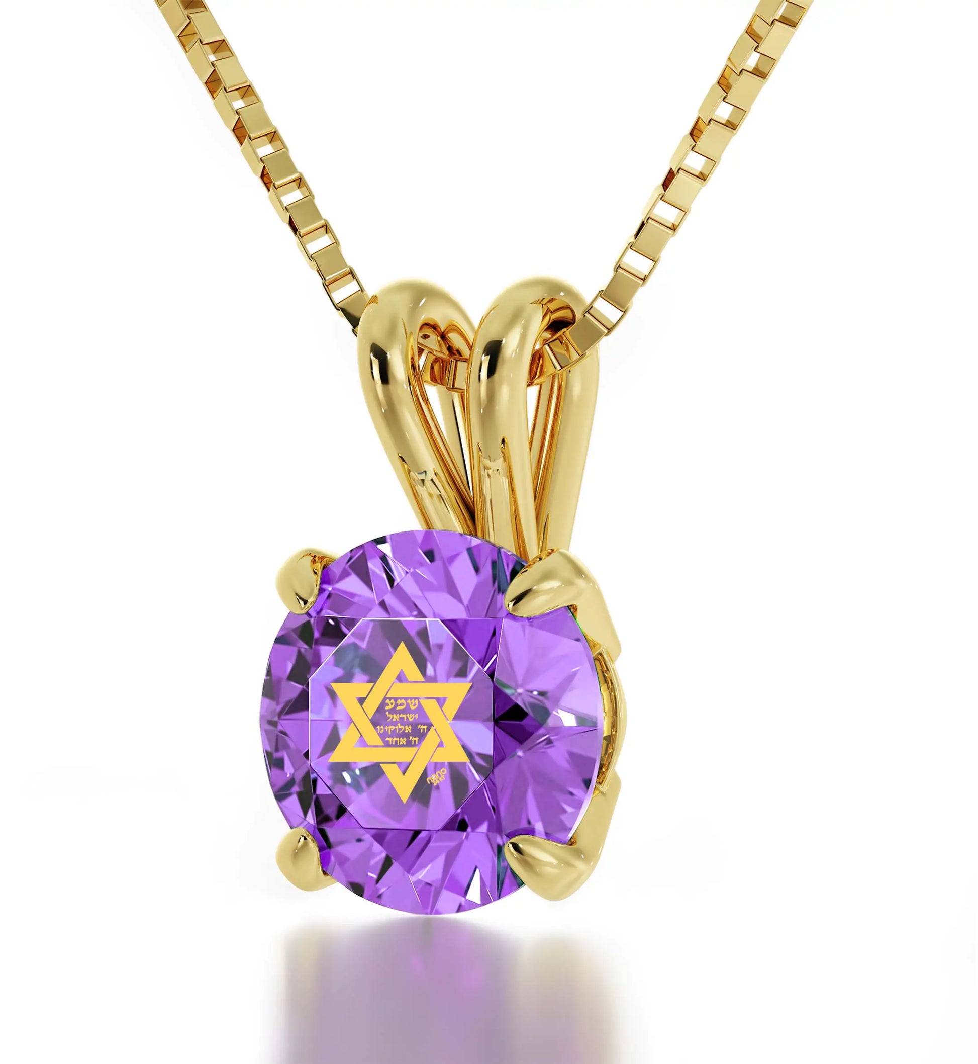 A brilliant-cut crystal Swarovski inscribed in 24k gold with the Star of David and first part of the most profound Jewish prayer the Shema Israel in Hebrew, set in a classic solitaire pendant.