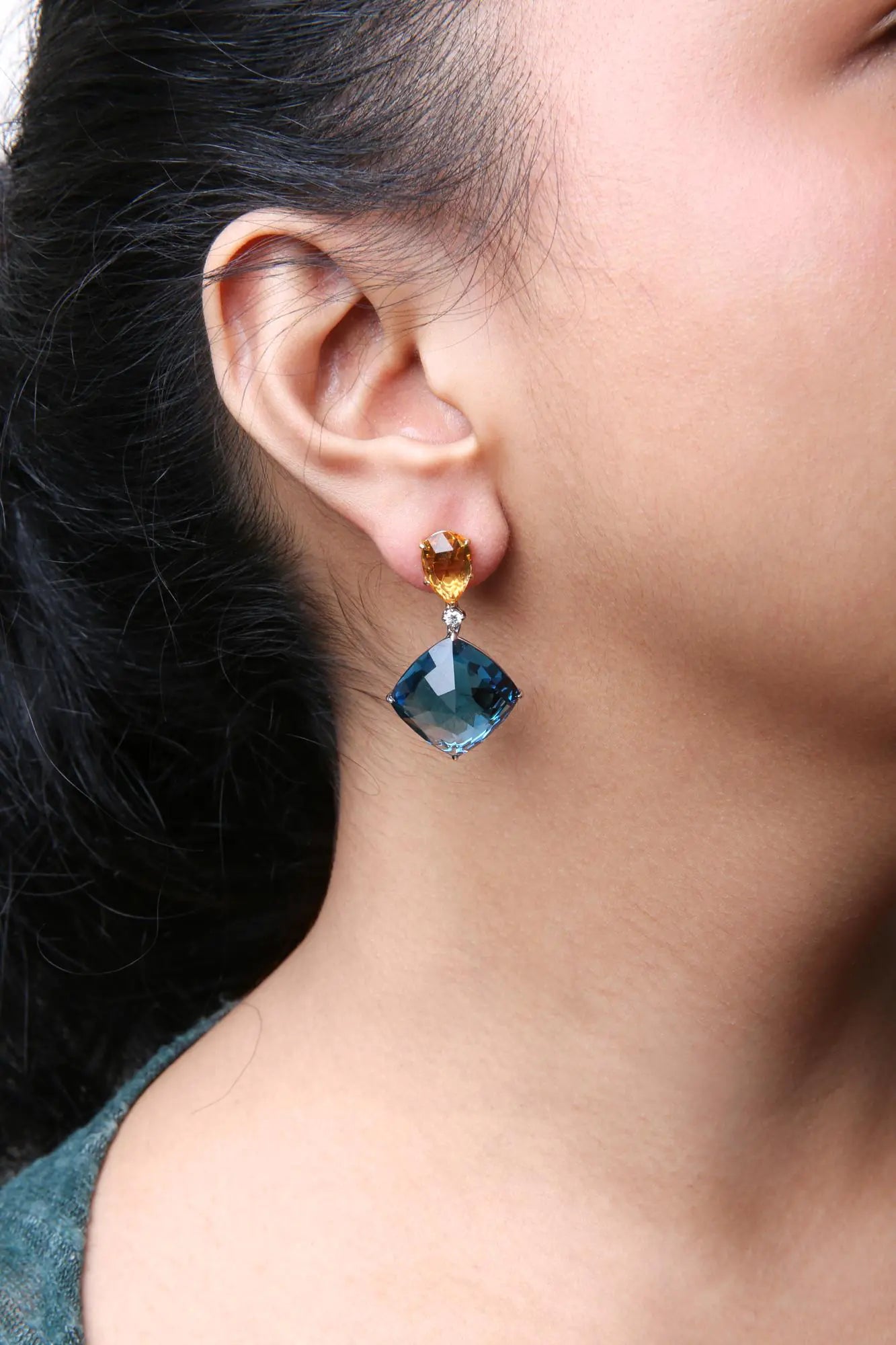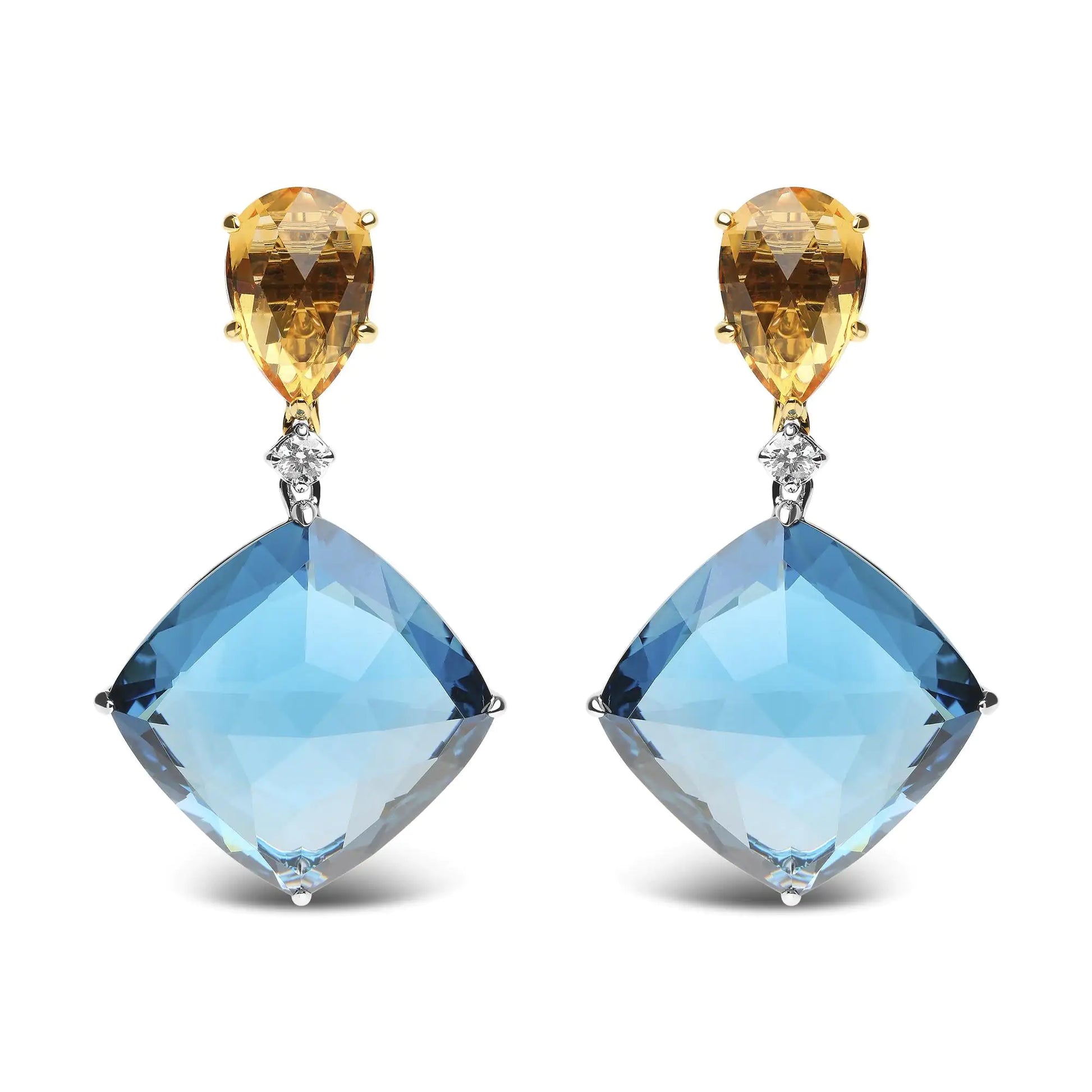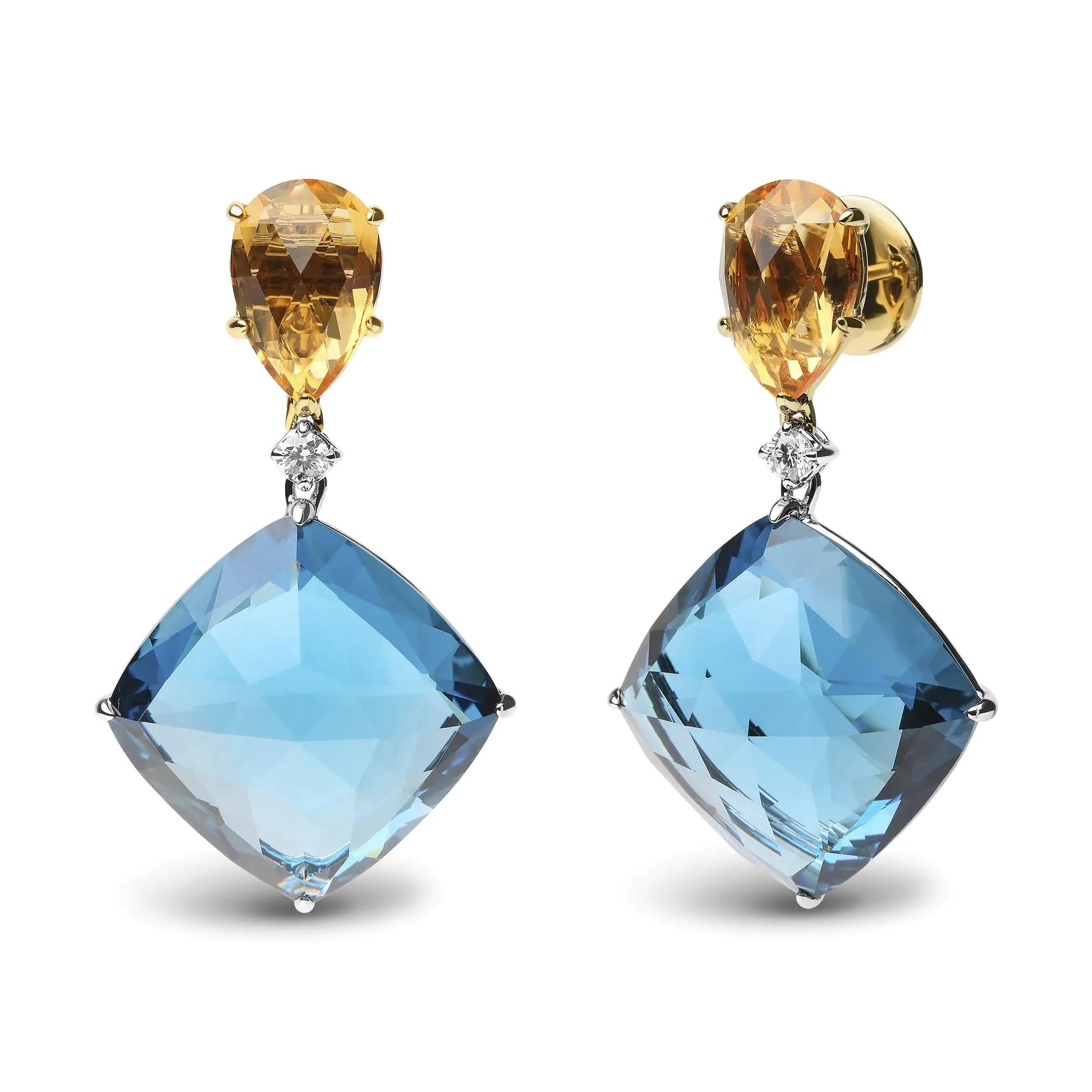 Indulge in the beauty of natural gemstones and give your ensembles a dazzling upgrade. These twinkling earrings are crafted of genuine 18k white and yellow gold, a metal that will stay tarnish-free for years to come. The linear look of this esteemed pair layers a 12x10mm pear cut heat-treated yellow citrine over a lower dangle with a 20mm cushion cut heat-treated blue topaz gemstone. Between each gem is nestled a round diamond within a prong setting. Each gemstone is secured with a 4-prong settings. The diamonds hold a total 1/6 cttw with an approximate G-H Color and SI1-SI2 Clarity. The push back findings keep these pierced earrings safe and secure on your ears for comfortable, worry-free wear all day long.