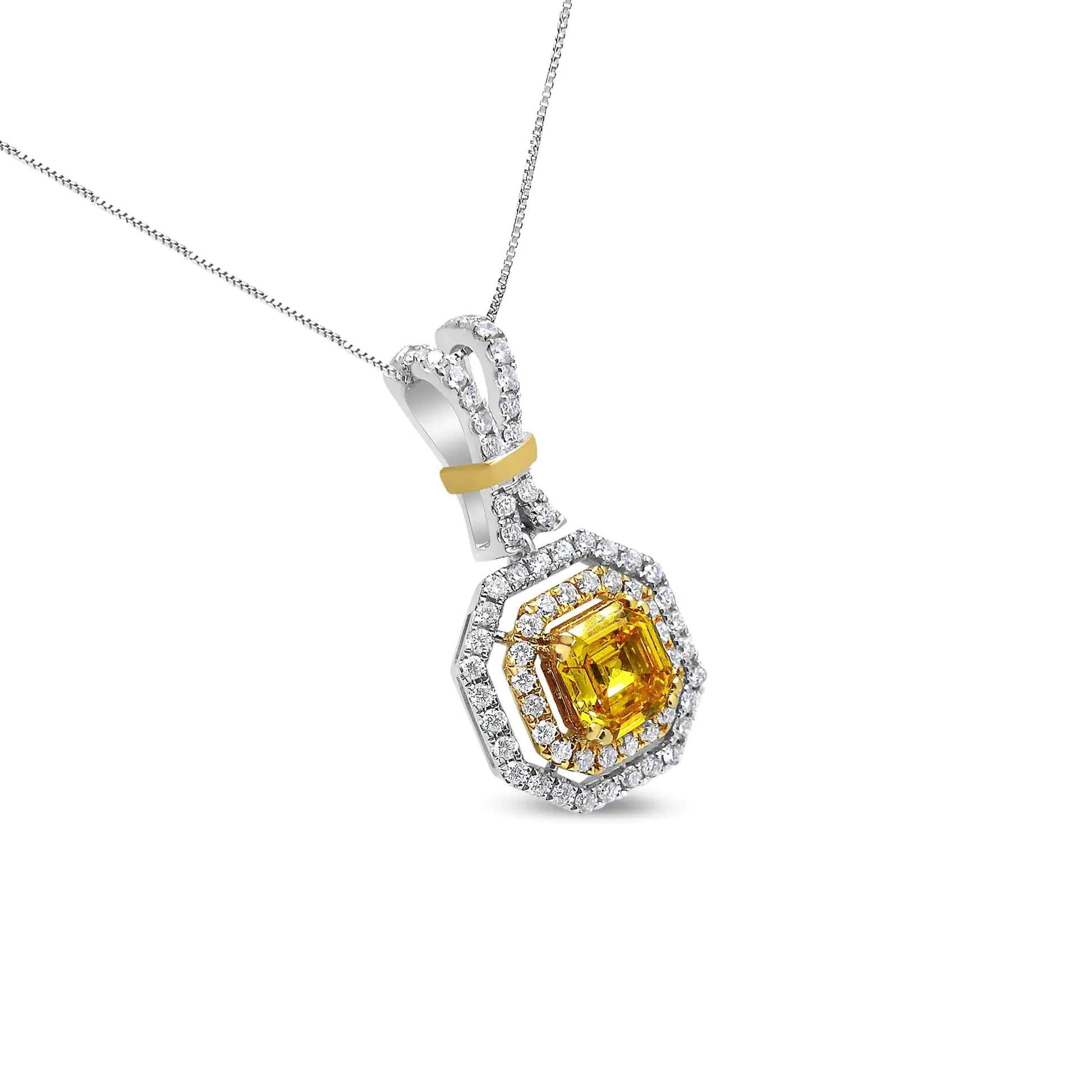 18K White and Yellow Gold 1.75 Cttw Lab Grown Treated Yellow Asscher Center Diamond Halo 18" Pendant Necklace (Yellow/G-H Color, VS1-VS2 Clarity)