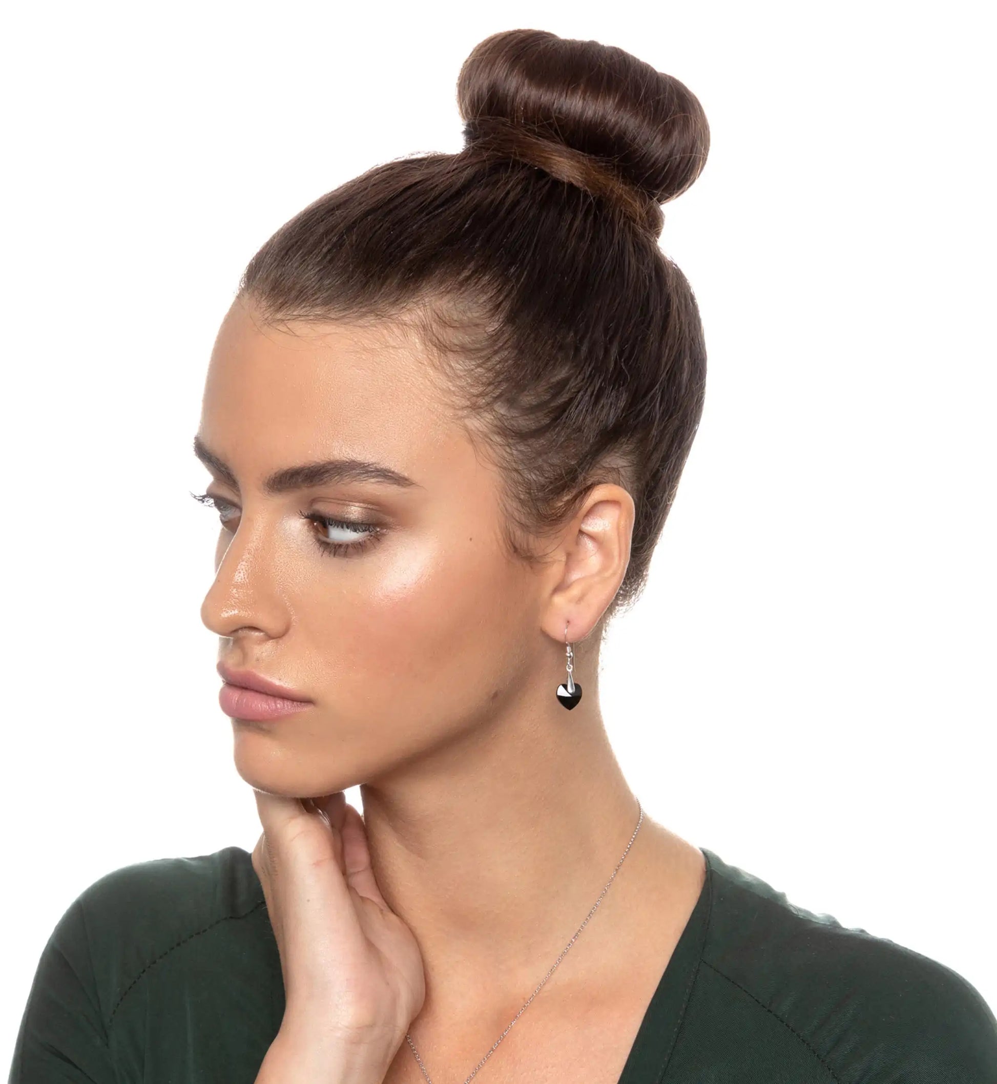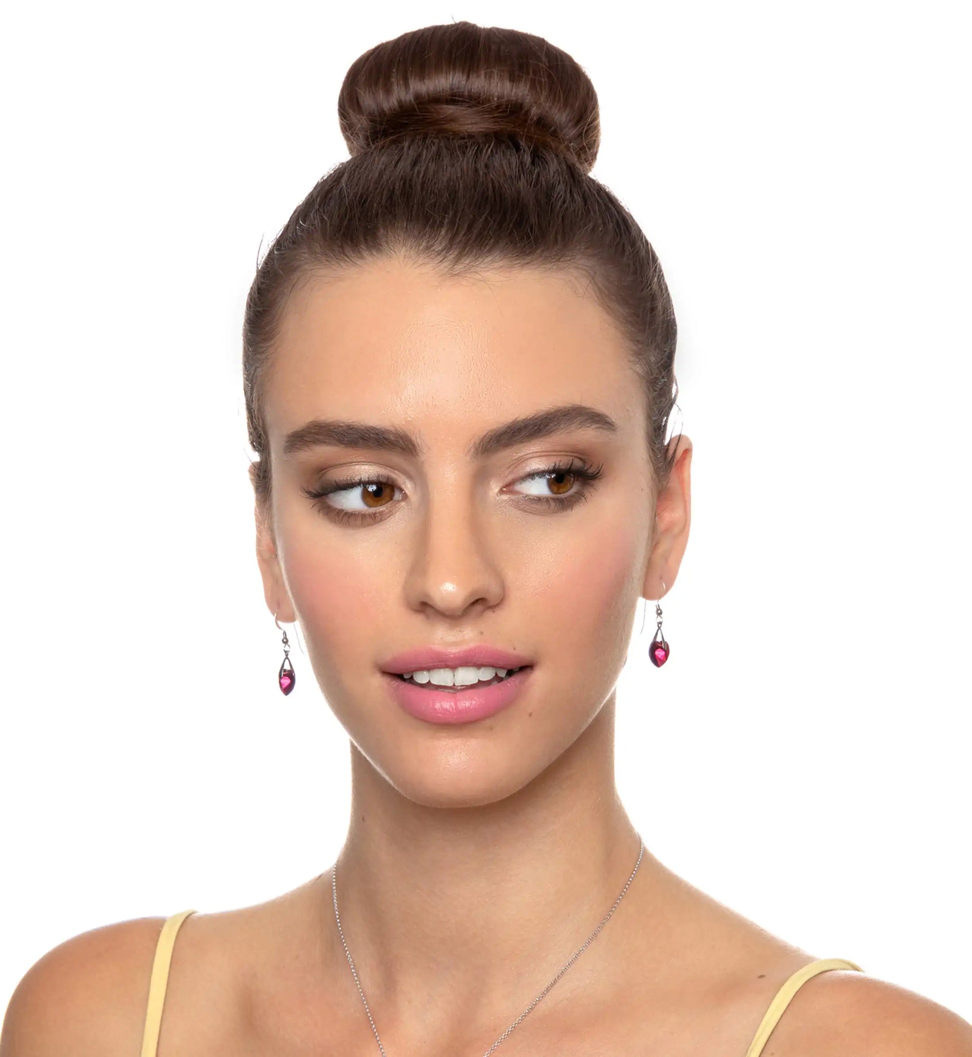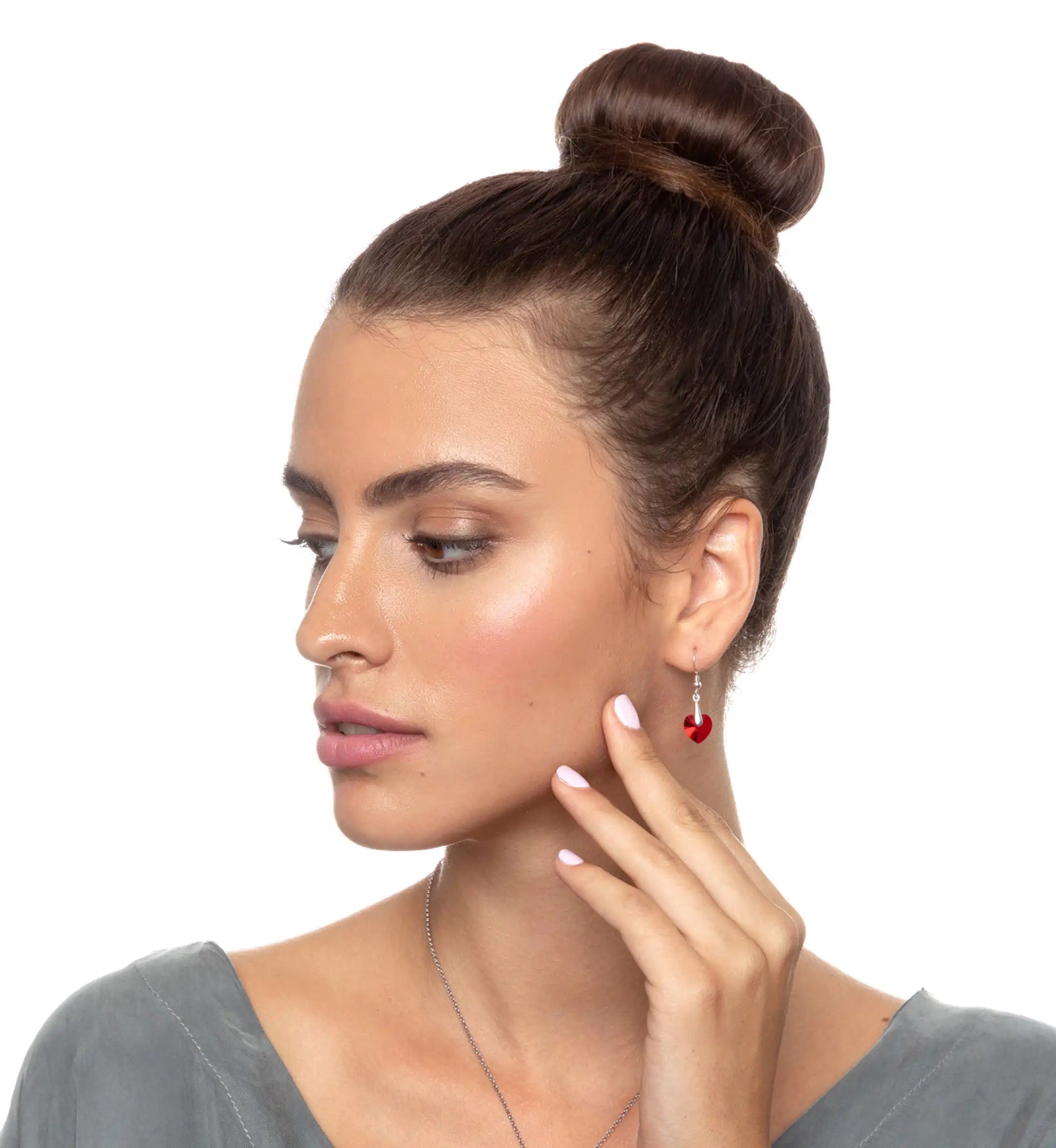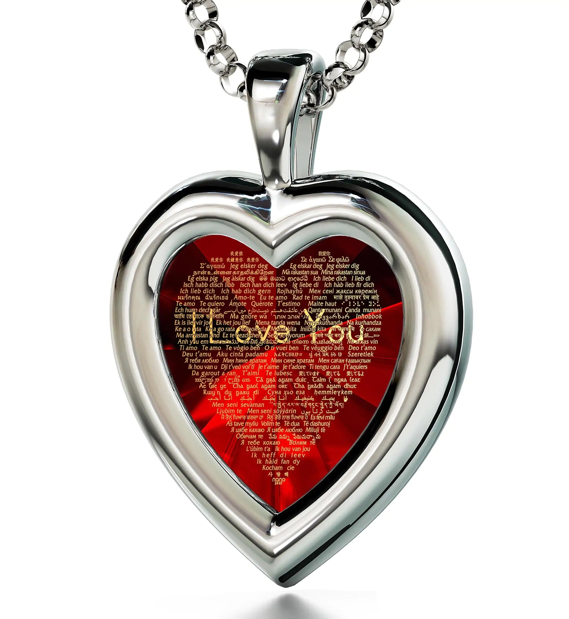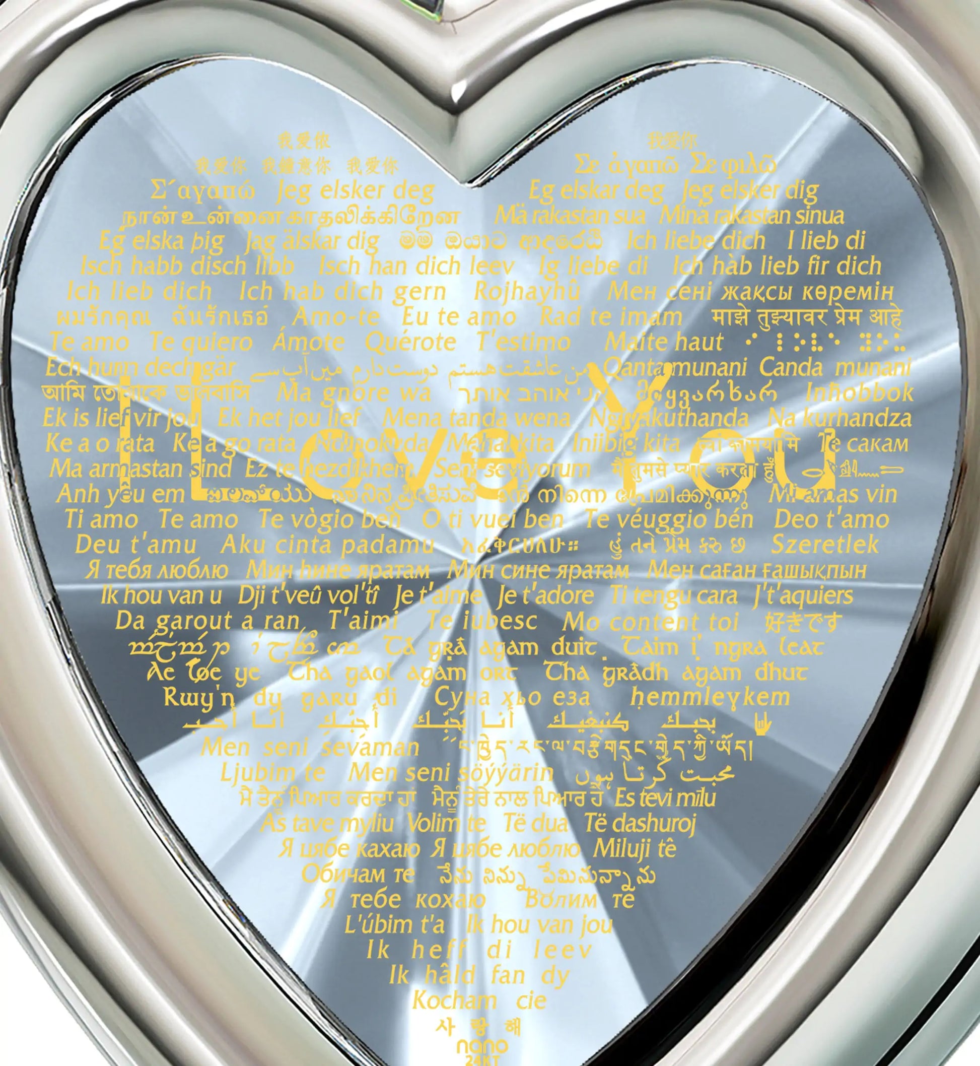 An elegant cubic zirconia heart pendant inscribed with "I love you" in 120 different languages in 24k gold, accompanied by crystal Swarovski heart earrings.