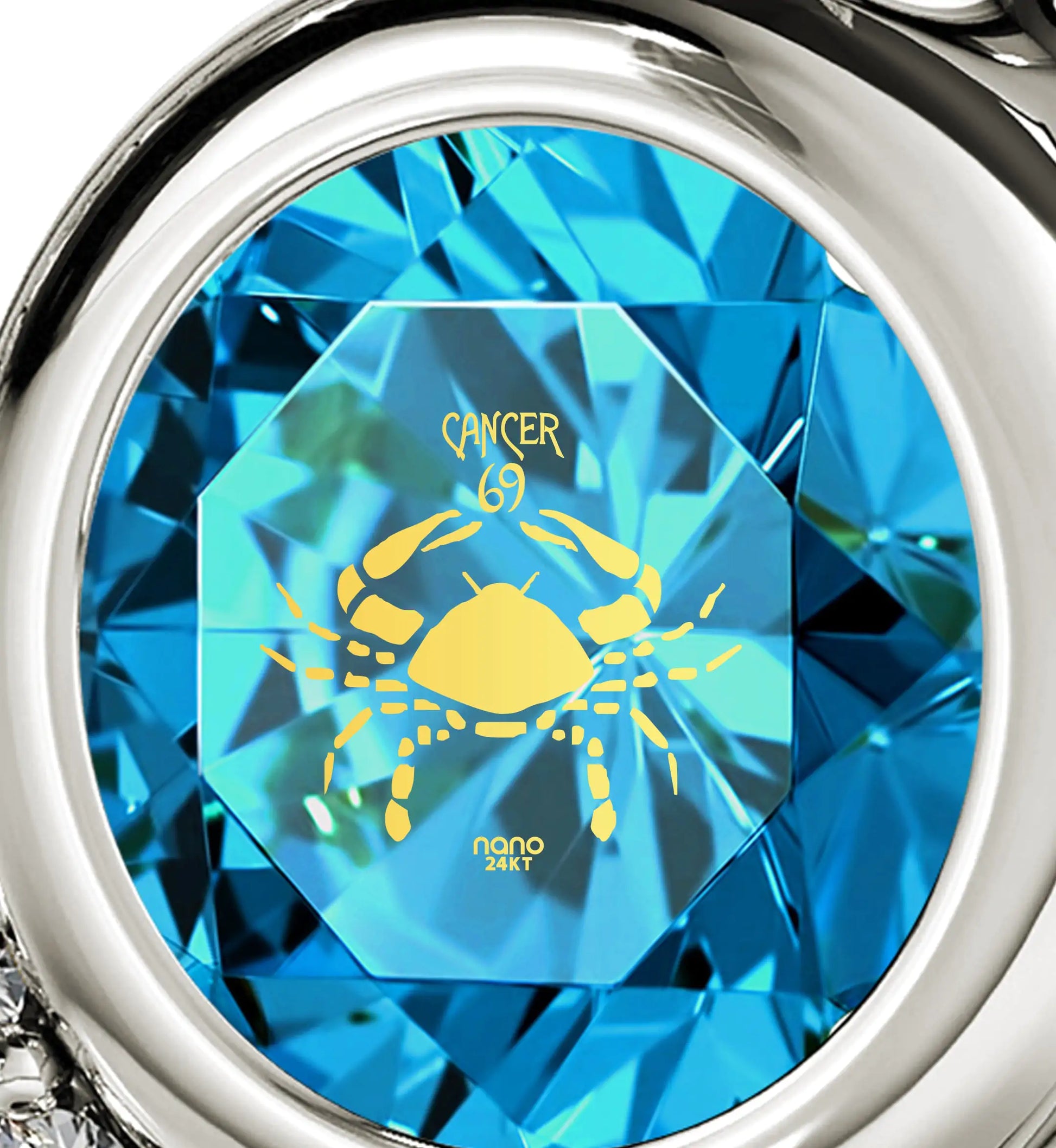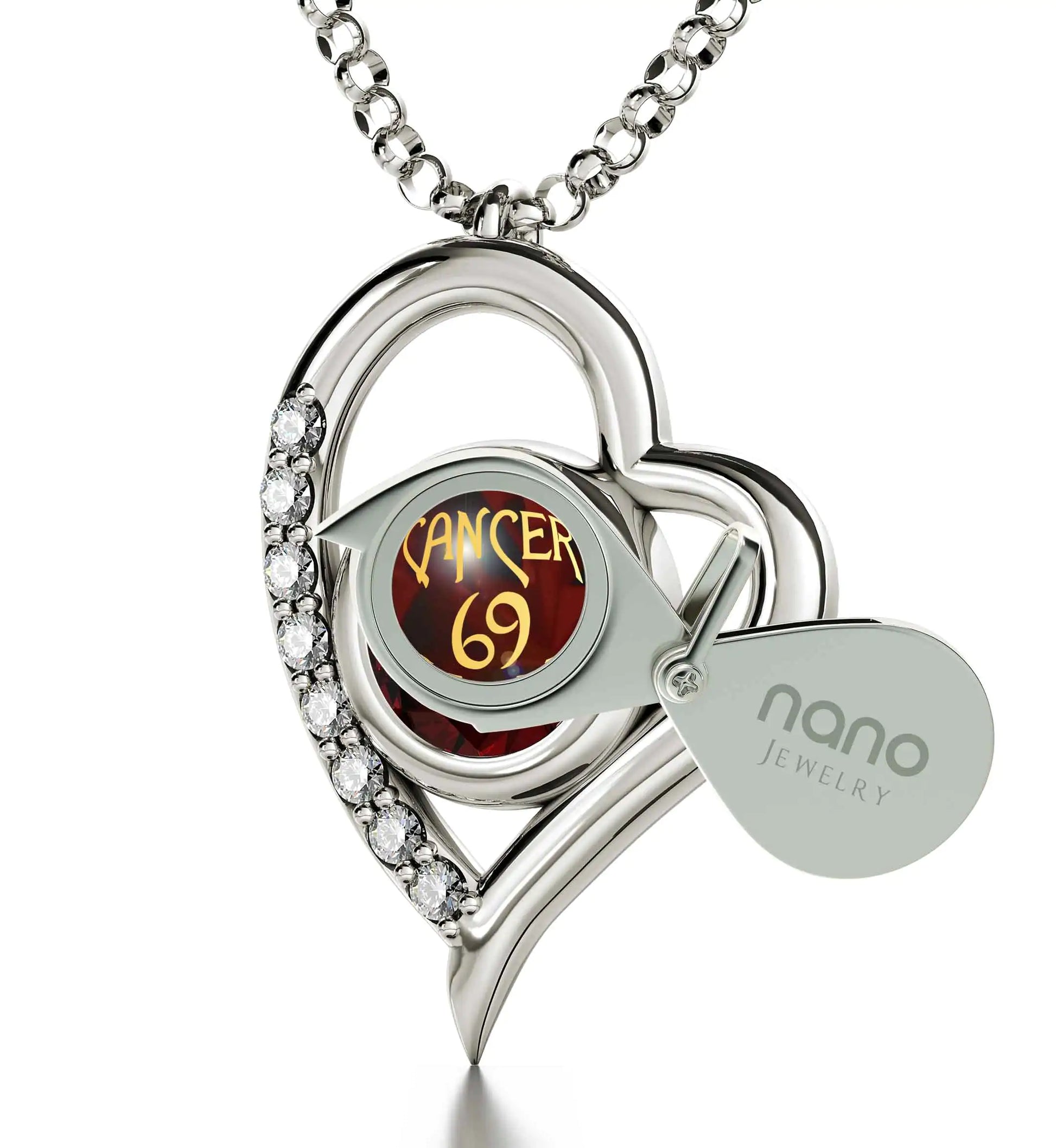 A brilliant round cut crystal Swarovski inscribed in 24k gold with the image of Cancer, the crab and star sign symbol, in 24k gold, set in a luxurious 925 sterling silver heart pendant, embellished with 8 cubic zirconia gemstones.