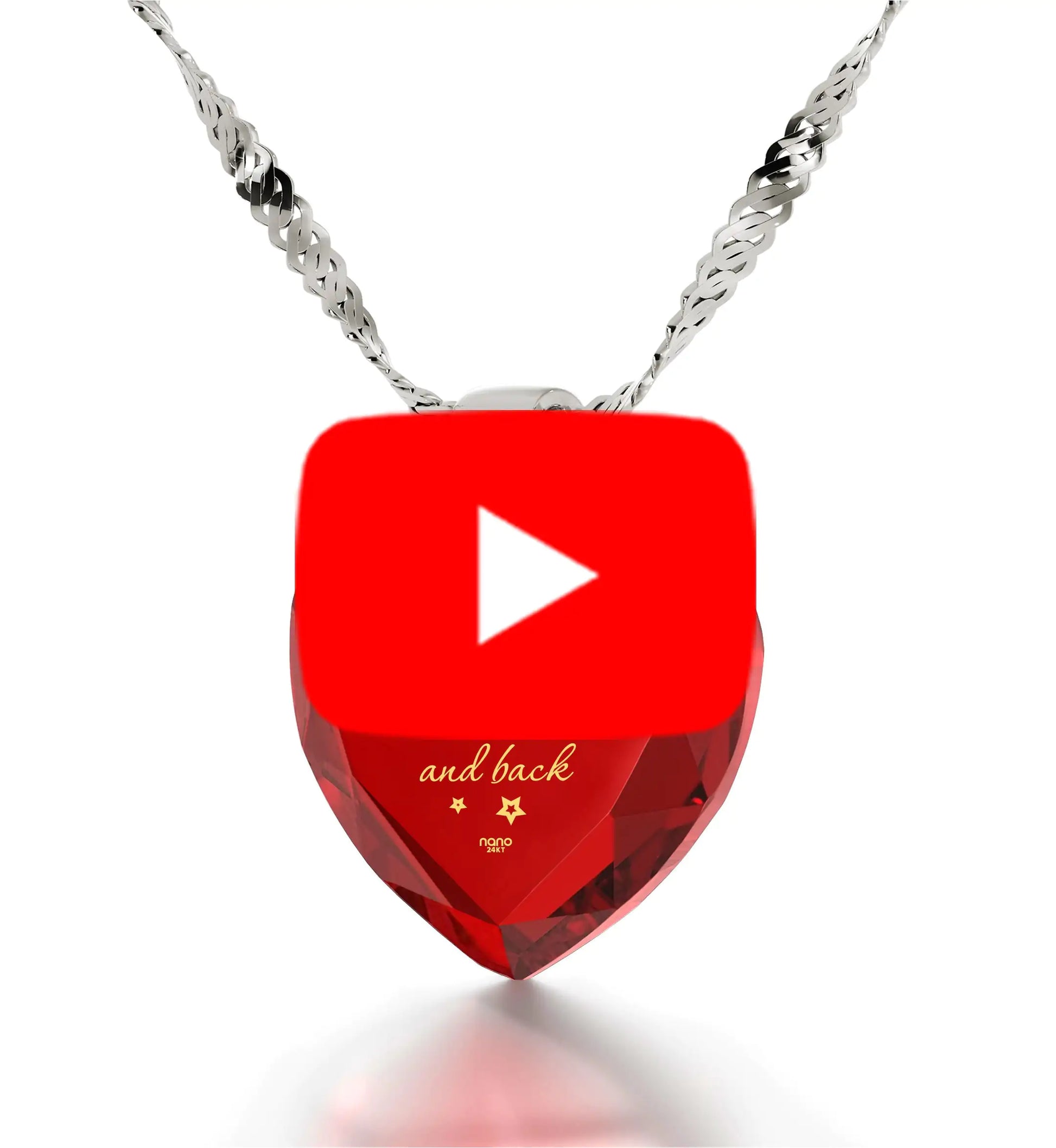 A beautifully crafted heart-shaped, faceted cubic zirconia pendant, inscribed with "I Love You to the Moon and Back" in 24k gold.