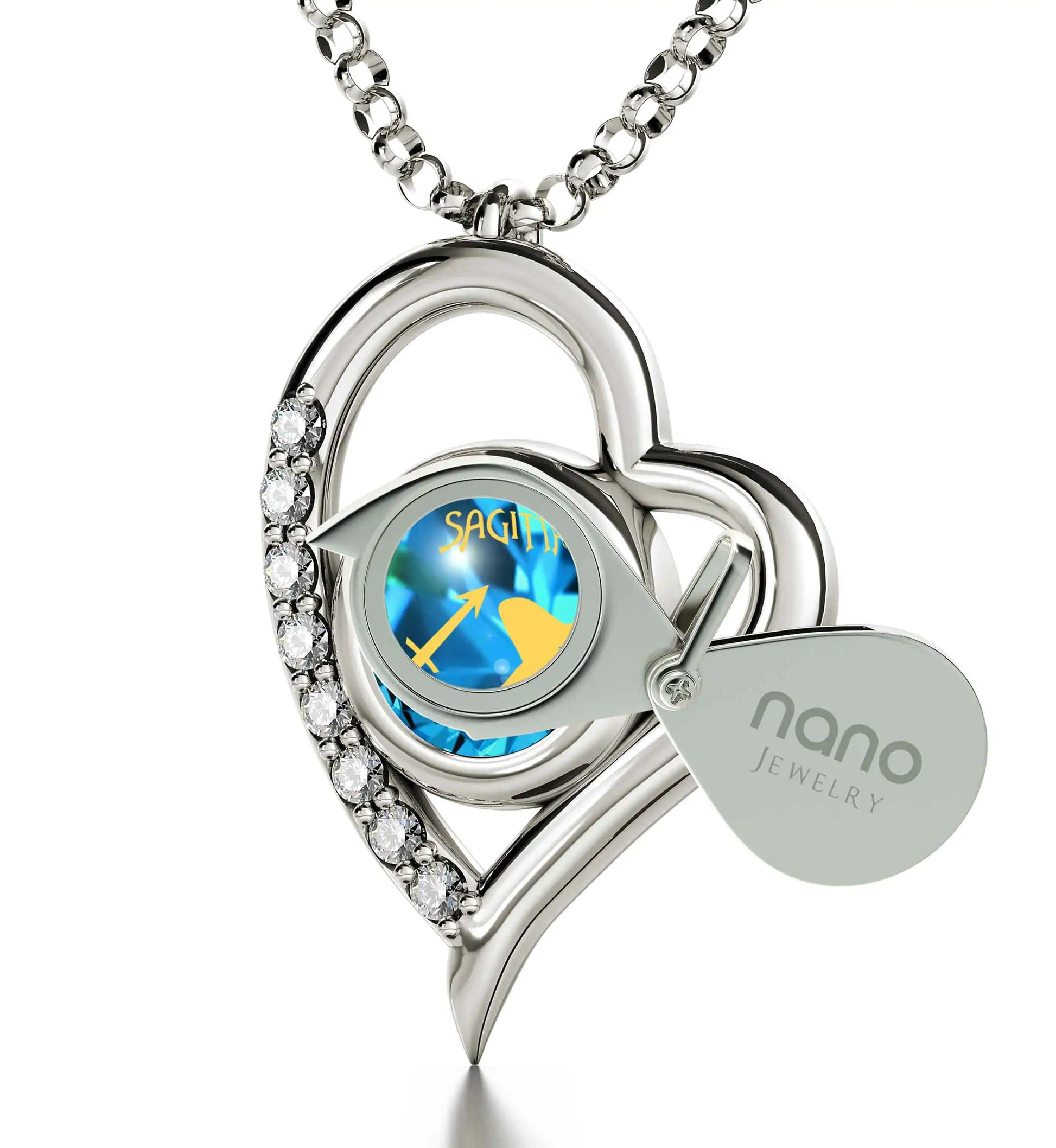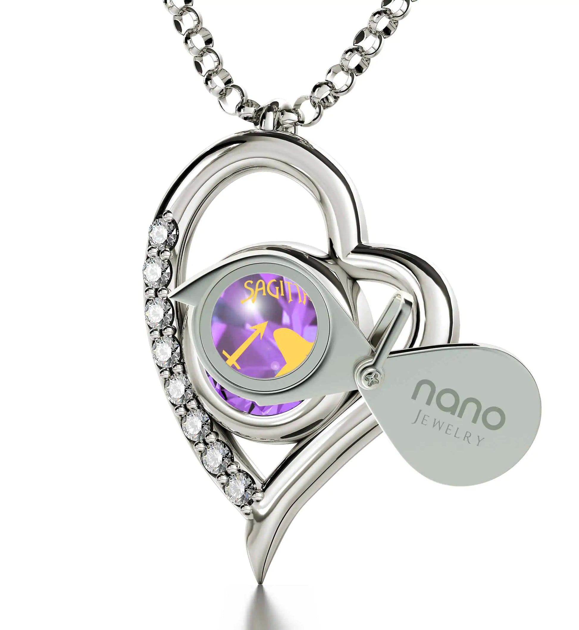 925 Sterling Silver Sagittarius Necklace Zodiac Heart Pendant 24k Gold Inscribed on Crystal