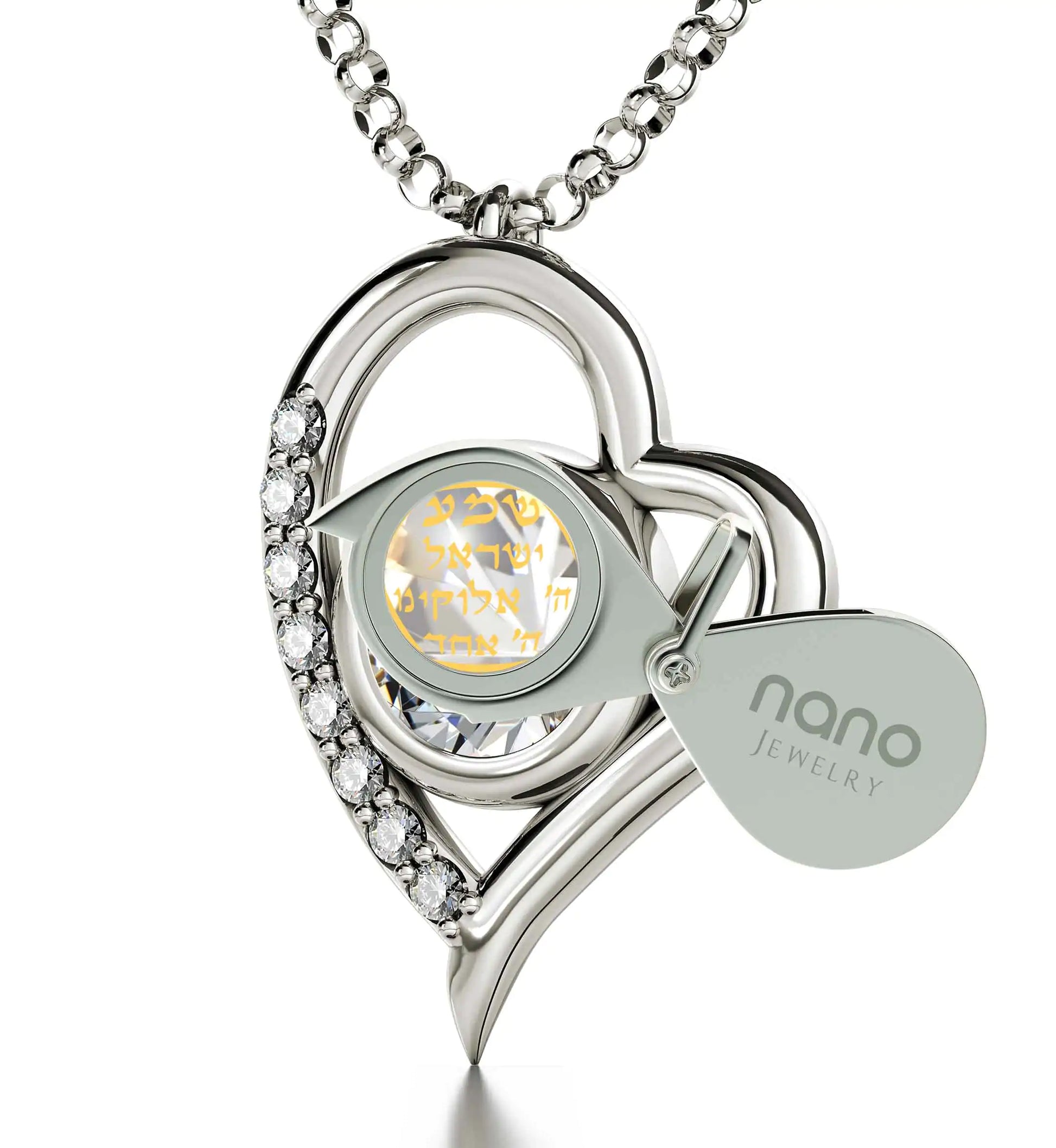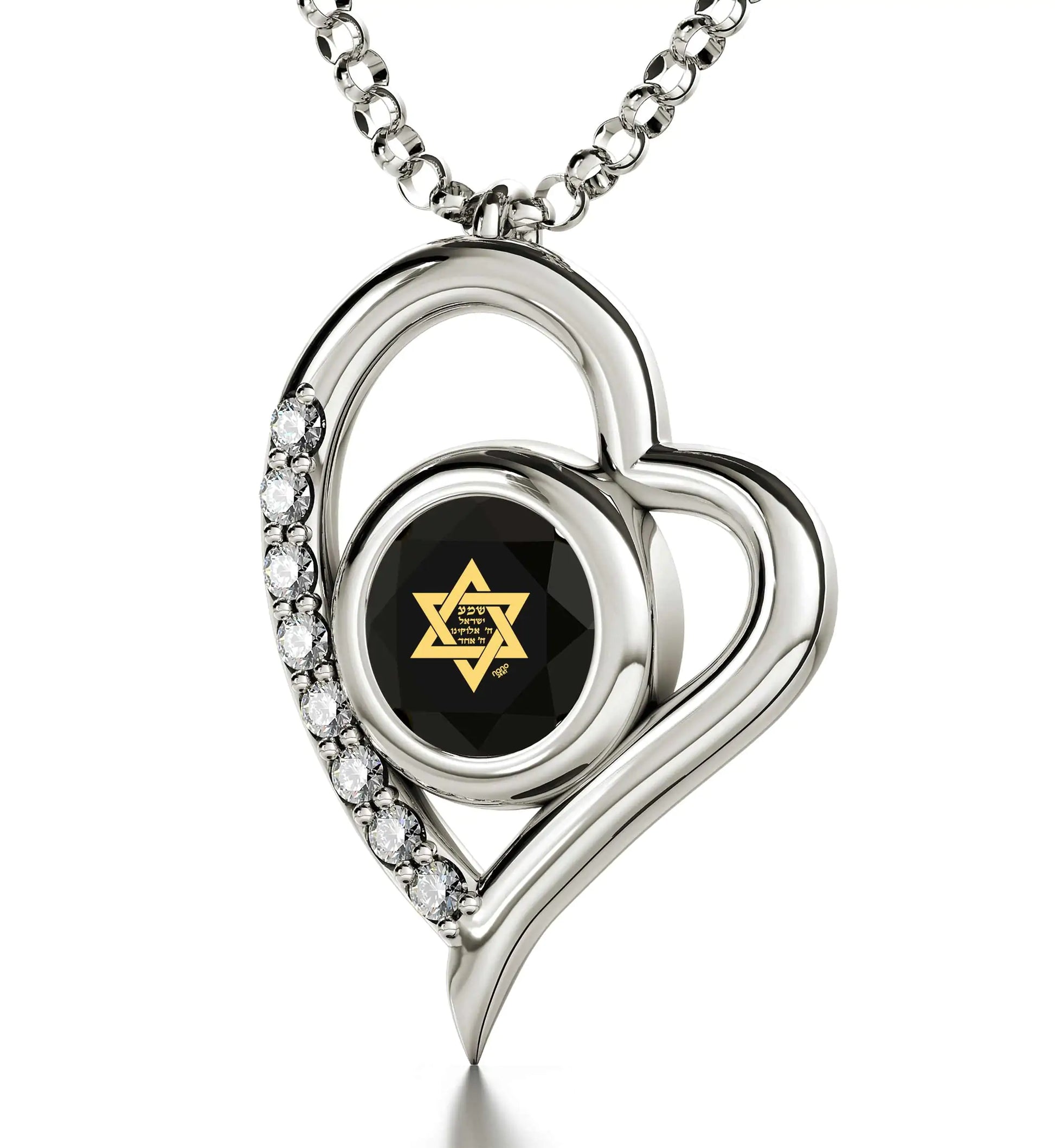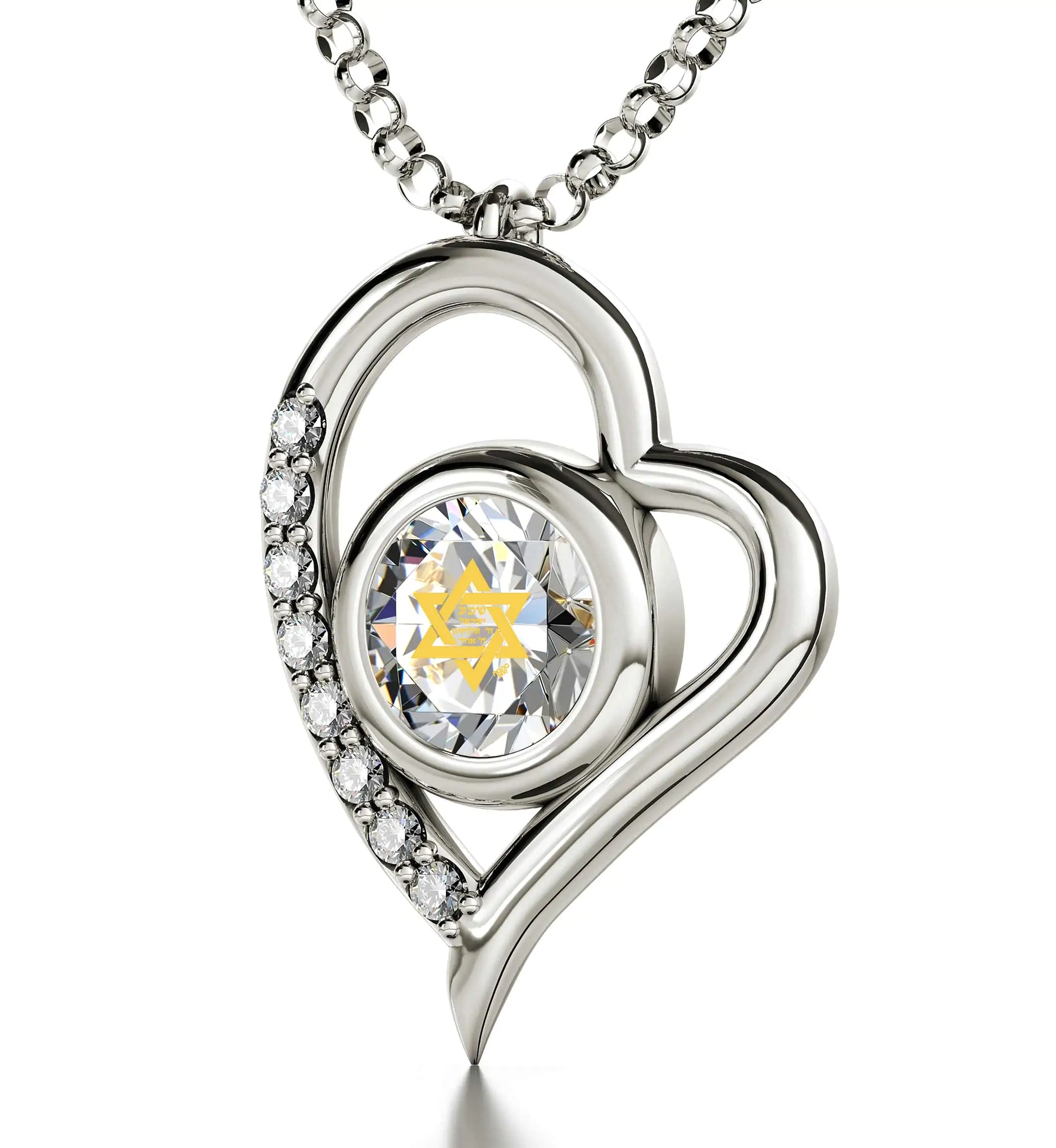 A brilliant-cut crystal Swarovski inscribed in 24k gold with the Star of David and first part of the most profound Jewish prayer the Shema Israel in Hebrew, set in a luxurious heart pendant embellished with 8 cubic zirconia stones.