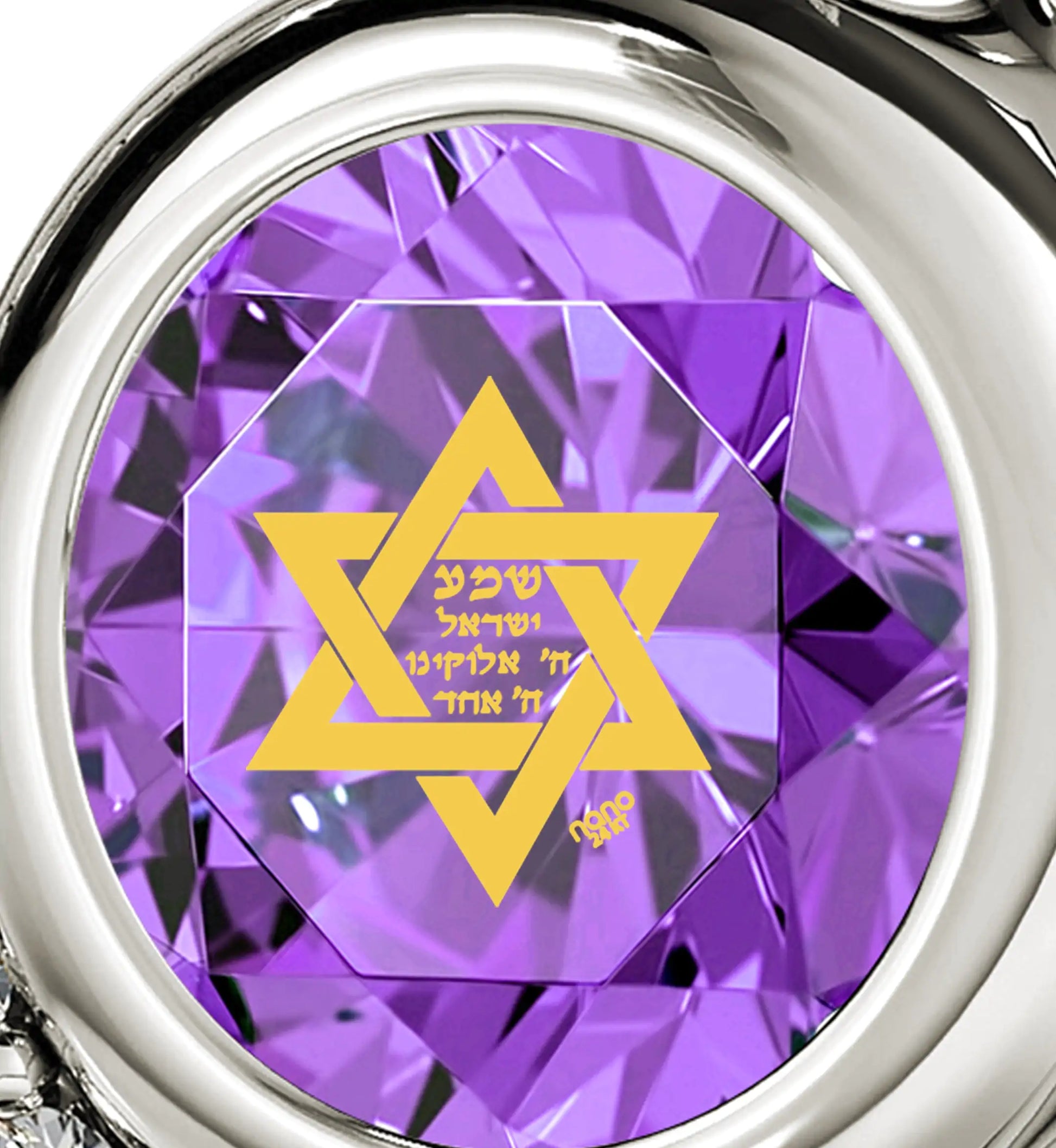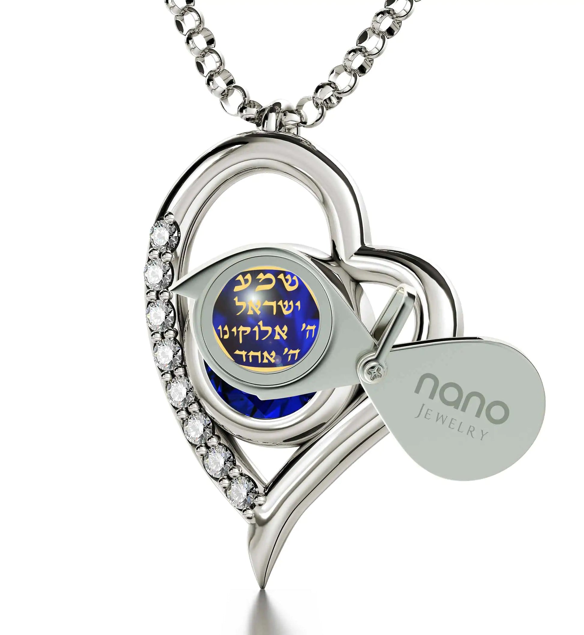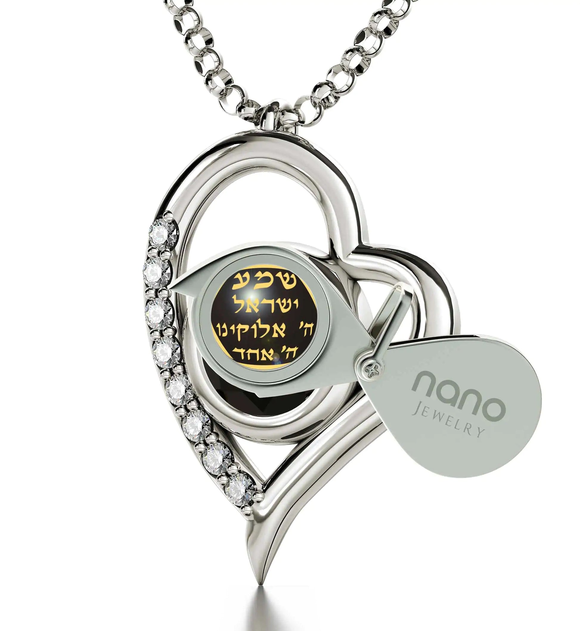 A brilliant-cut crystal Swarovski inscribed in 24k gold with the Star of David and first part of the most profound Jewish prayer the Shema Israel in Hebrew, set in a luxurious heart pendant embellished with 8 cubic zirconia stones.