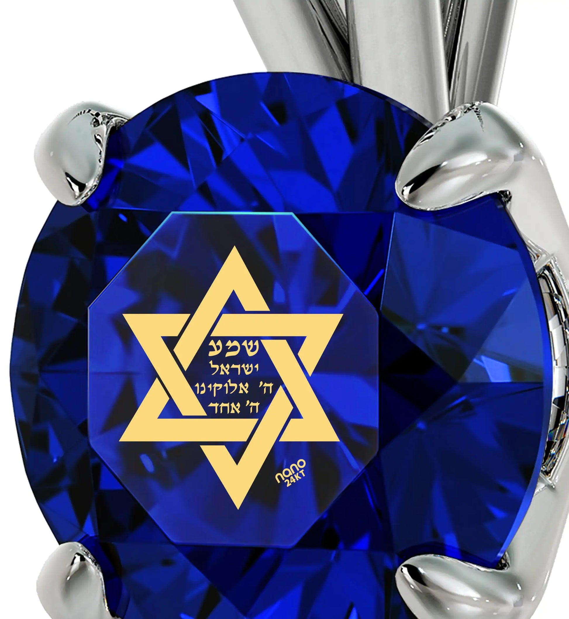 A brilliant-cut crystal Swarovski inscribed in 24k gold with the Star of David and first part of the most profound Jewish prayer the Shema Israel in Hebrew, set in a classic solitaire pendant.