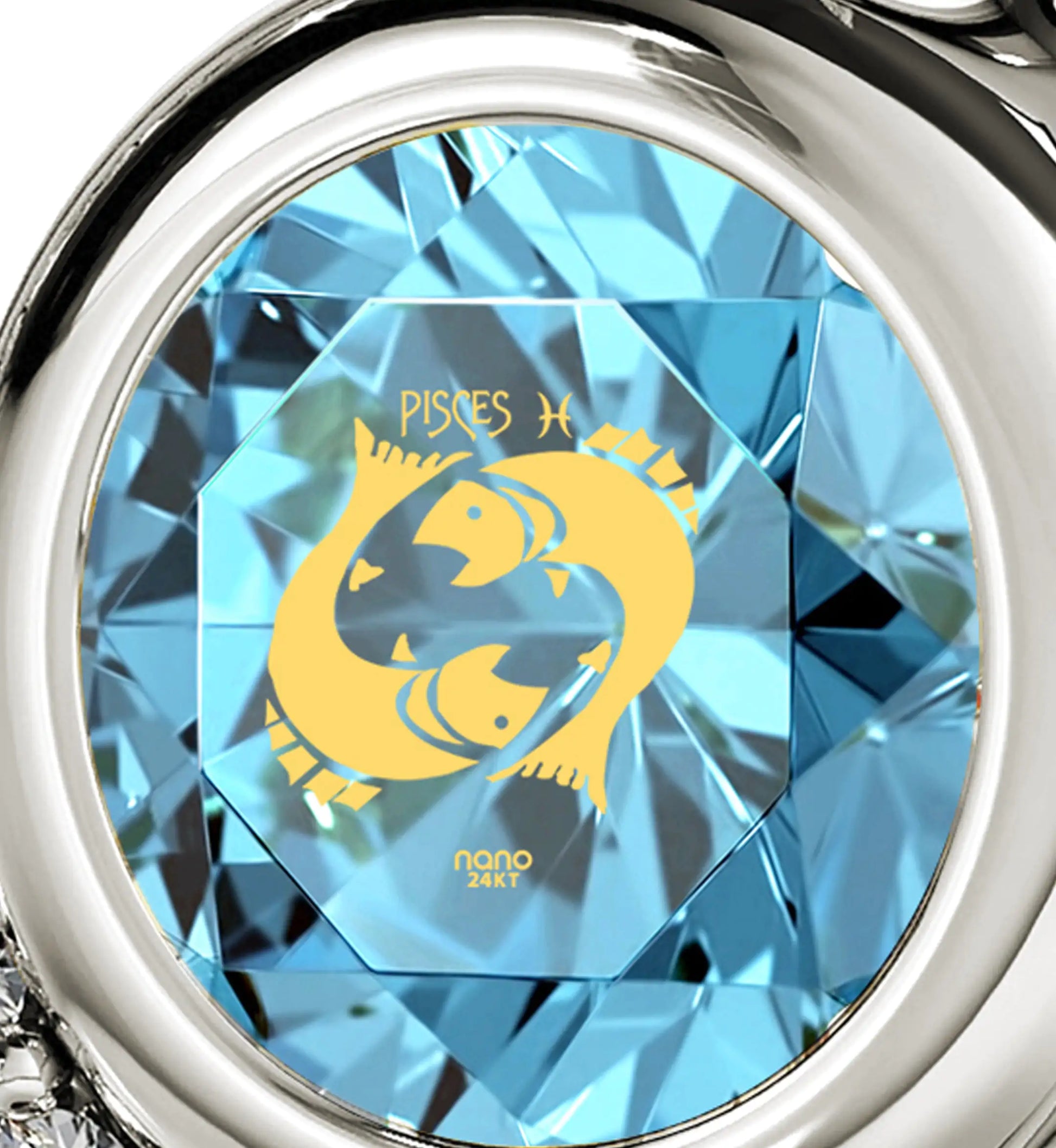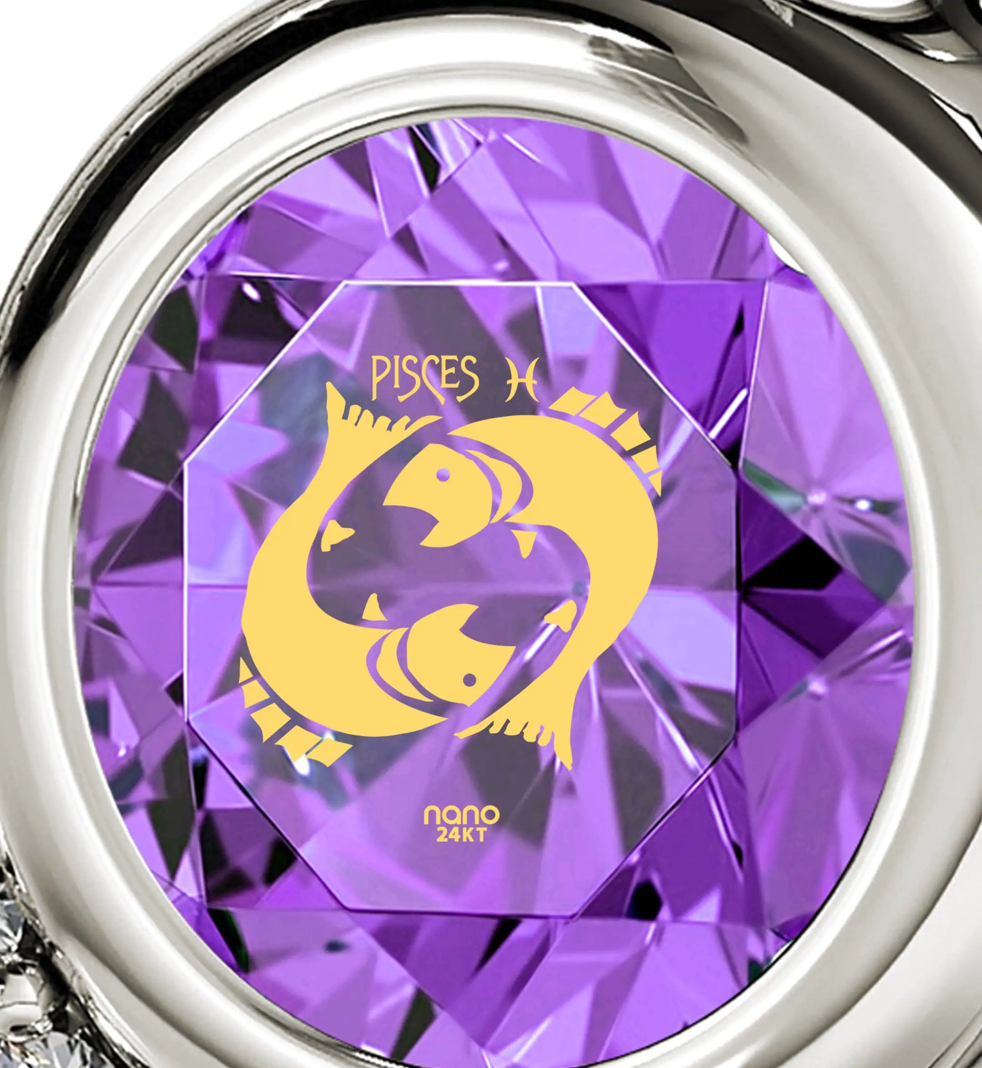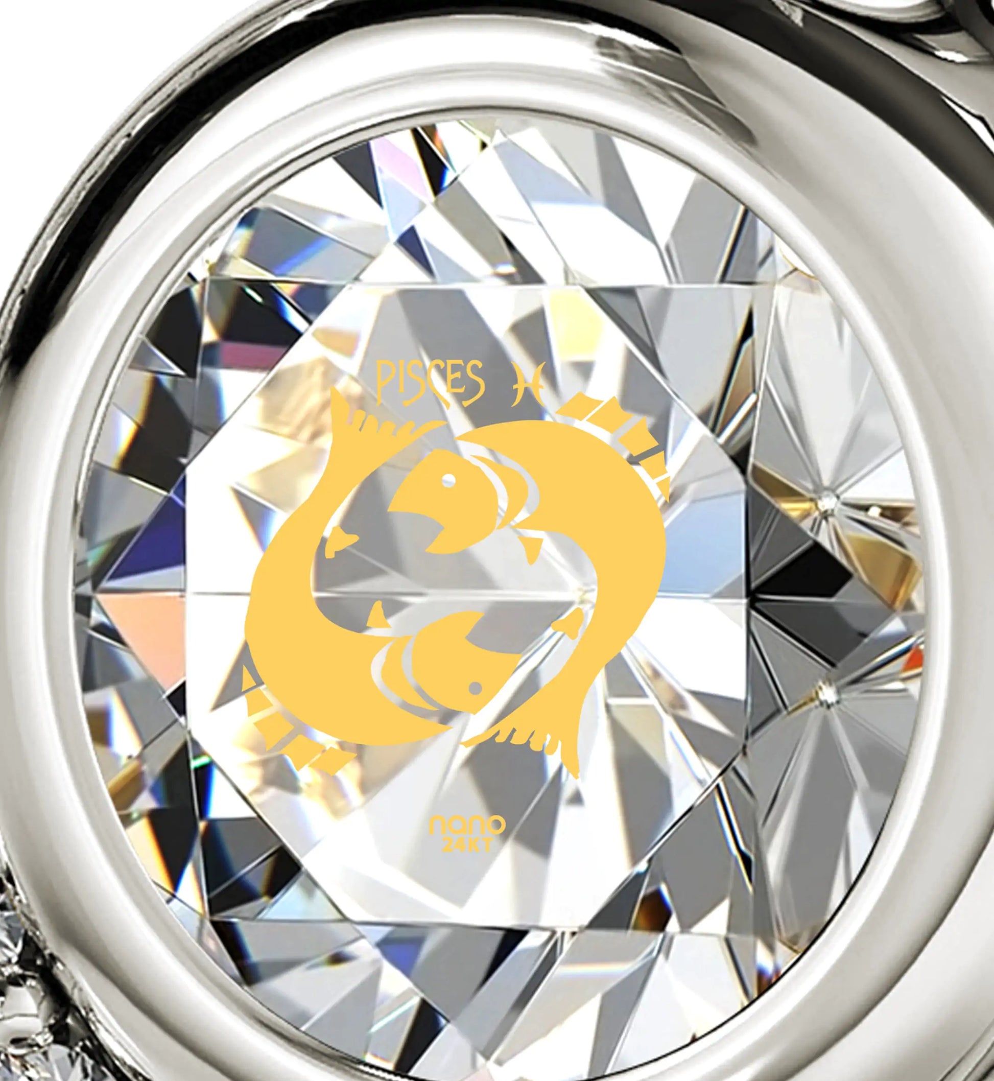 A brilliant round cut crystal Swarovski inscribed in 24k gold with the image of Pisces, the fish symbol and star sign symbol, in 24k gold, set in a luxurious 925 sterling silver heart pendant, embellished with 8 cubic zirconia gemstones.