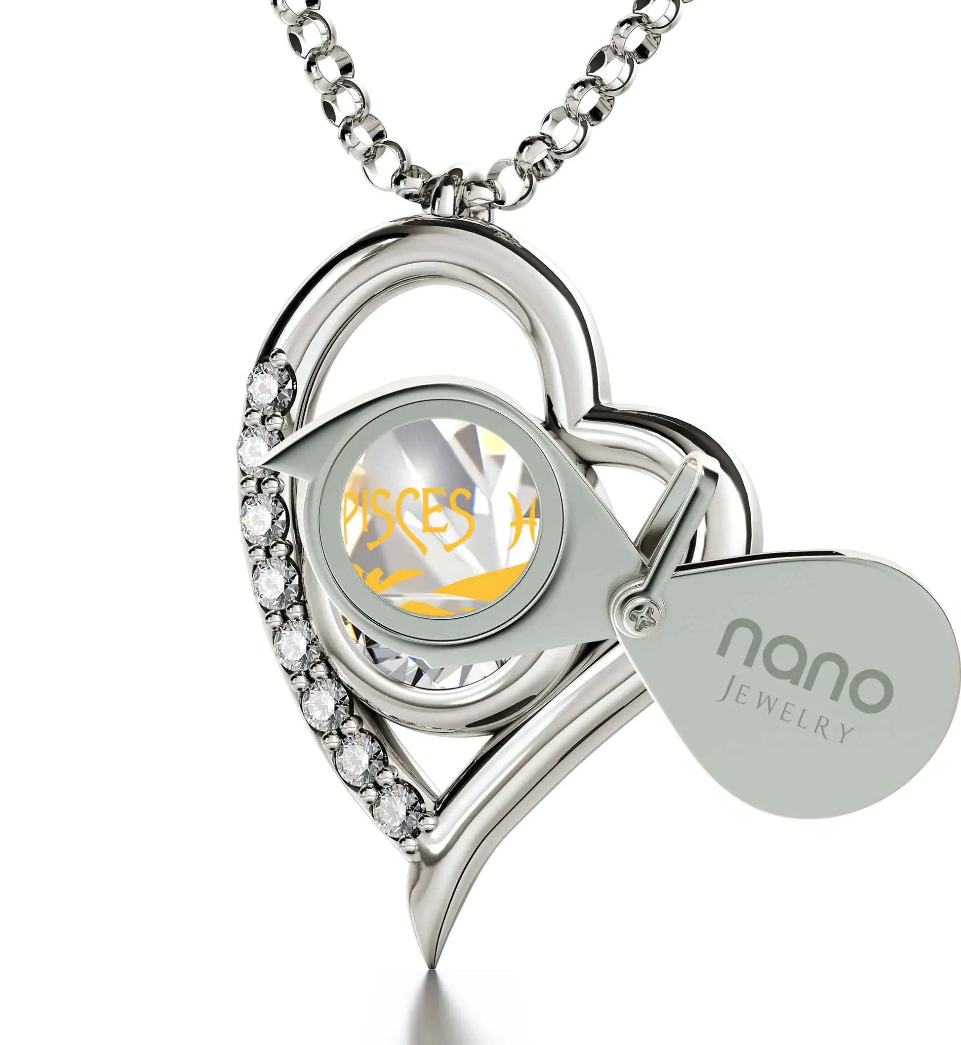 925 Sterling Silver Zodiac Heart Pendant Pisces Necklace 24k Gold Inscribed on Crystal
