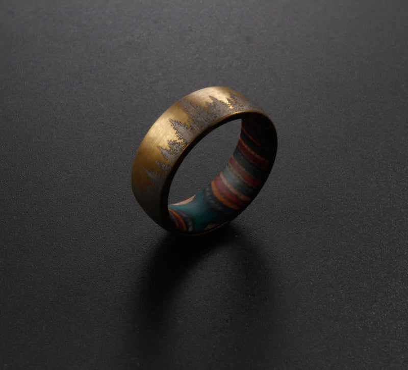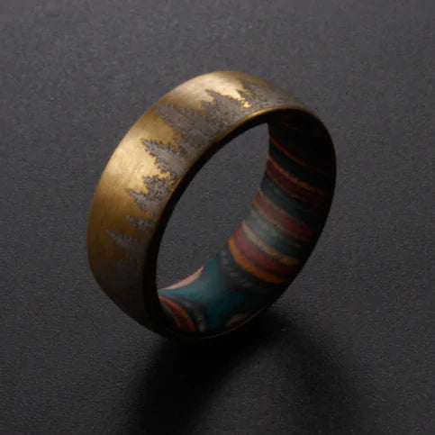 Bronze Etched Tree Line with Striped Wood Sleeve Tungsten Ring