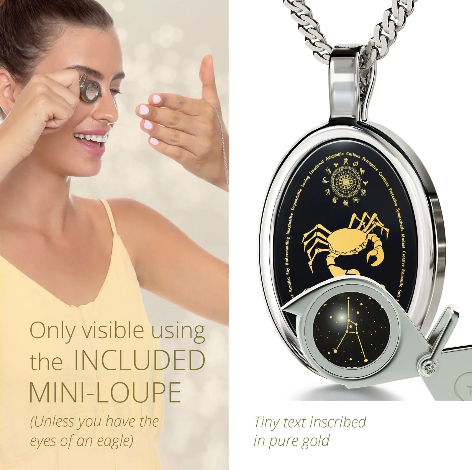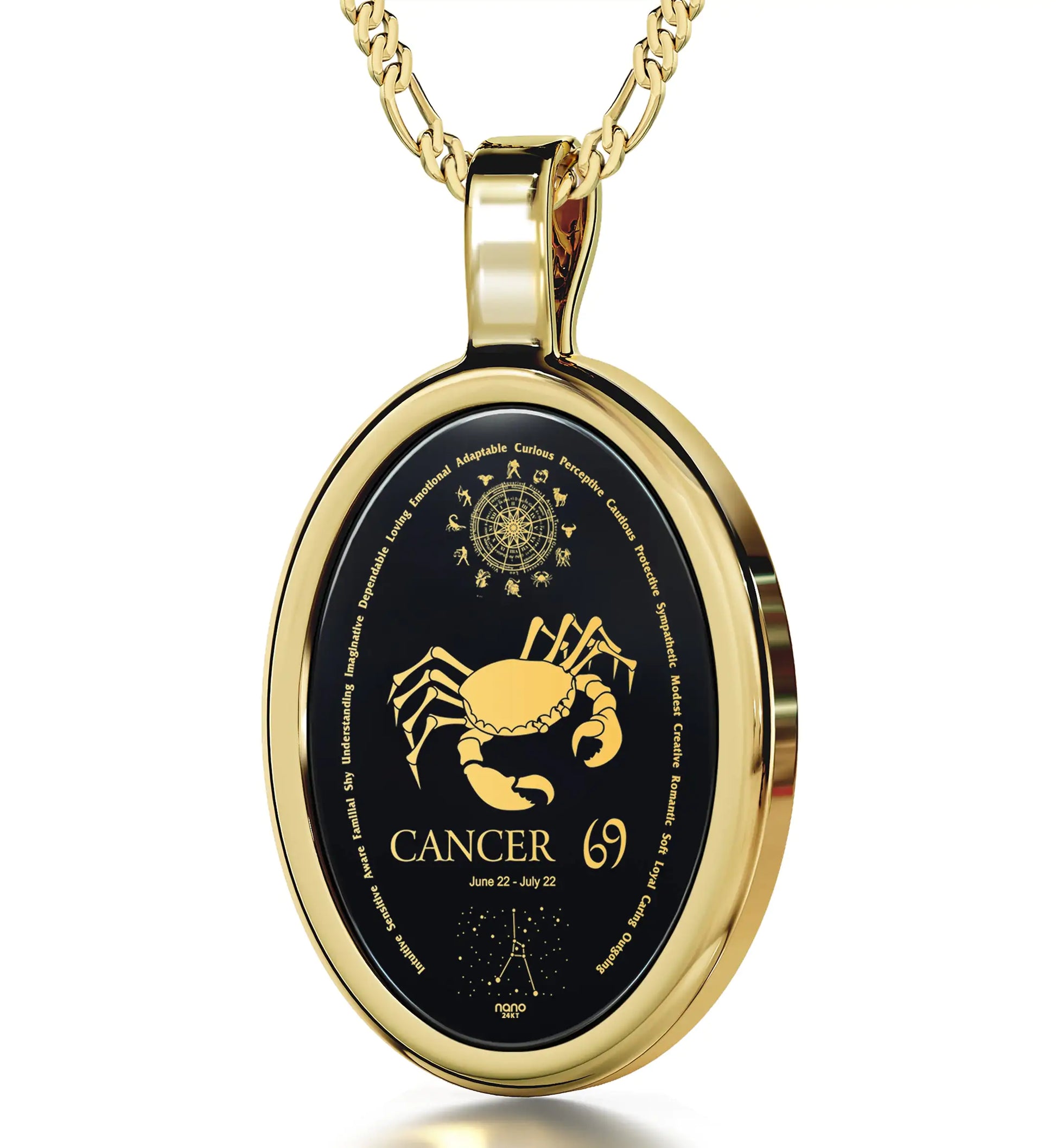 Experience the allure of the Onyx Cancer Zodiac Pendant, an exquisite work of art inscribed with the intricate image of Cancer, the crab, in radiant 24k gold. Delicately set within your chosen oval metal frame, this pendant beautifully captures the essence of Cancerians – creative, nurturing, and perceptive souls. Whether commemorating your birth month or gifting a horoscope enthusiast, this unique zodiac necklace showcases the full zodiac wheel, Cancer symbol, and constellation against the celestial sphere, accompanied by personality traits. A thoughtful birthday gift or an imaginative gesture for any woman – your wife, girlfriend, daughter, or best friend – this pendant stands as a symbol of your appreciation for their unique qualities.