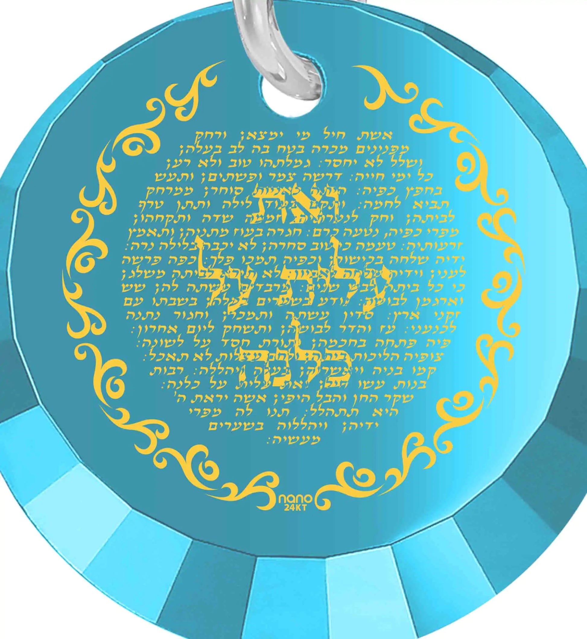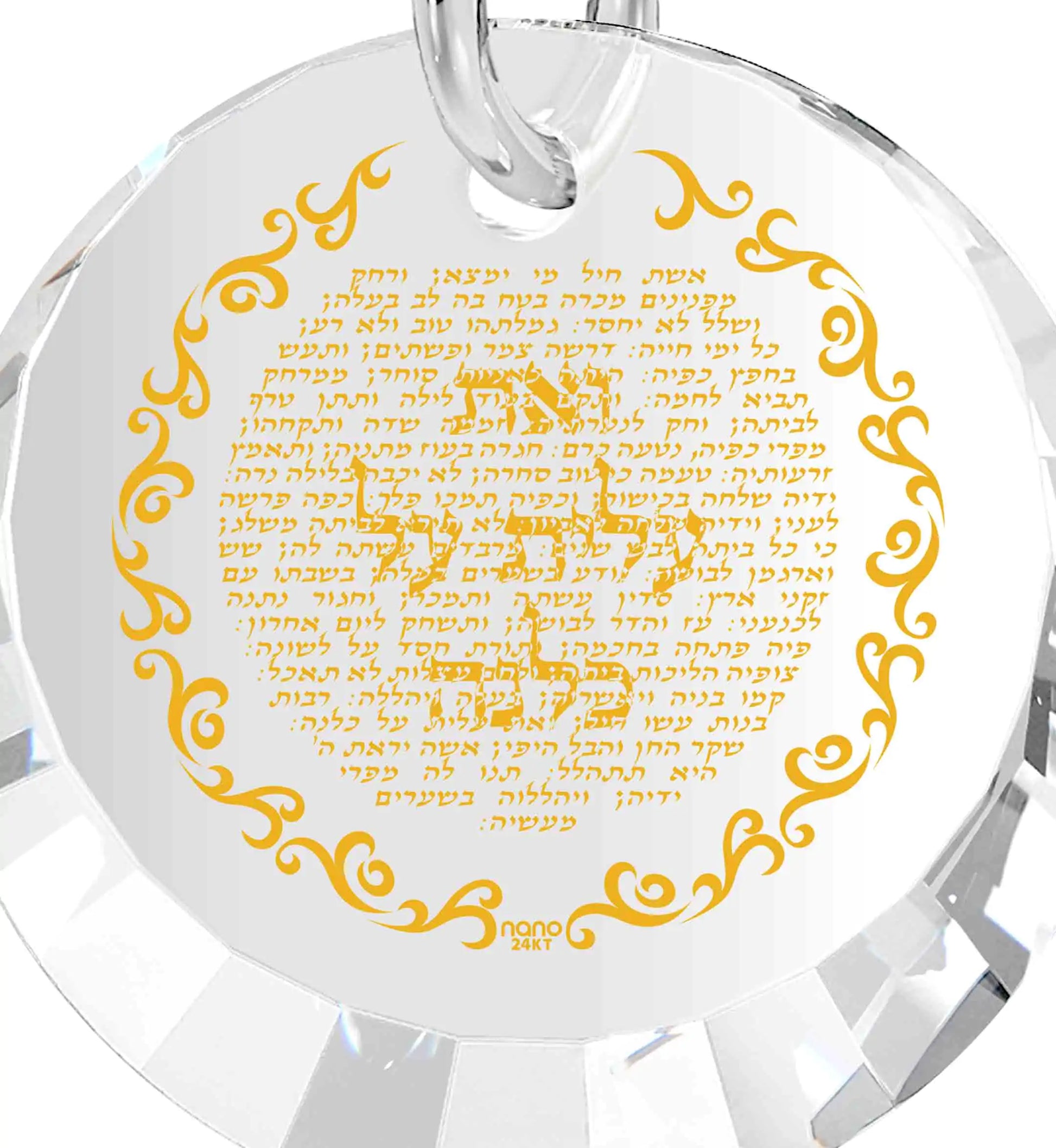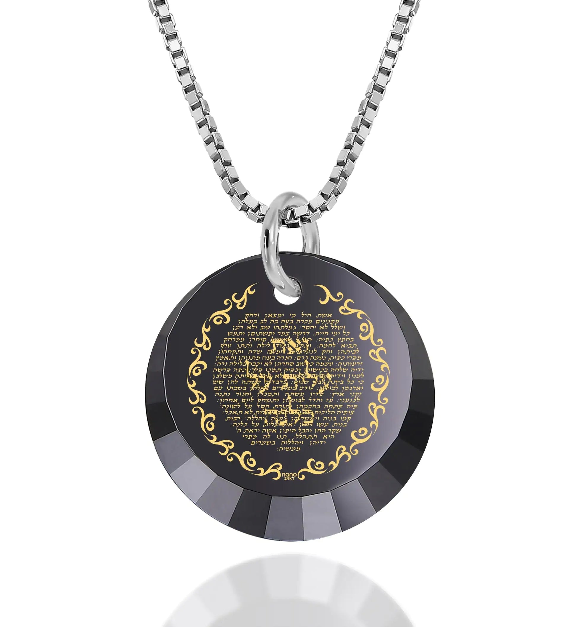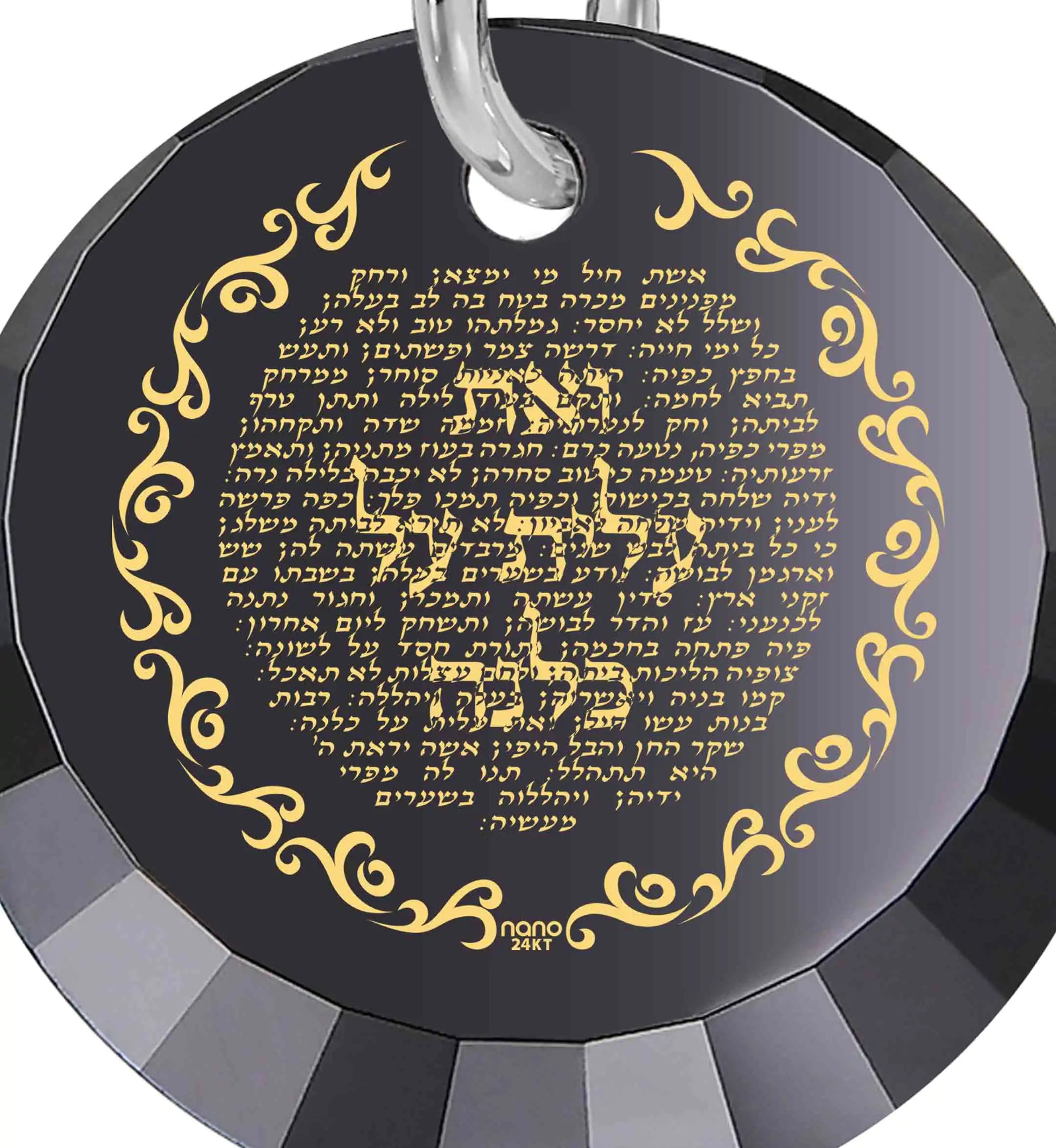 Experience the elegance of our Inspirational Eshet Chayil pendant, meticulously inscribed in 24k gold in Hebrew, featuring King Solomon's ode to women. This exquisite design graces a round cubic zirconia gemstone charm, gracefully suspended from a 925 sterling silver chain. Our symbolic Jewish jewelry showcases ingenuity, weaving a meaningful message. The pendant embodies the Proverbs' poem, praising wisdom and powerful women, a traditional prelude to Kiddush welcoming Shabbat. The words 've at alit al kulanu', translating to 'but you have surpassed them all,' resonate with the achieved valor of the praised woman. Wear this necklace as a personal emblem of dedication, strength, and wisdom. Gift it to the woman of valor in your life to celebrate milestones such as becoming a wife, mother, grandmother, or your daughter's Bat Mitzvah. This Hebrew Woman of Valor necklace is a unique and thoughtful gift idea for Hannukah, Pesach, your anniversary, or any significant occasion, reflecting the inspiration she embodies for all.