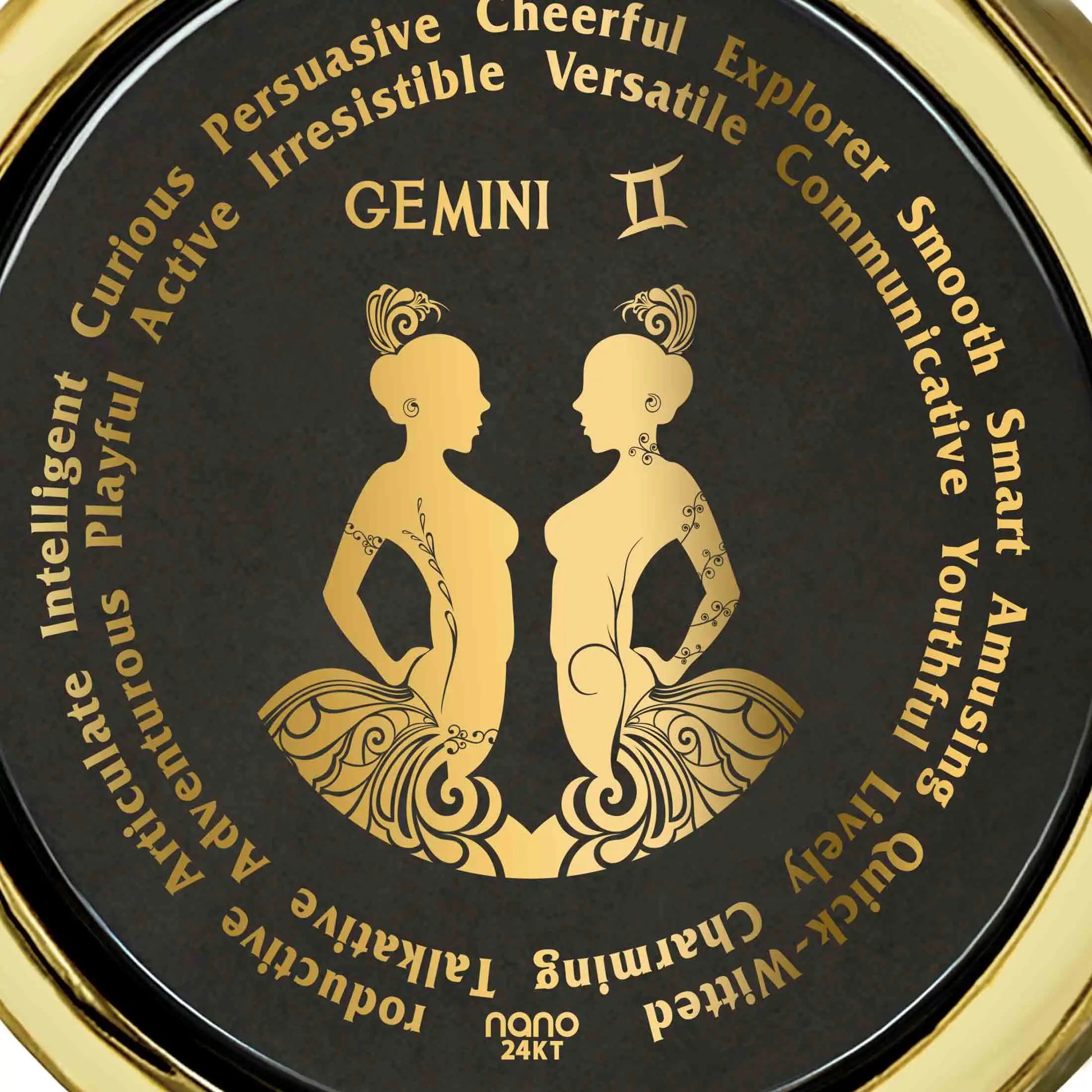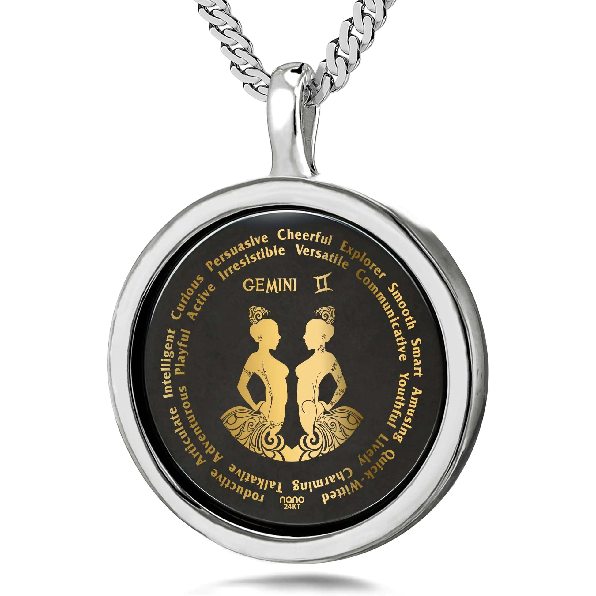 - Elegant Gemini necklace inscribed in 24k gold with twin star sign surrounded by personality characteristics in intricate detail