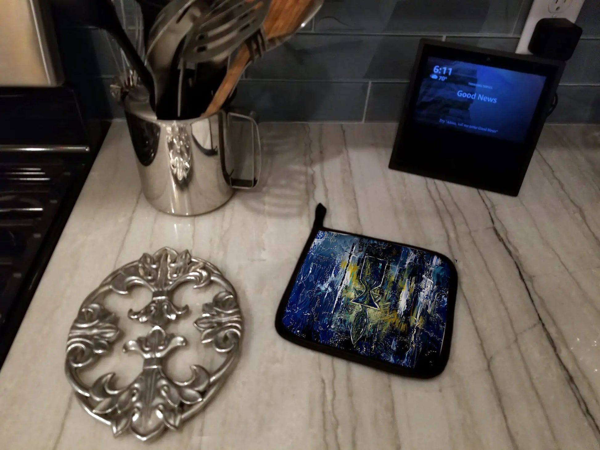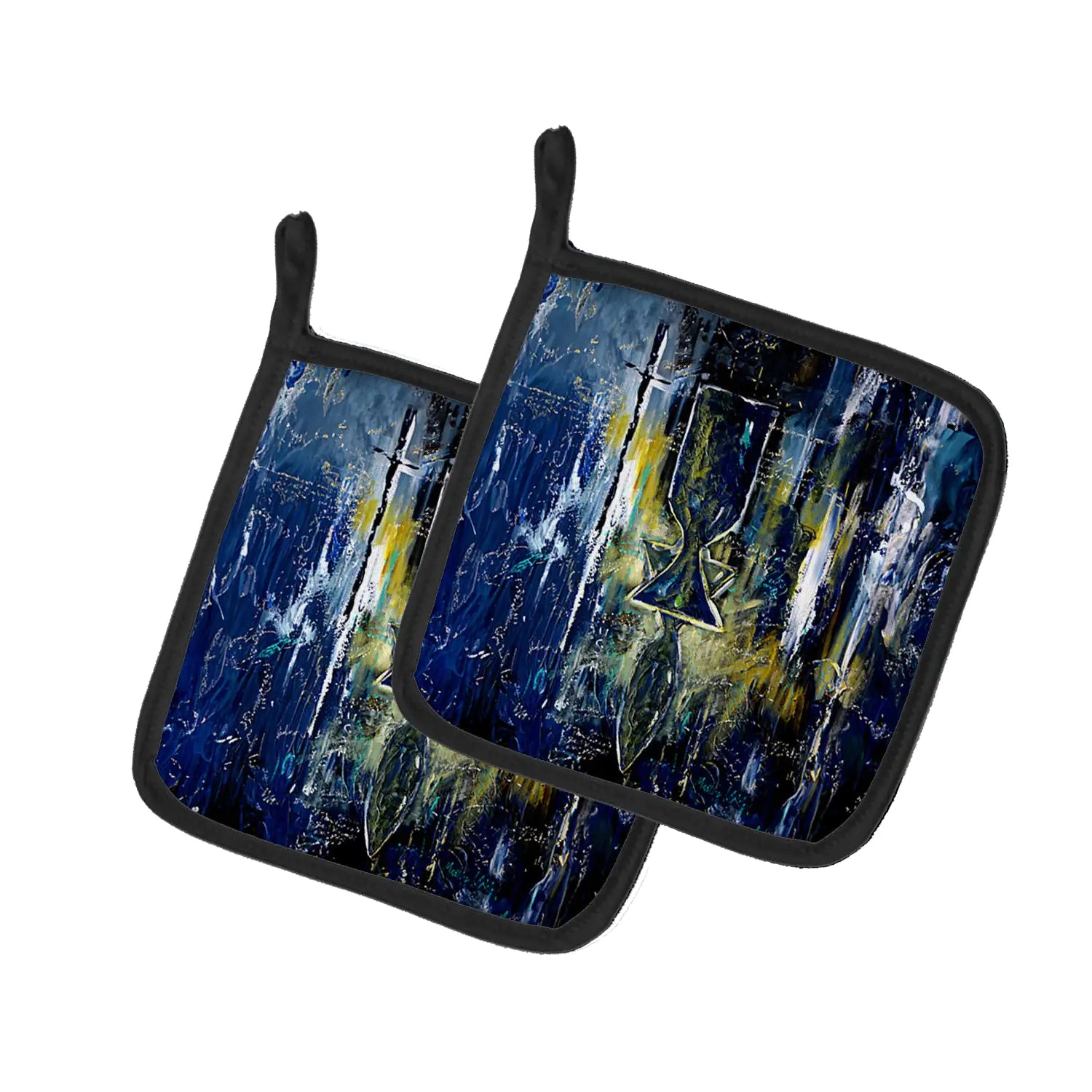 A Pair of Pot Holders to match your kitchen decor. Made in the USA these are thick and functional. Full color artwork decorates the front polyester fabric of the hot pad and accented by a black trim. Use these at as a trivet for your Thanksgiving or Christmas tablescape. Filled with insulated fabric and quilted for durability. These colorful pot holders will make a great gift for your favorite home cook or executive chef. Each pot holder measures approximately 7 1/2 inches by 7 1/2 inches. A hanging tab is included.