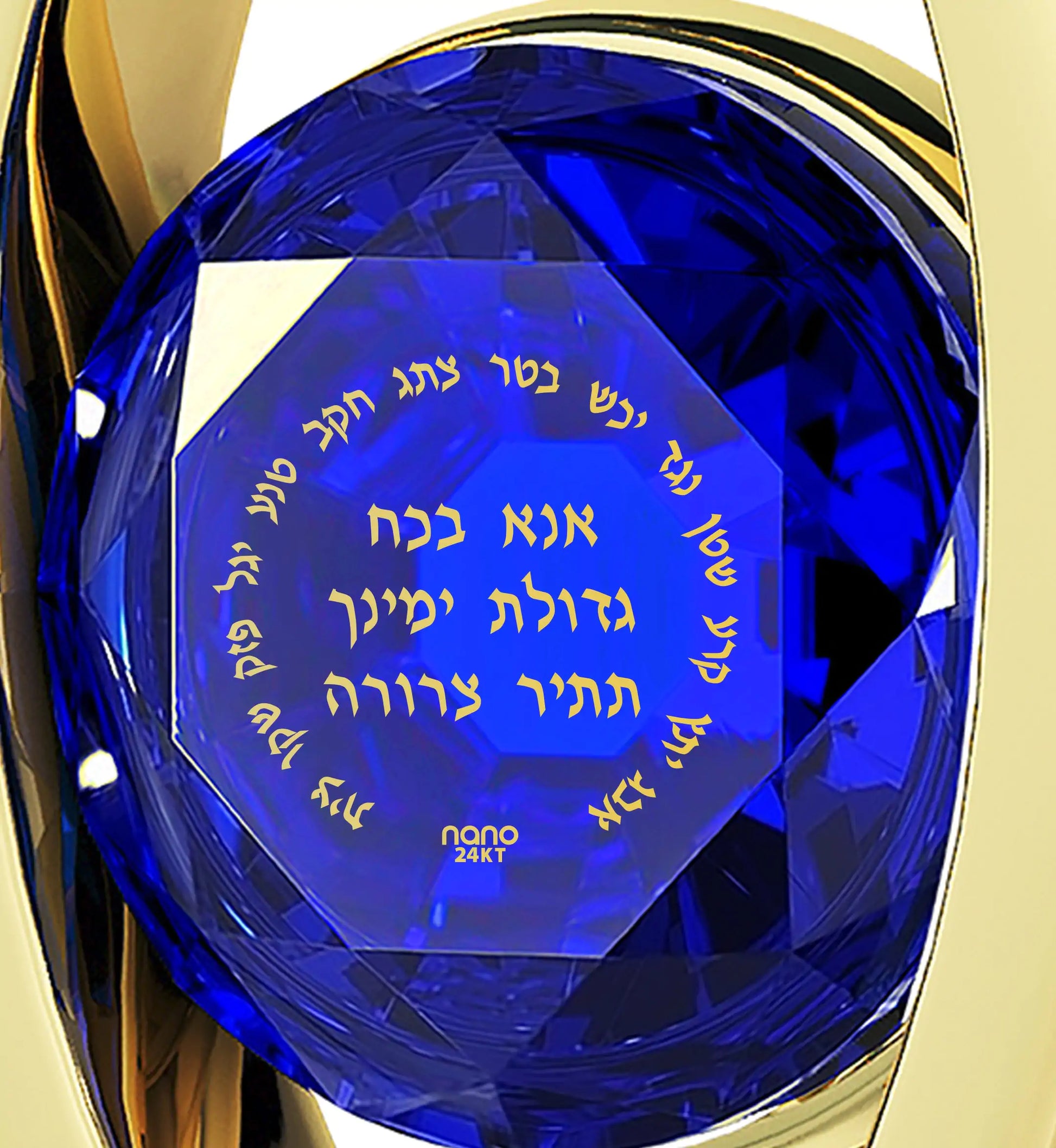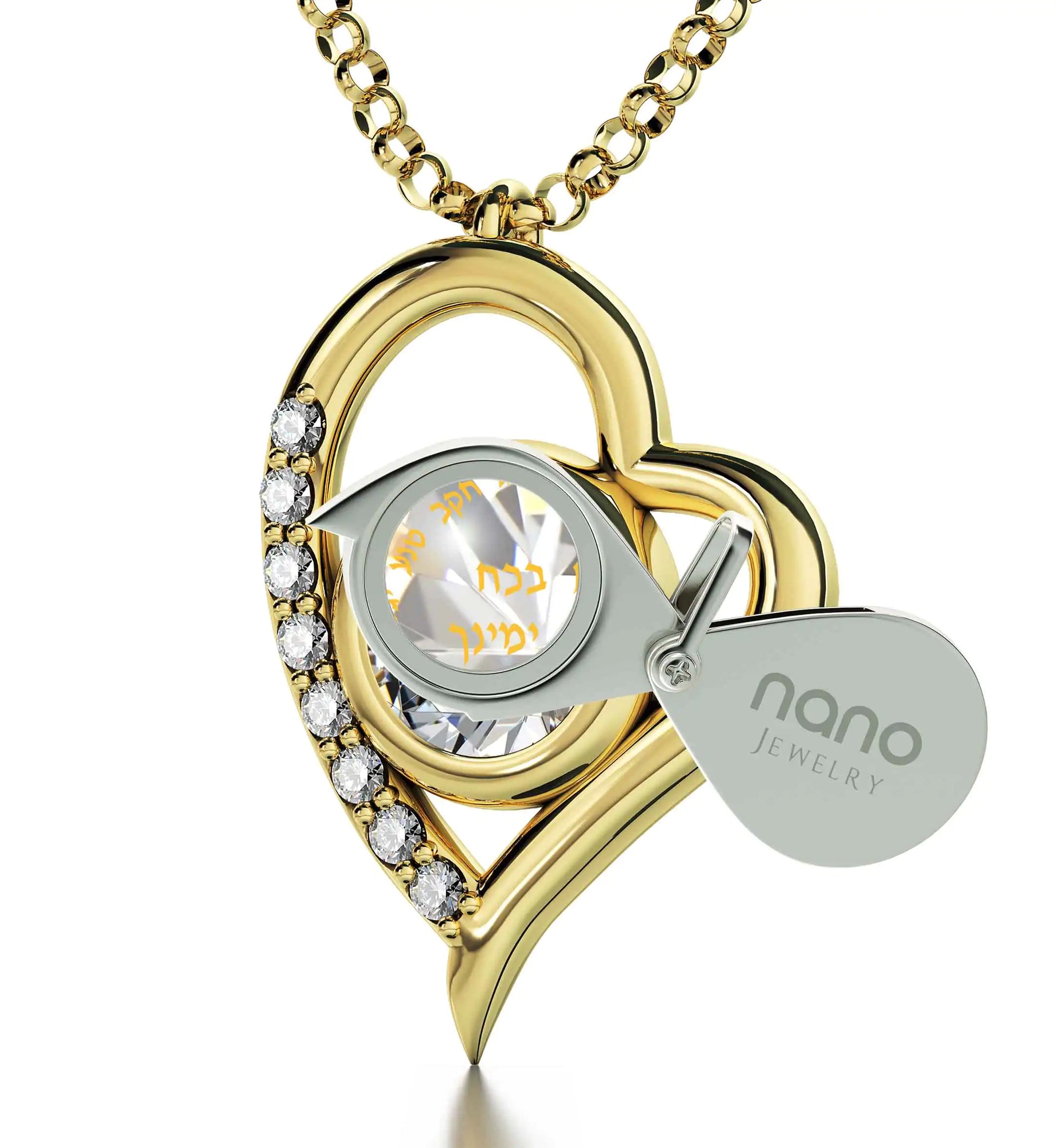 A brilliant-cut crystal Swarovski inscribed in 24k gold with Ana Bekoach, one of the most powerful prayers and spiritual blessings recited by Jewish people every day and before an important occasion in order to elevate beyond the five senses, set in a luxurious heart pendant embellished with 8 cubic zirconia stones.