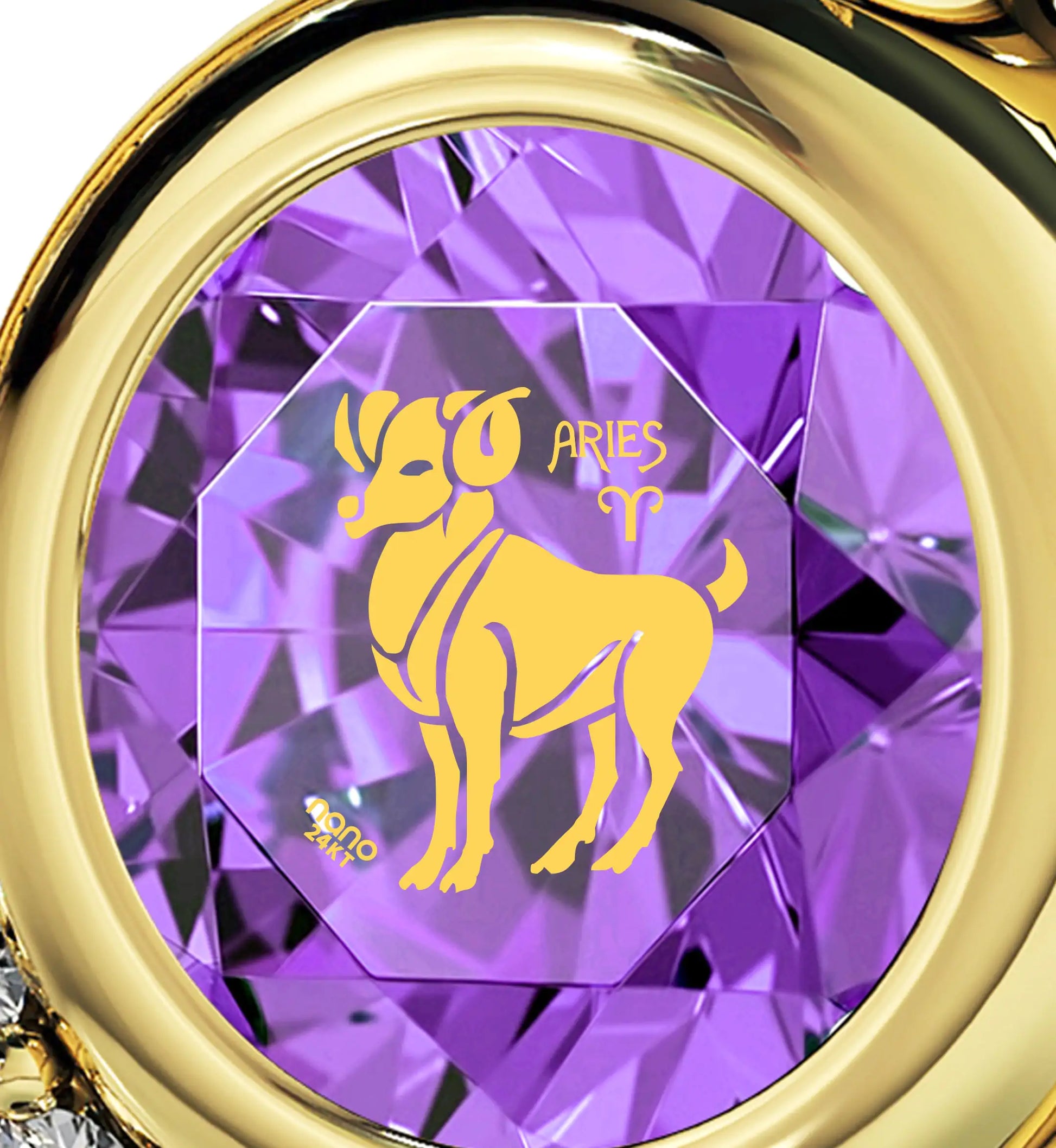 A brilliant round cut crystal Swarovski inscribed in 24k gold with the image of Aries, the ram and star sign symbol, in 24k gold, set in a luxurious gold plated silver heart pendant, embellished with 8 cubic zirconia gemstones.