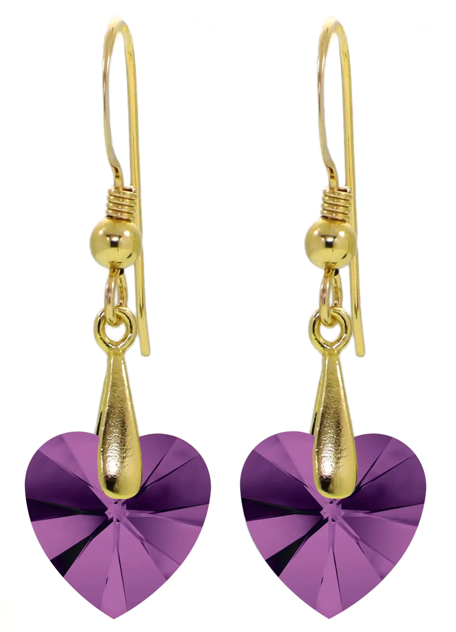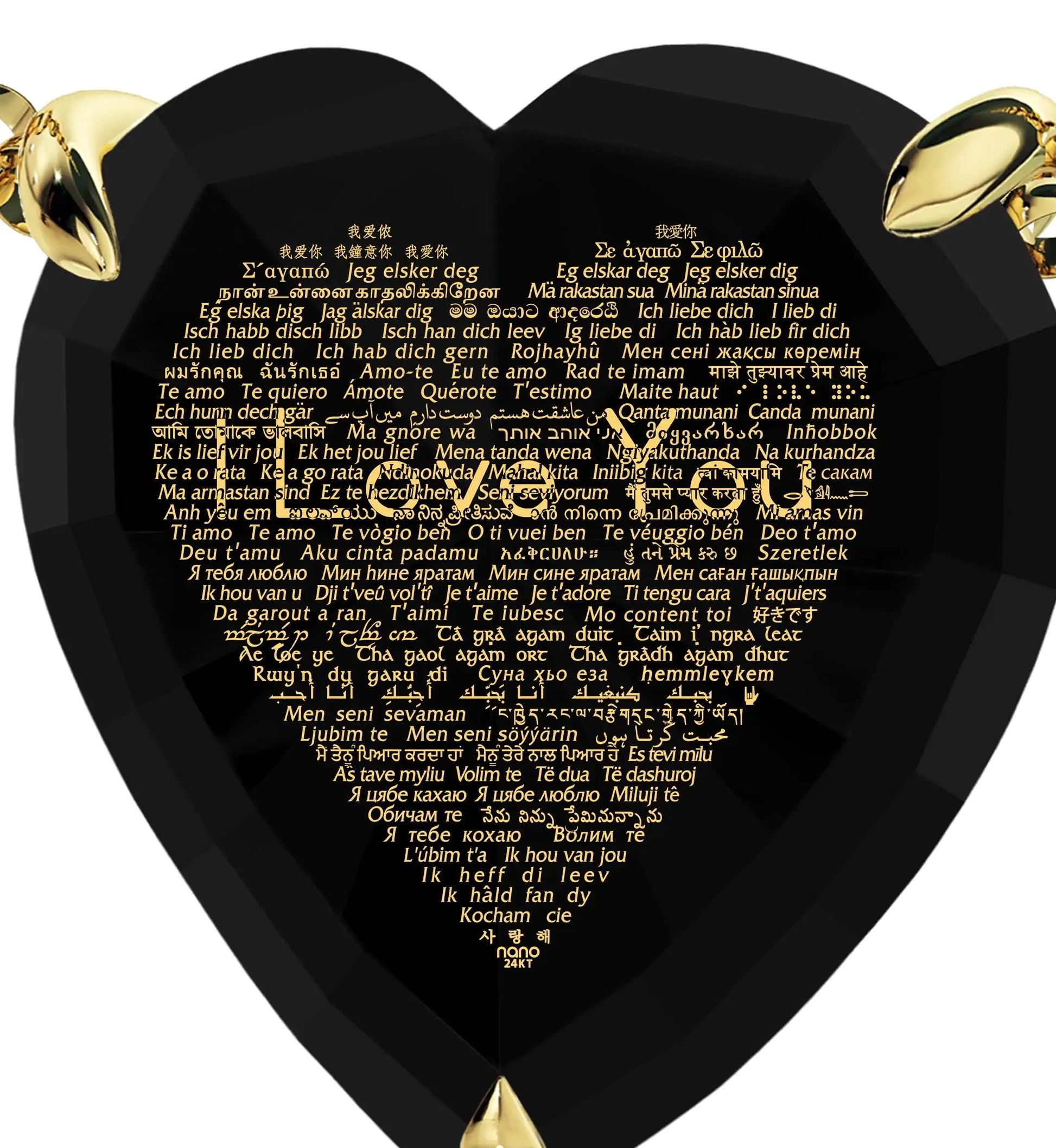 Radiate romance with this beautifully crafted cubic zirconia heart pendant inscribed with "I love you" in 120 different languages in 24k gold, accompanied by crystal Swarovski heart earrings.