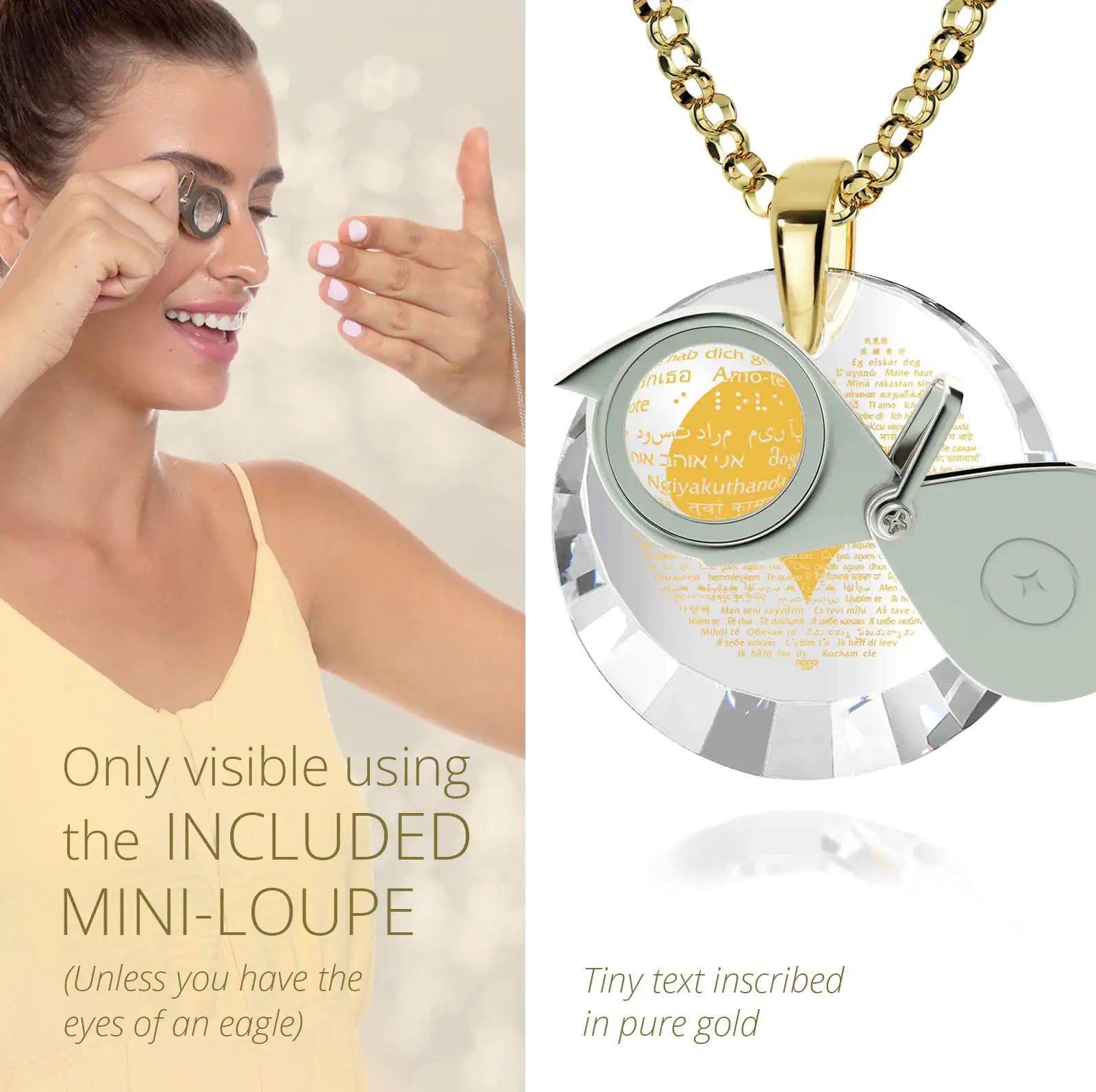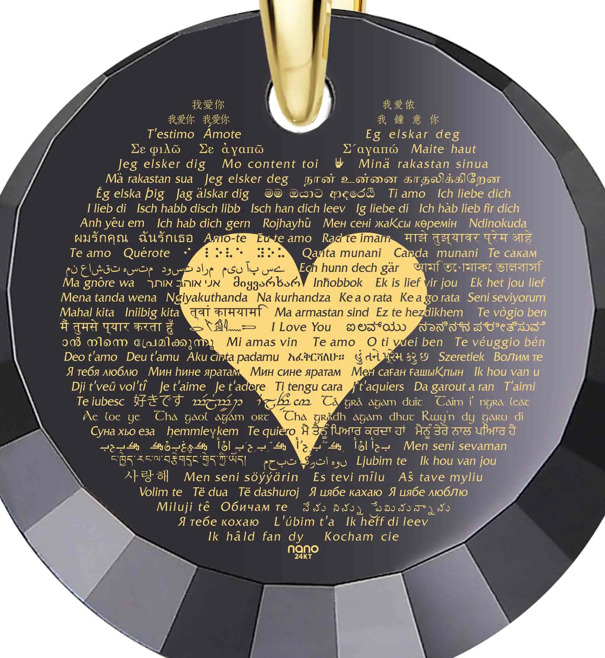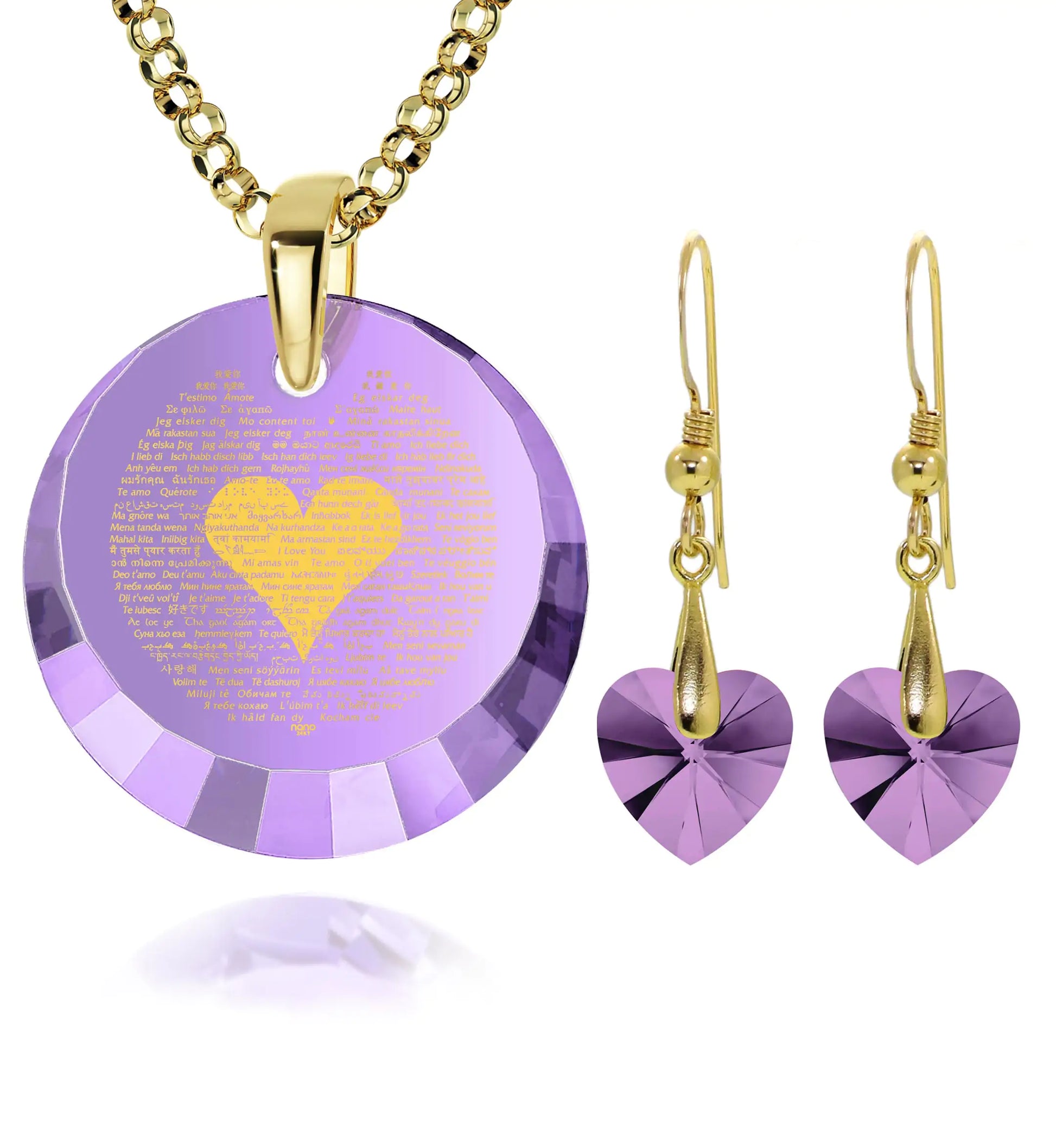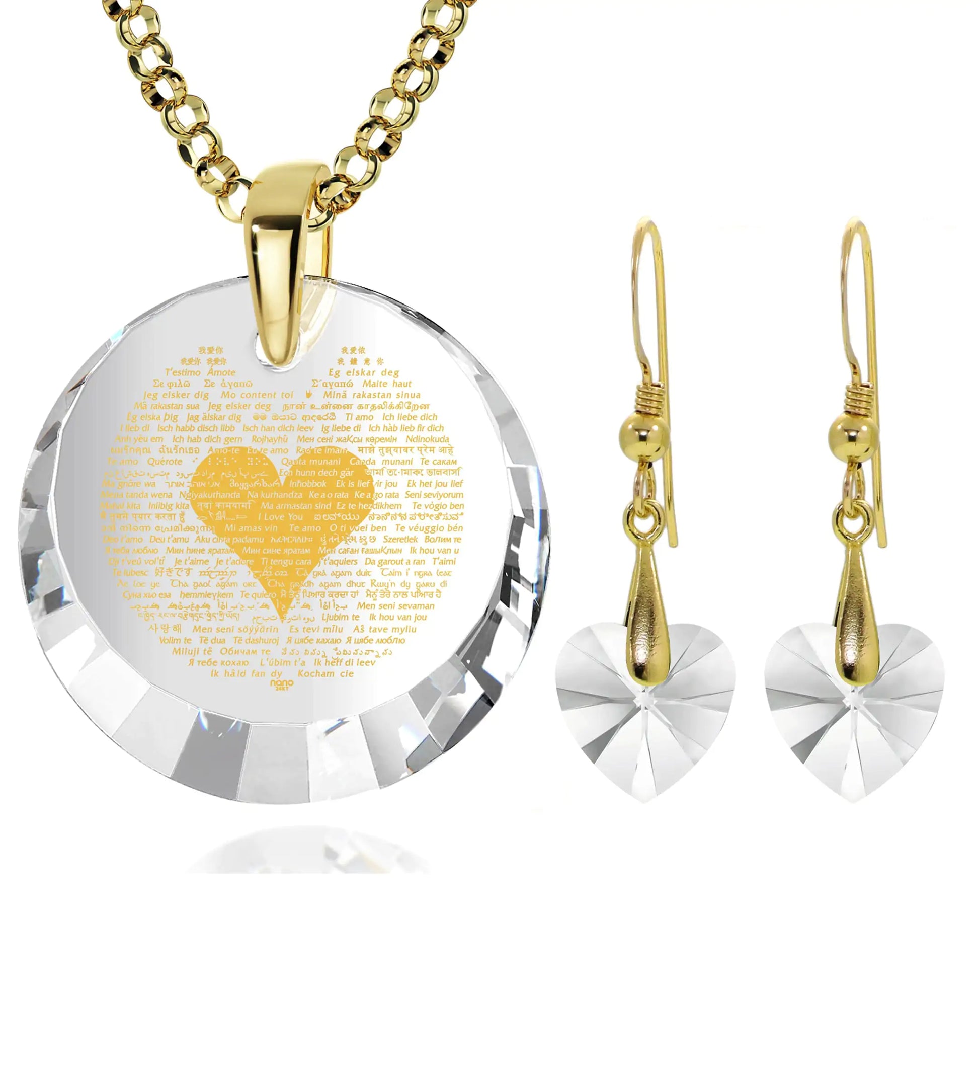 A sparkling round cubic zirconia gemstone pendant intricately inscribed with "I love you" in 120 different languages in 24k gold, set in a gold plated silver pinch bail and complimented by beautiful crystal Swarovski heart earrings.