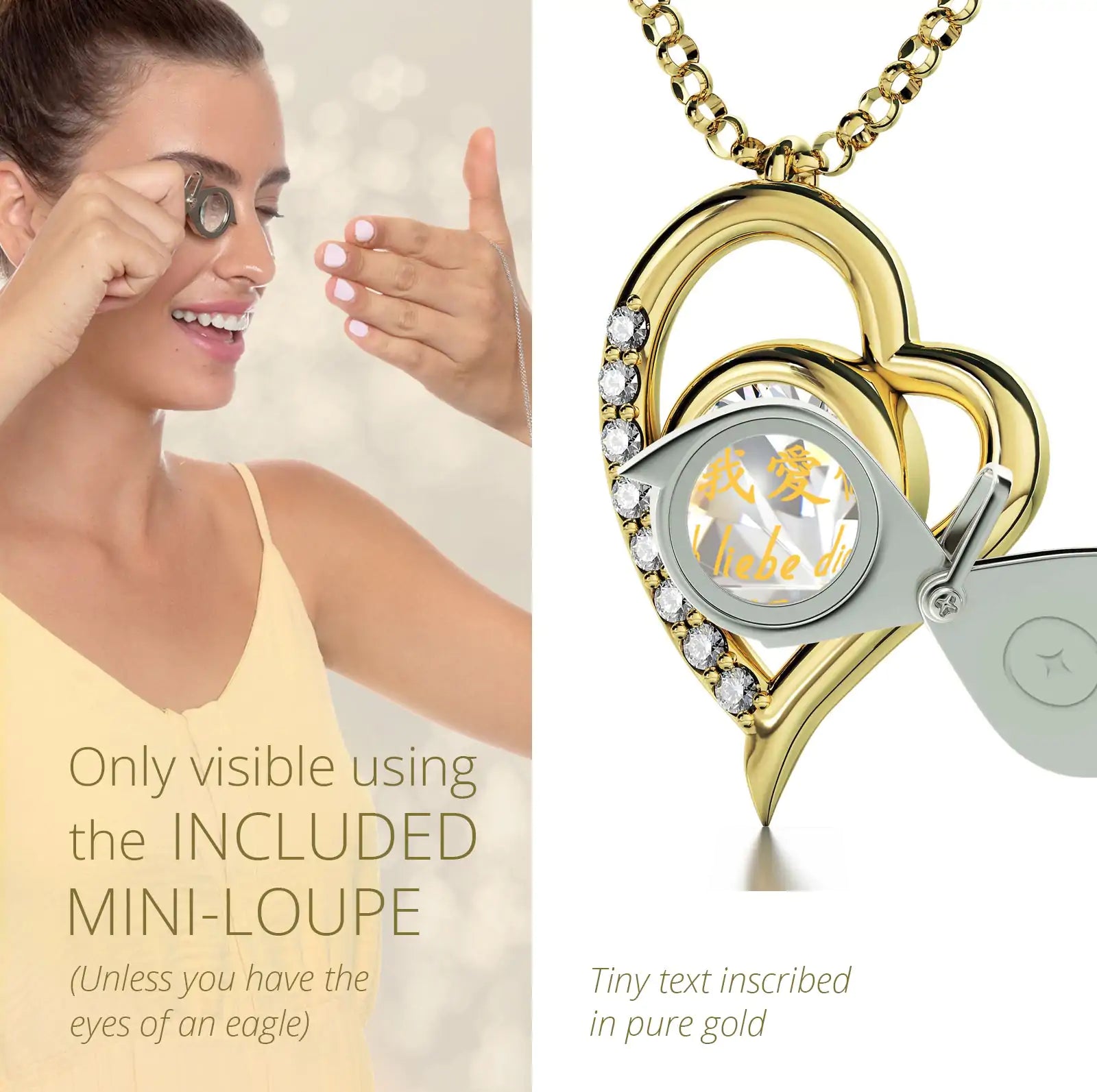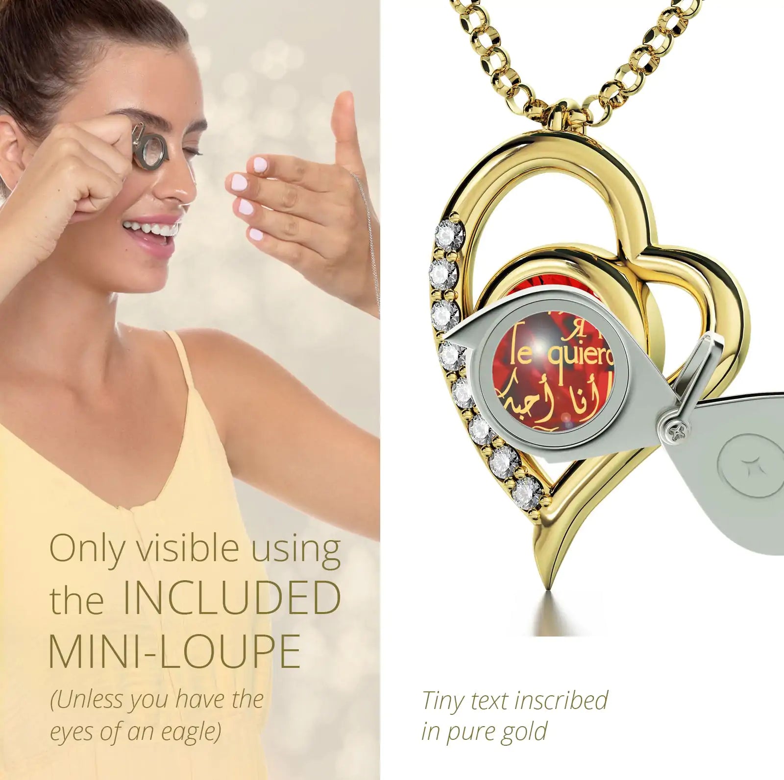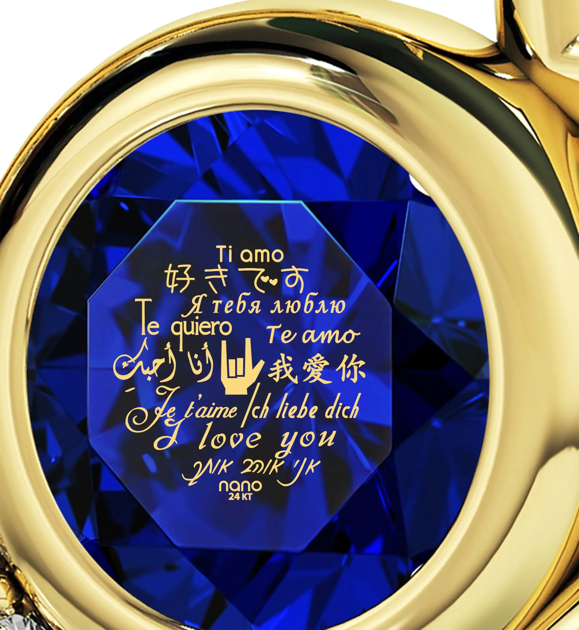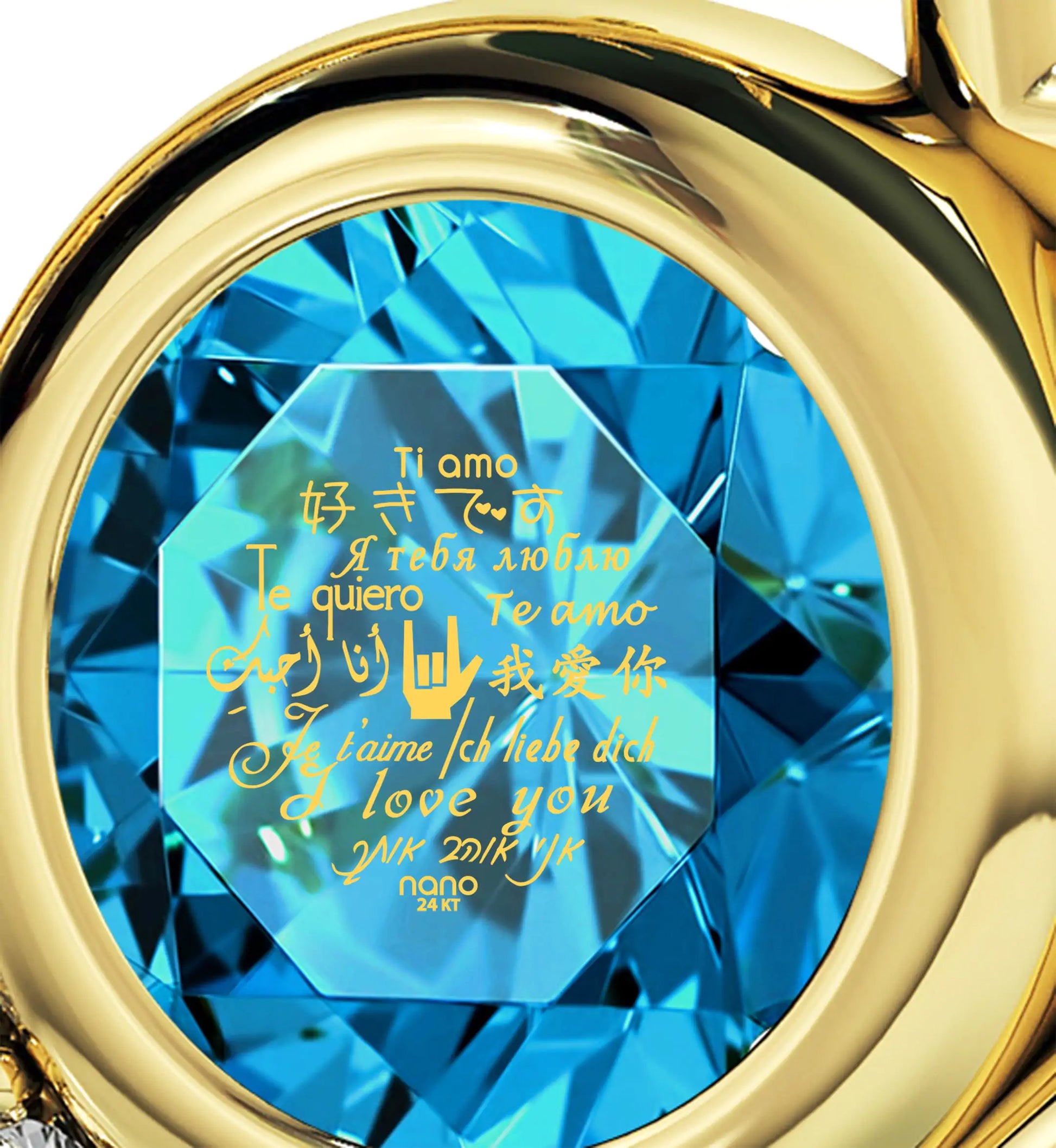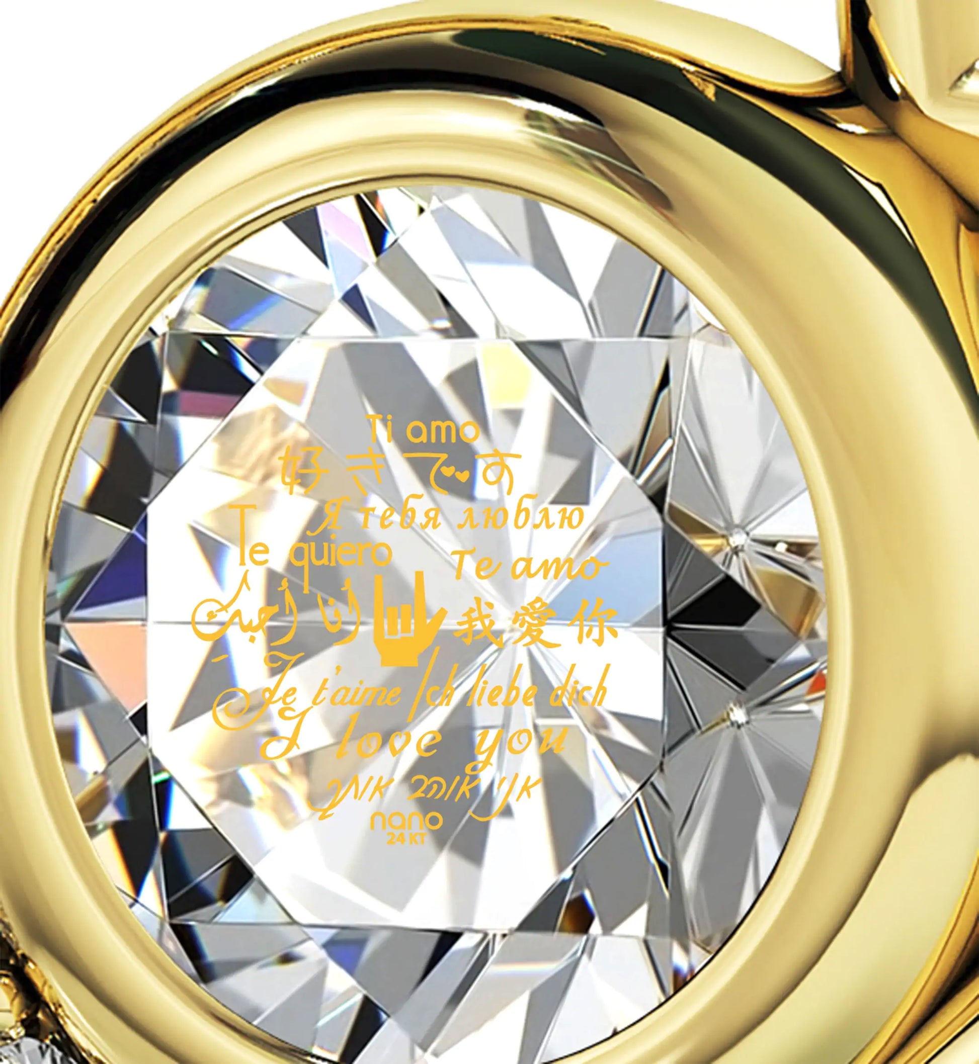 A brilliant-cut crystal Swarovski inscribed in 24k gold with the words for "I love you" in 12 different languages, set in a luxurious heart pendant embellished with 8 cubic zirconia stones.