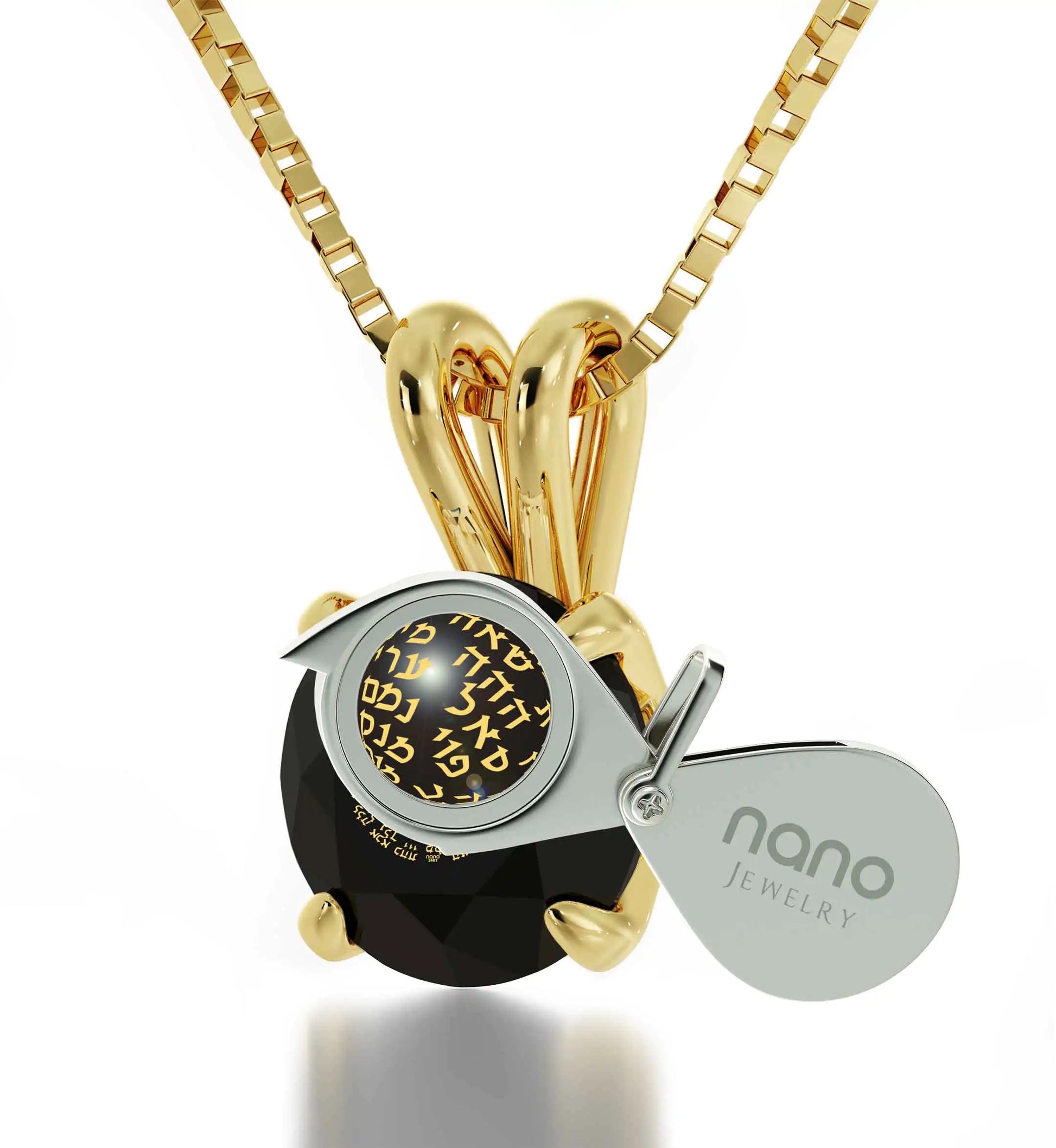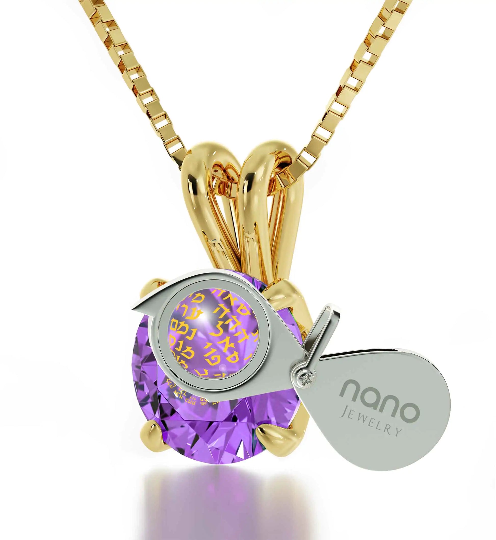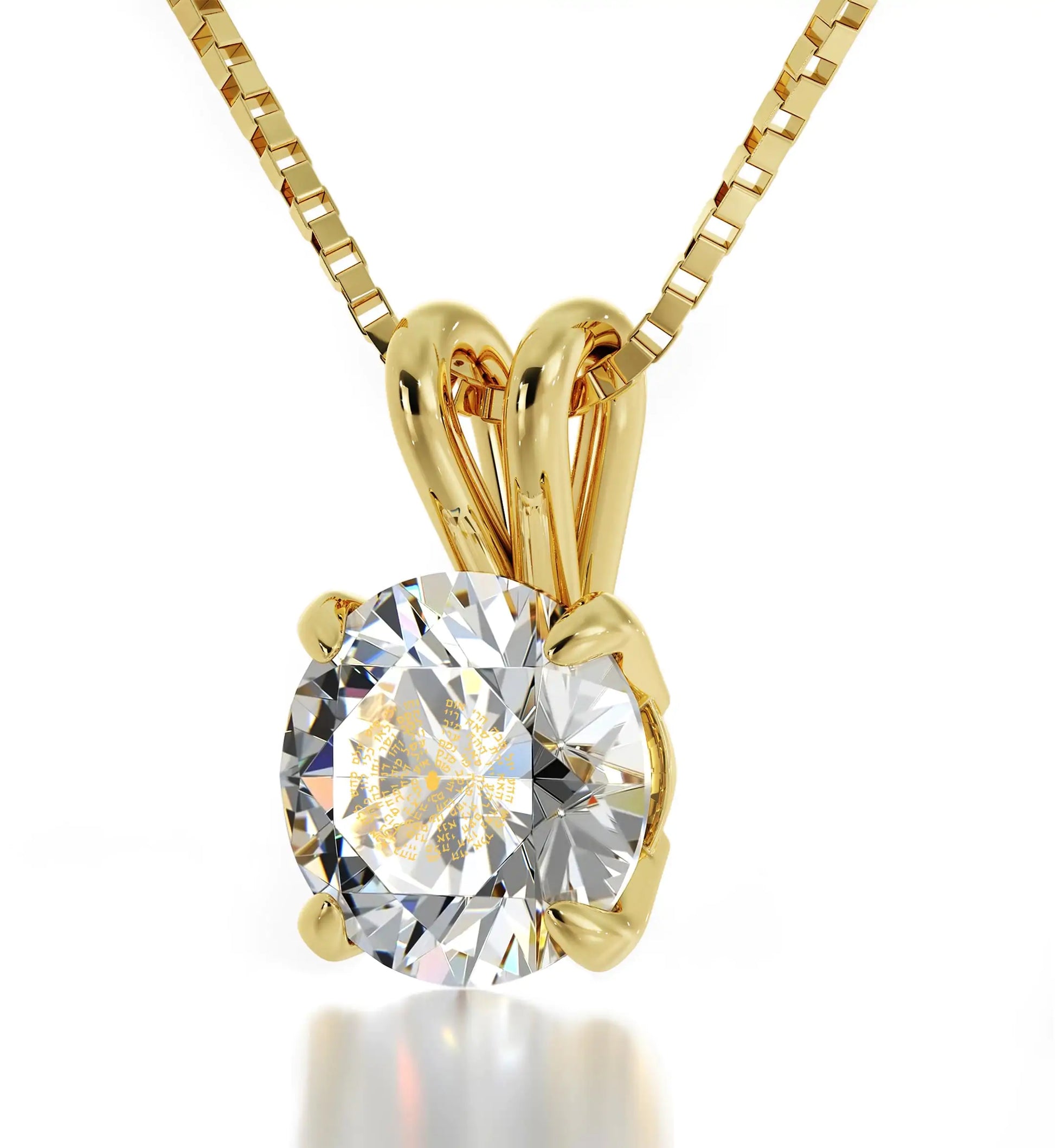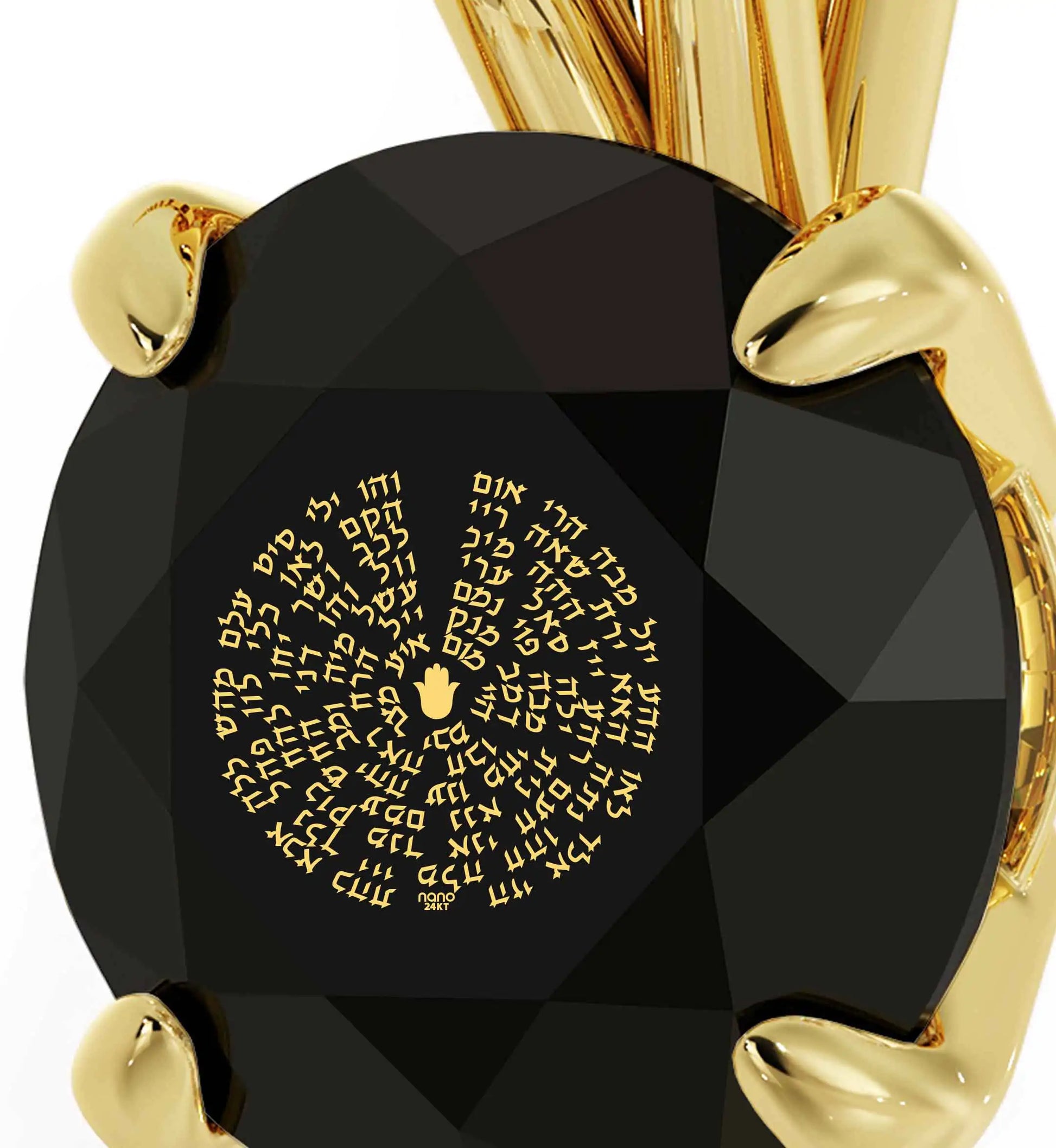 A brilliant-cut crystal inscribed in 24k gold with the sacred 72 Names of G_d, which in Kabbalah are spiritual blessings with remarkable energy that enlighten and awaken the human soul.