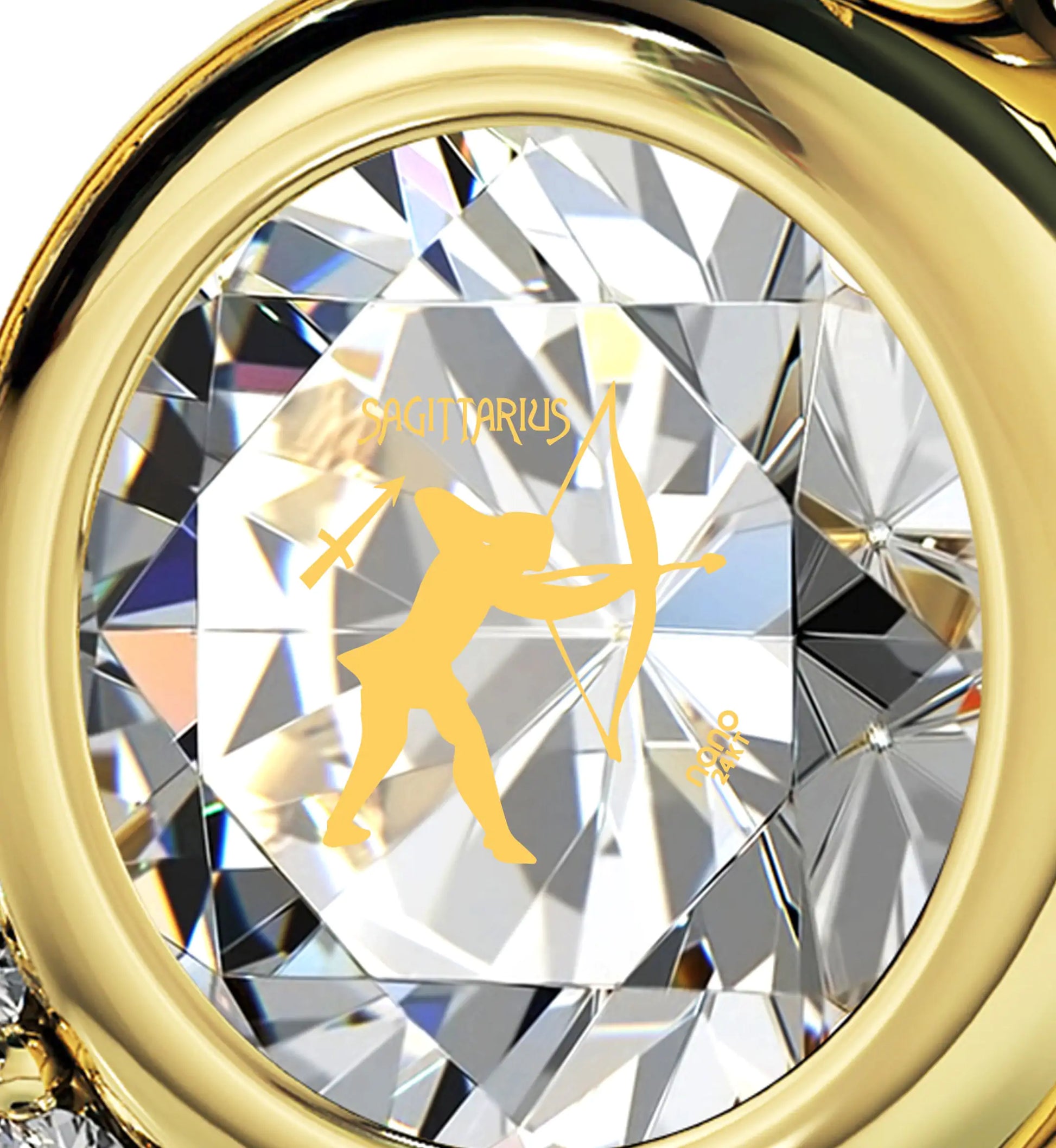 A brilliant round cut crystal Swarovski inscribed in 24k gold with the image of Sagittarius, the archer and star sign symbol, in 24k gold, set in a luxurious gold plated silver heart pendant, embellished with 8 cubic zirconia gemstones.