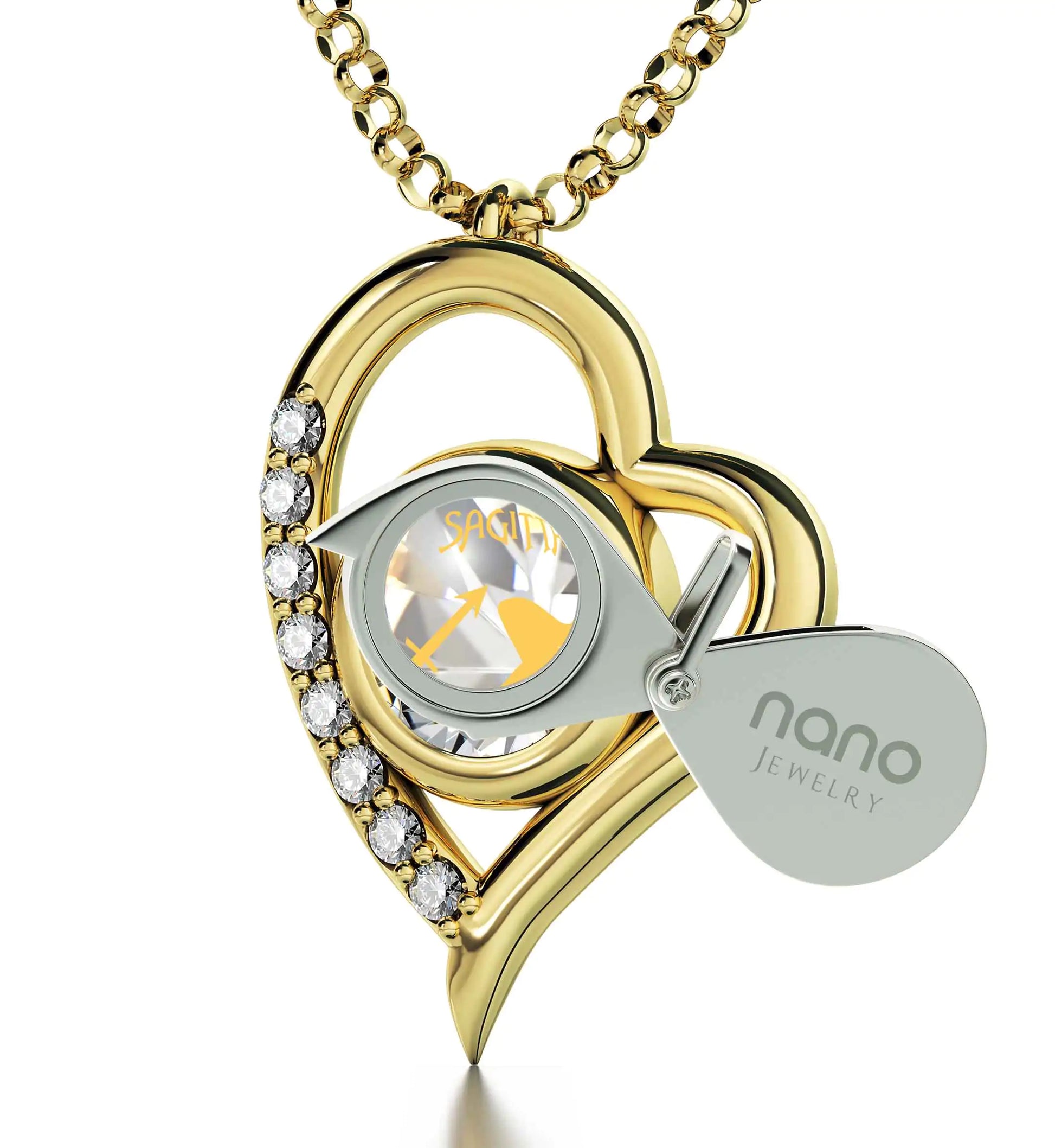 Gold Plated Silver Sagittarius Necklace Zodiac Heart Pendant 24k Gold Inscribed on Crystal