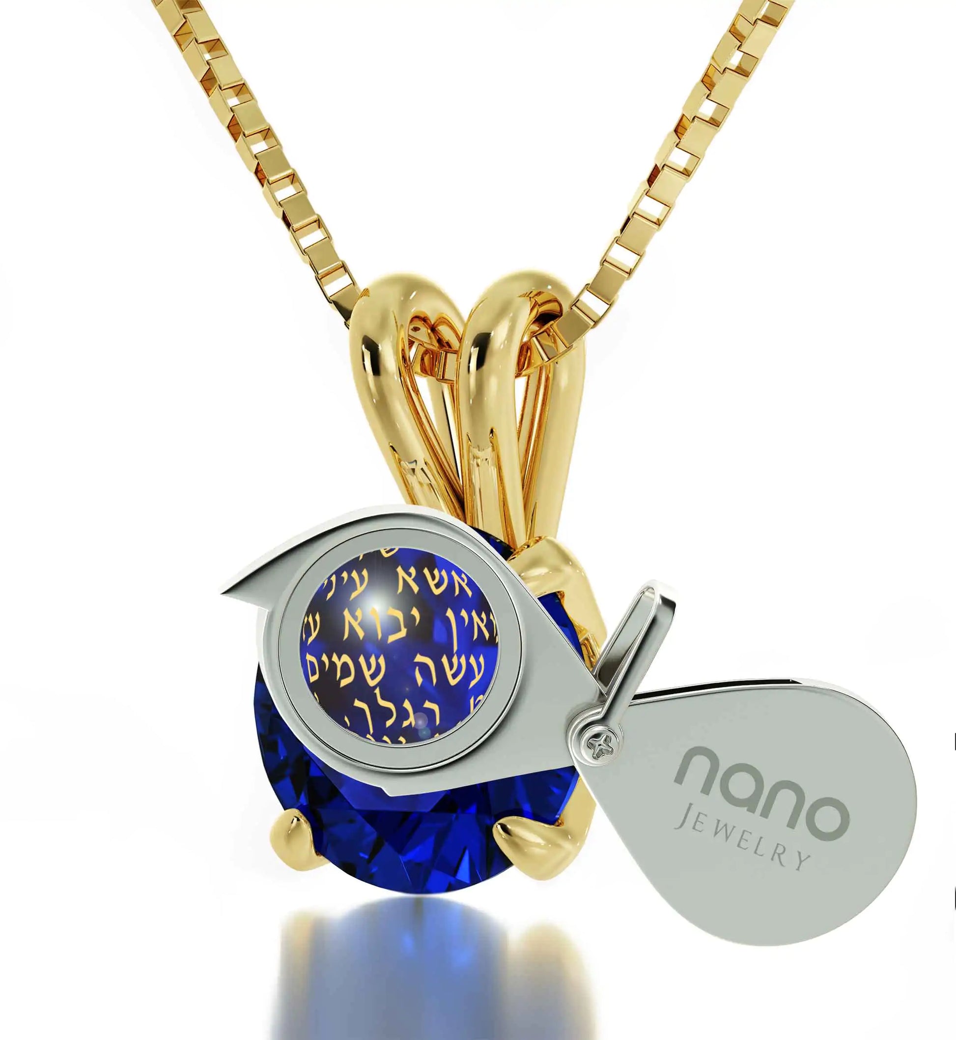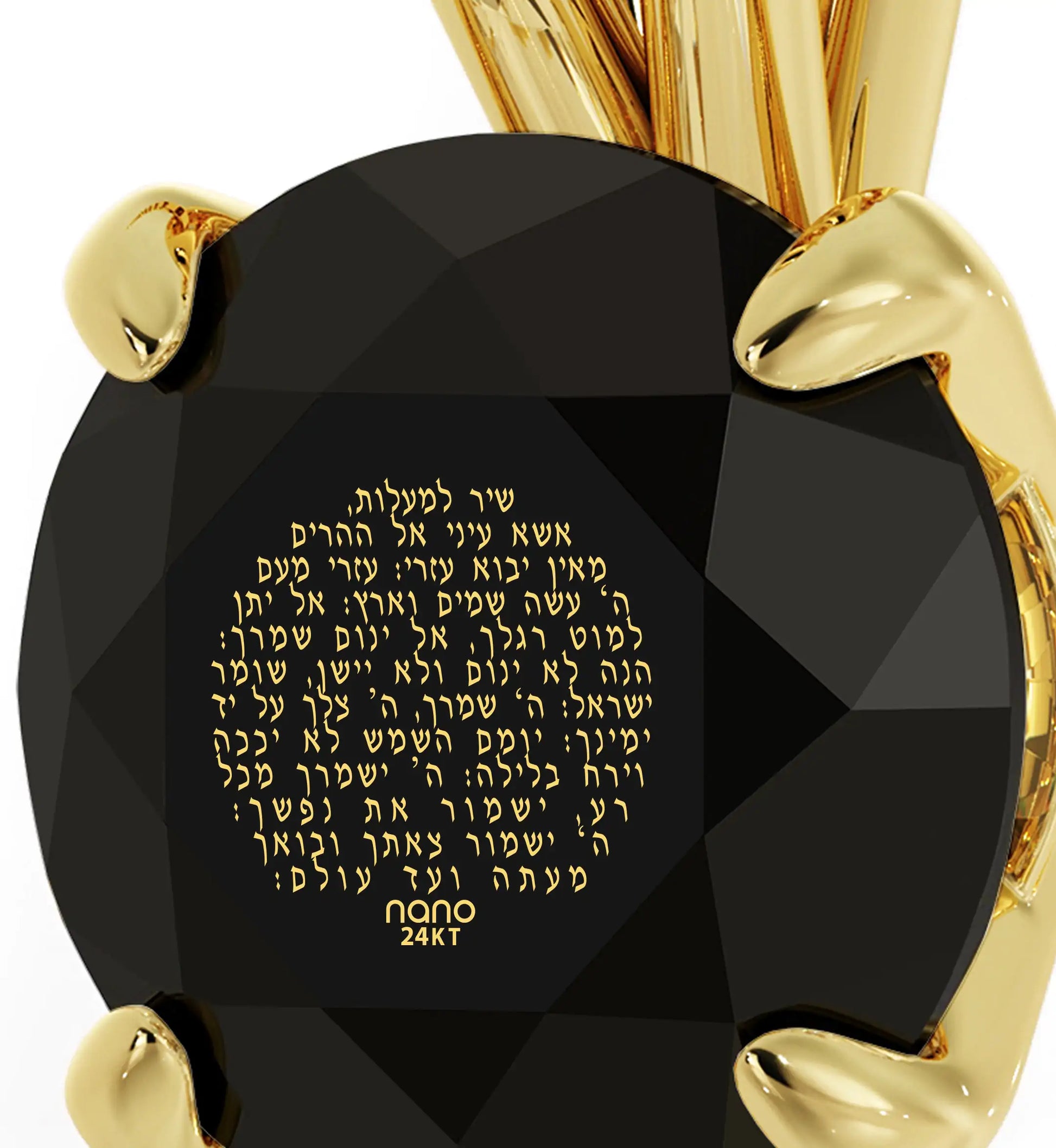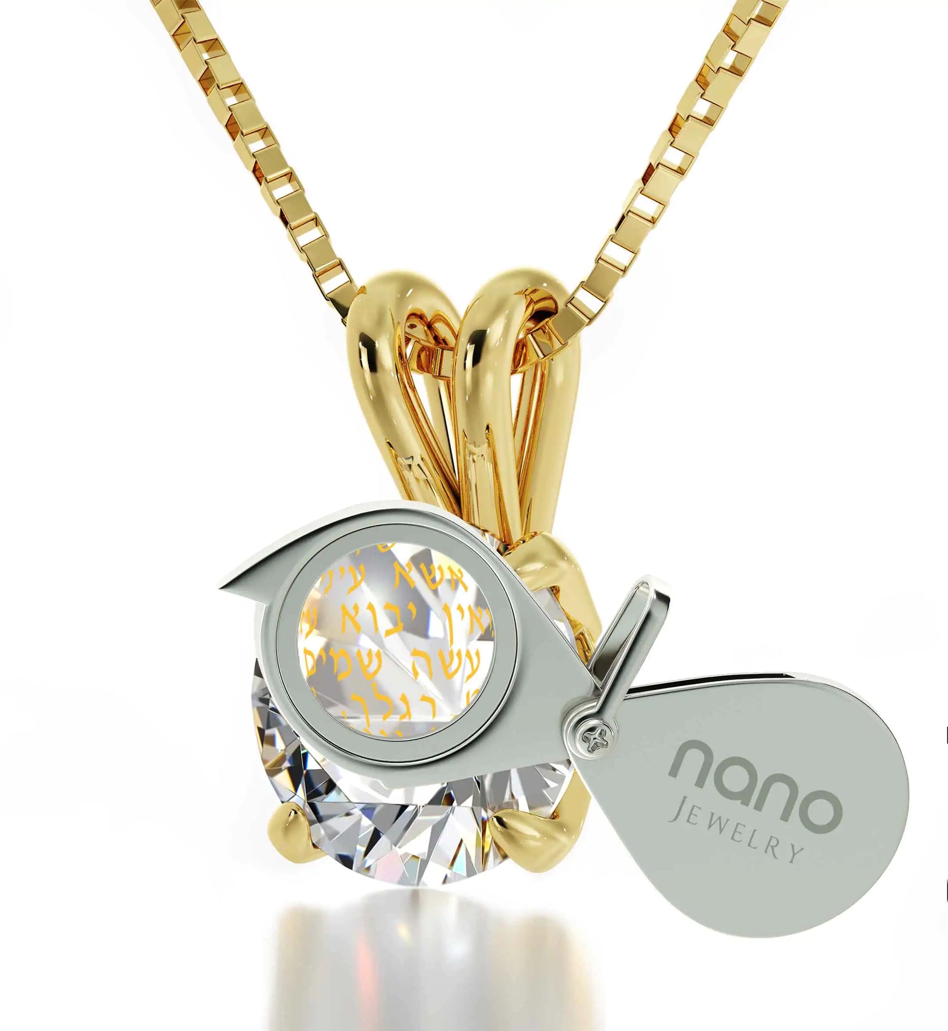 A brilliant-cut crystal Swarovski inscribed in 24k gold in Hebrew with Shir Lama’a lot, (A Song of Ascents), Psalm 121, the most reflective Jewish prayer sung as an expression of hope and protection.