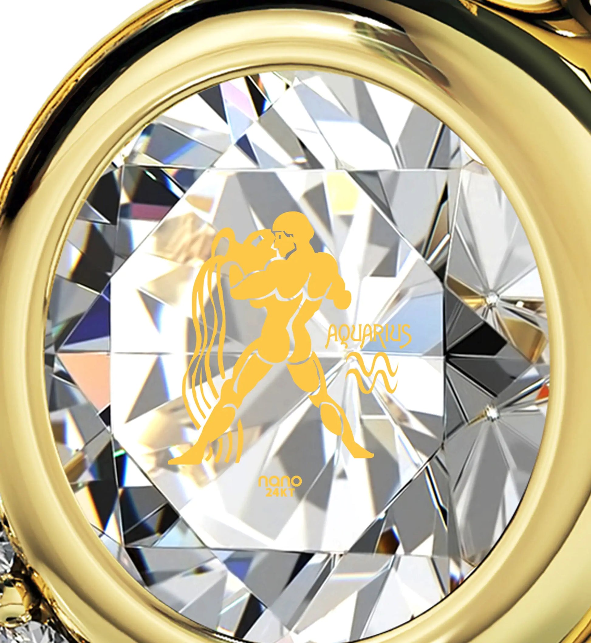 A brilliant round cut crystal Swarovski inscribed in 24k gold with the image of Aquarius, the water-bearer and star sign symbol, in 24k gold, set in a luxurious gold plated silver heart pendant, embellished with 8 cubic zirconia gemstones.