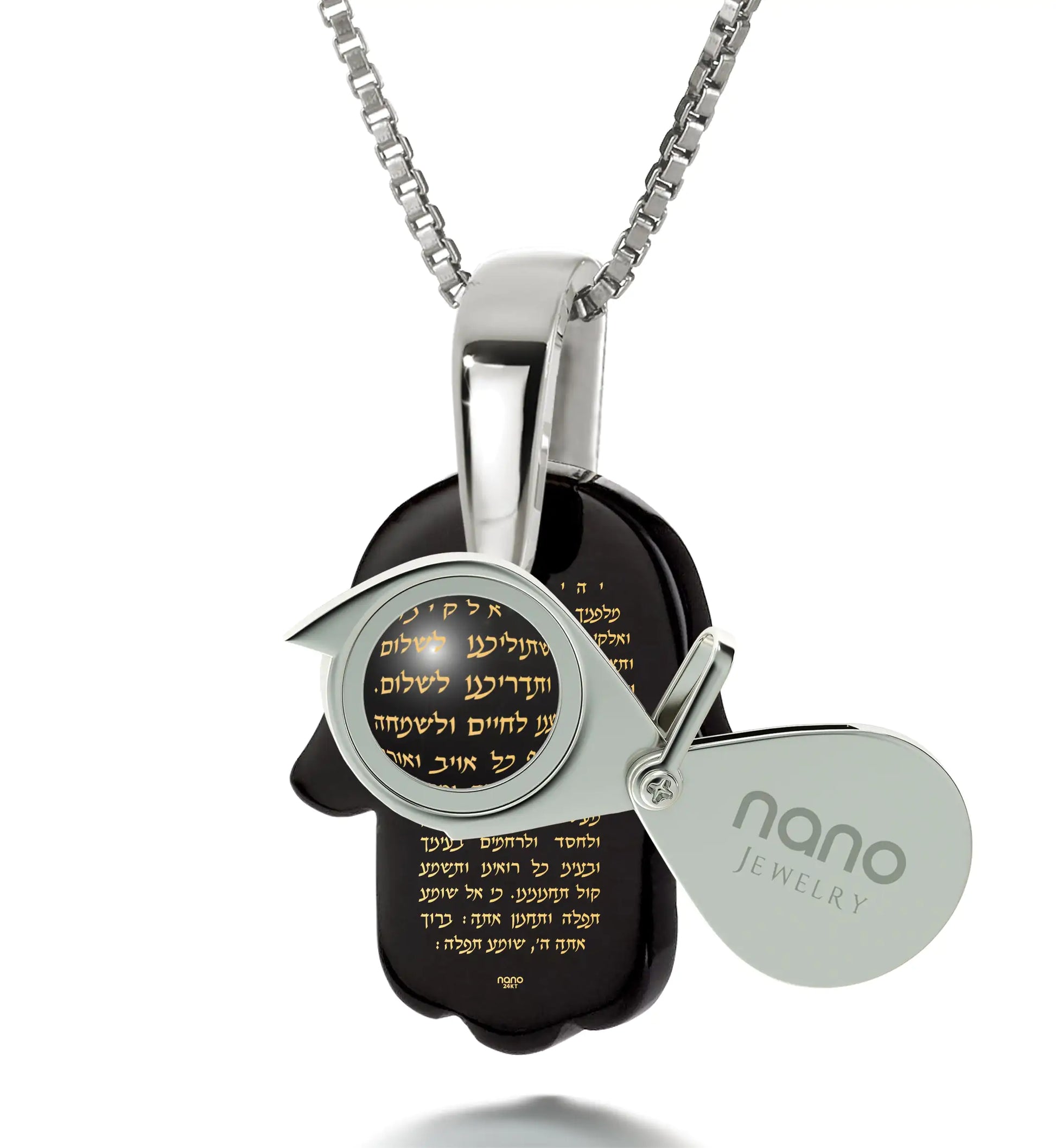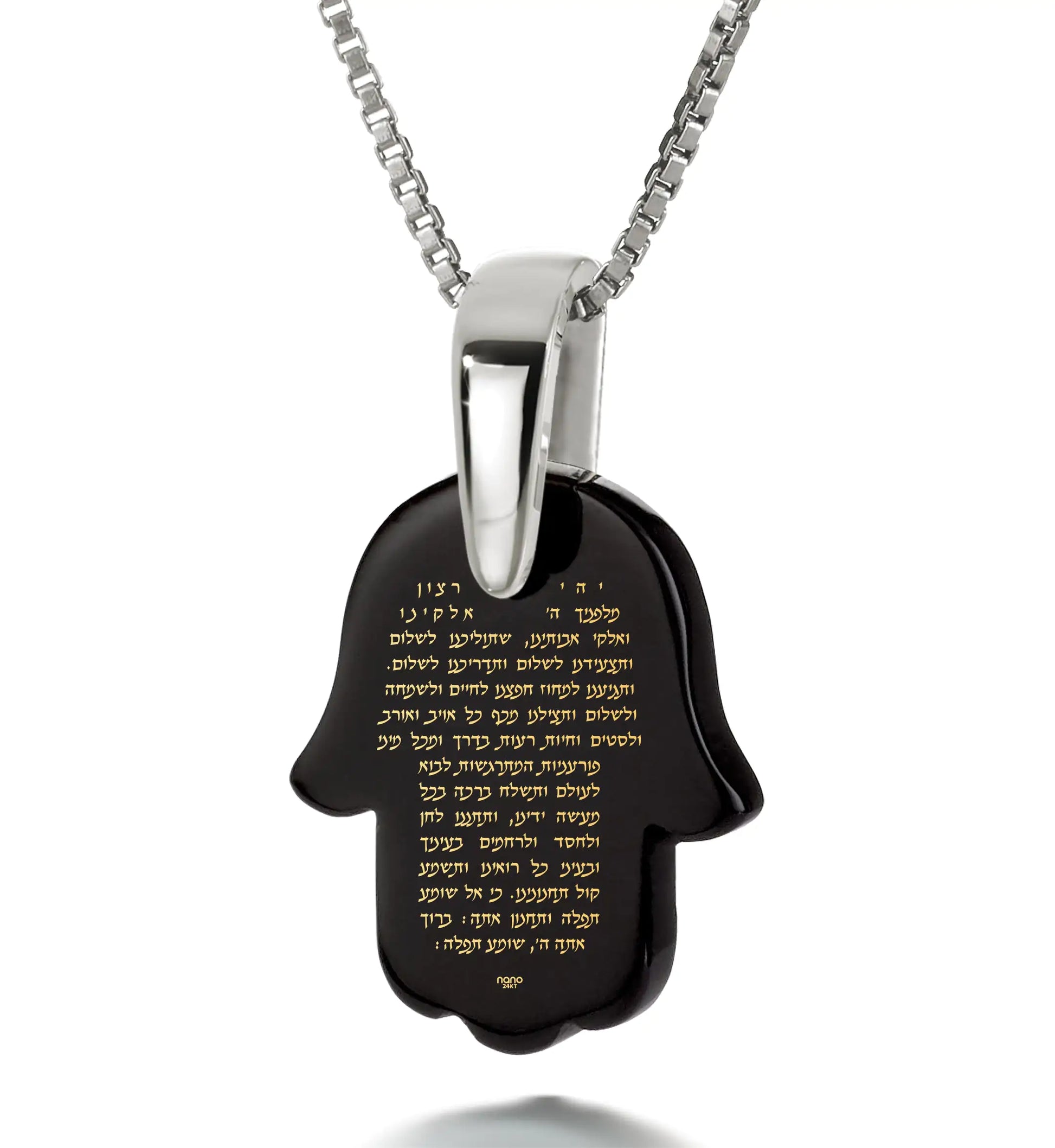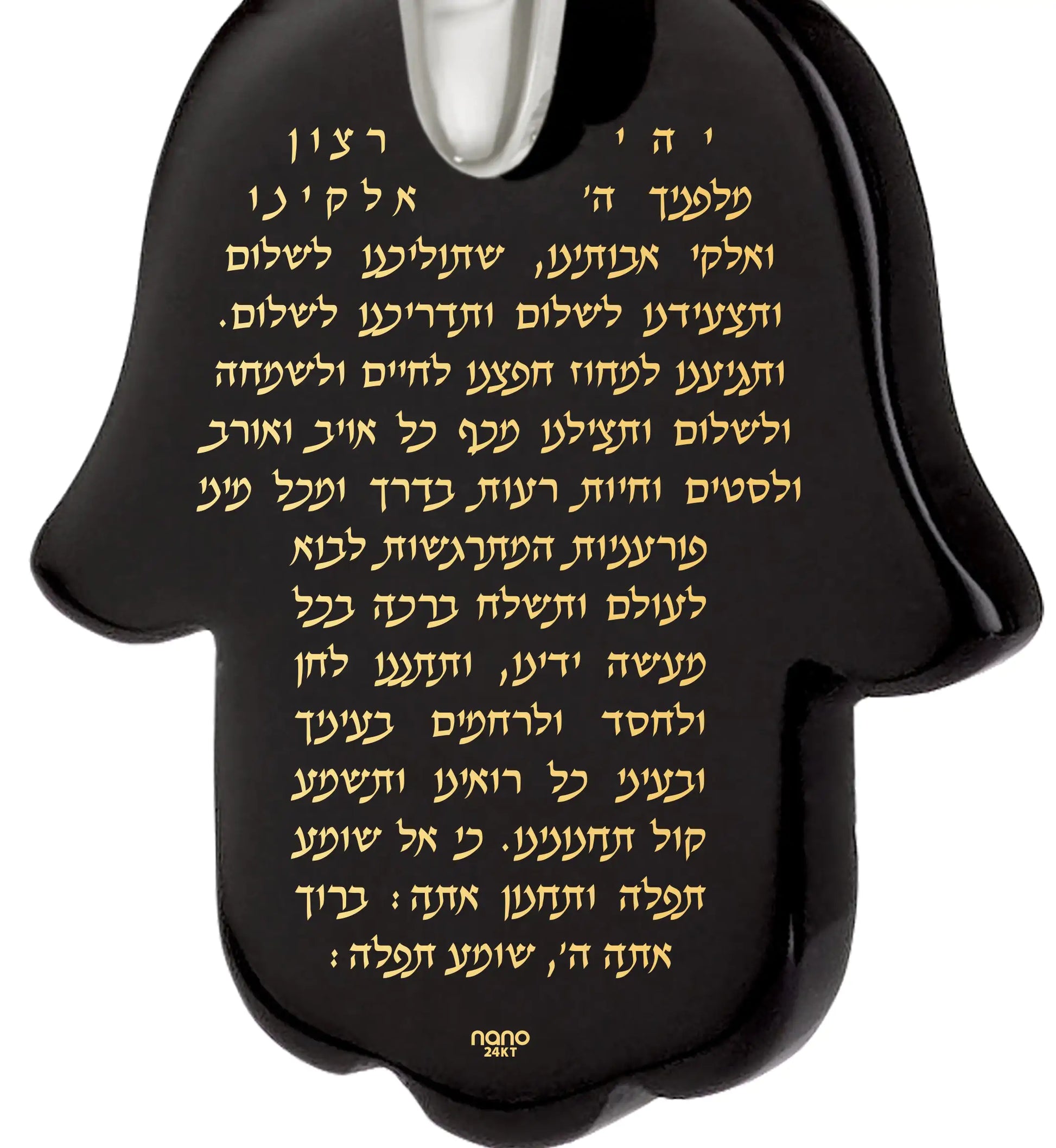 Introducing our Hebrew Travelers Prayer Pendant, a sacred and protective piece of religious jewelry designed with ingenuity and innovation. This necklace is a meaningful gift for someone who values their sacred faith. The pendant features the sacred travelers prayer recited by Jews all over the world when embarking on a journey, whether a holiday or a short trip. Combined with the all-watchful Hamsa, the ultimate symbol of protection, faith, and virtue is bestowed upon the bearer. Crafted with meticulous attention to detail, this pendant serves as a powerful talisman, offering protection and divine blessings to the wearer as they venture on their journeys. Embrace the sacred symbolism of our Hebrew Travelers Prayer Pendant and carry the essence of protection and faith with you wherever you go, cherishing the richness of your spiritual heritage.