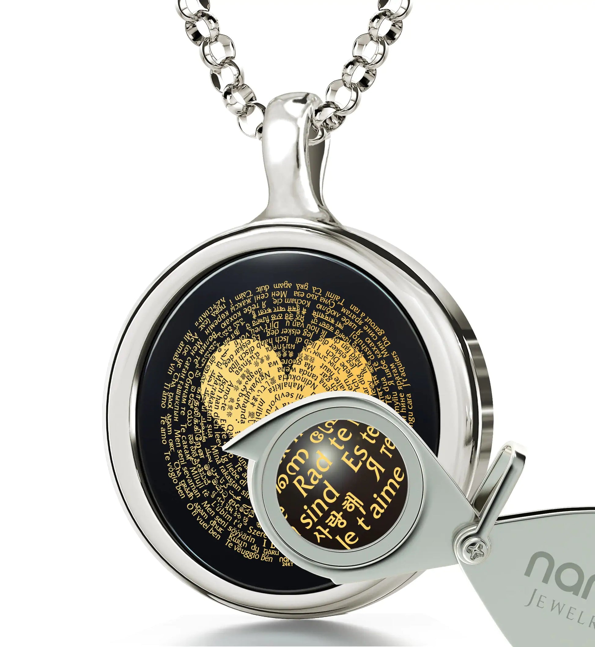 I Love You Necklace in 120 Languages 24k Gold Inscribed on Round Onyx