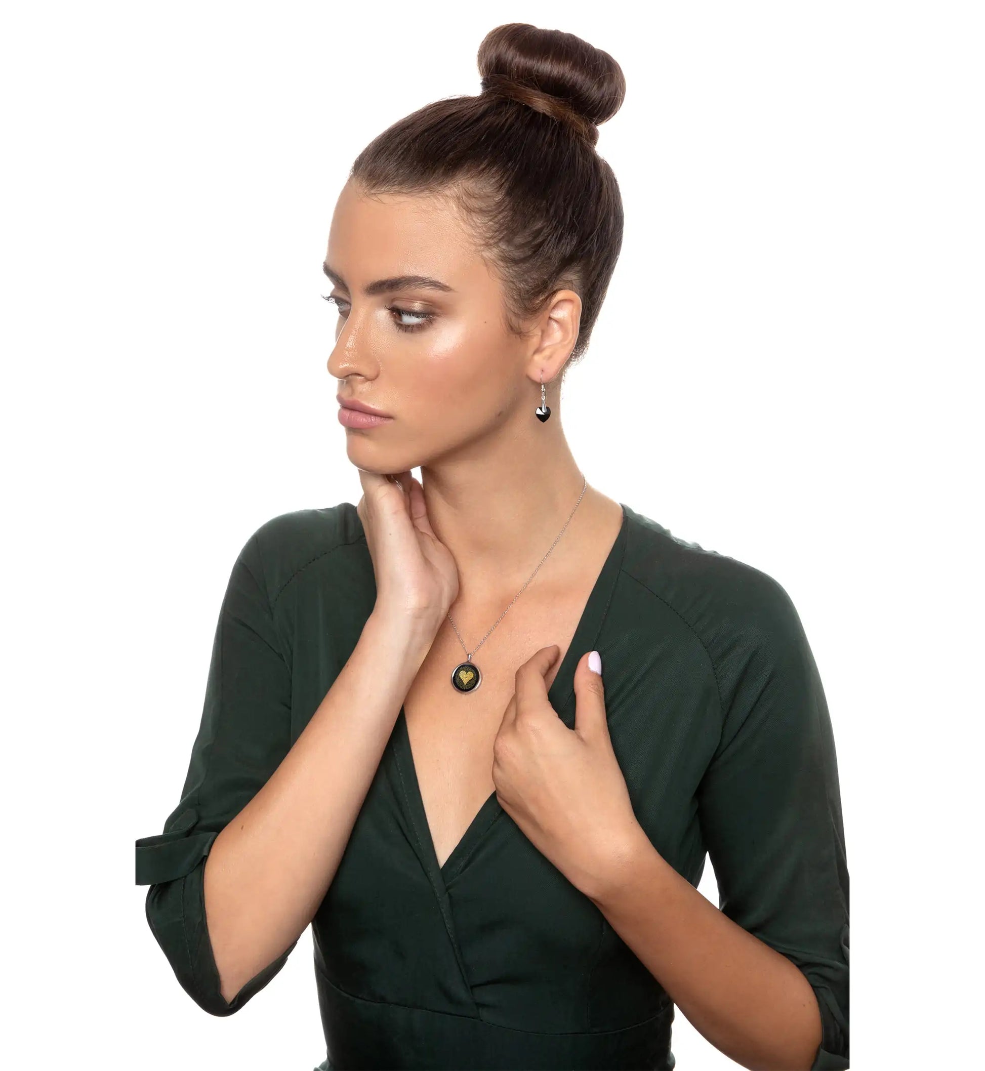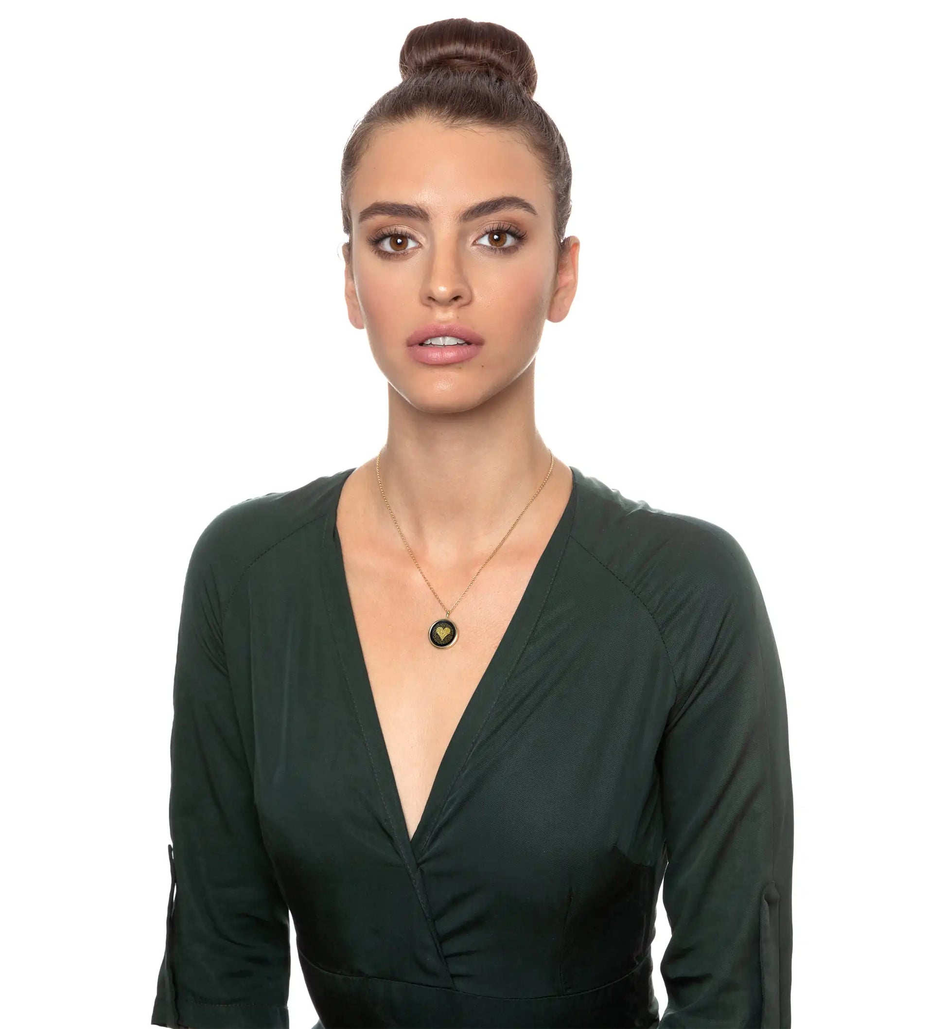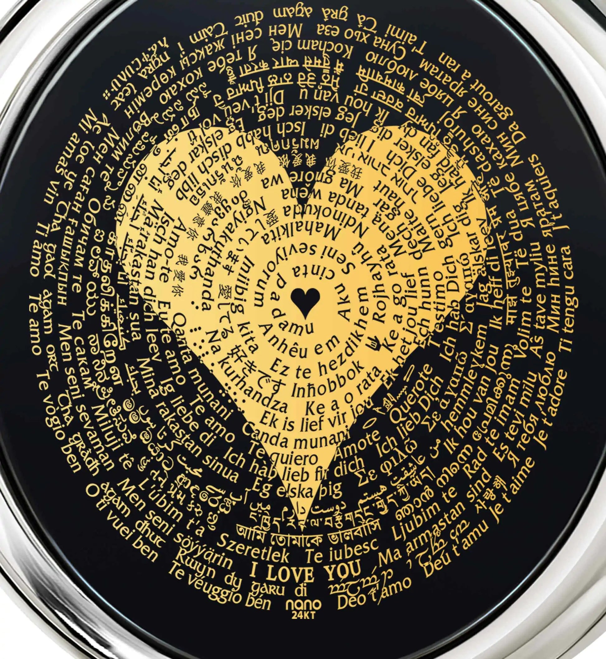 An elegant onyx pendant inscribed with "I love you" in 120 different languages in 24k gold detail and set in your choice of round metal frame.