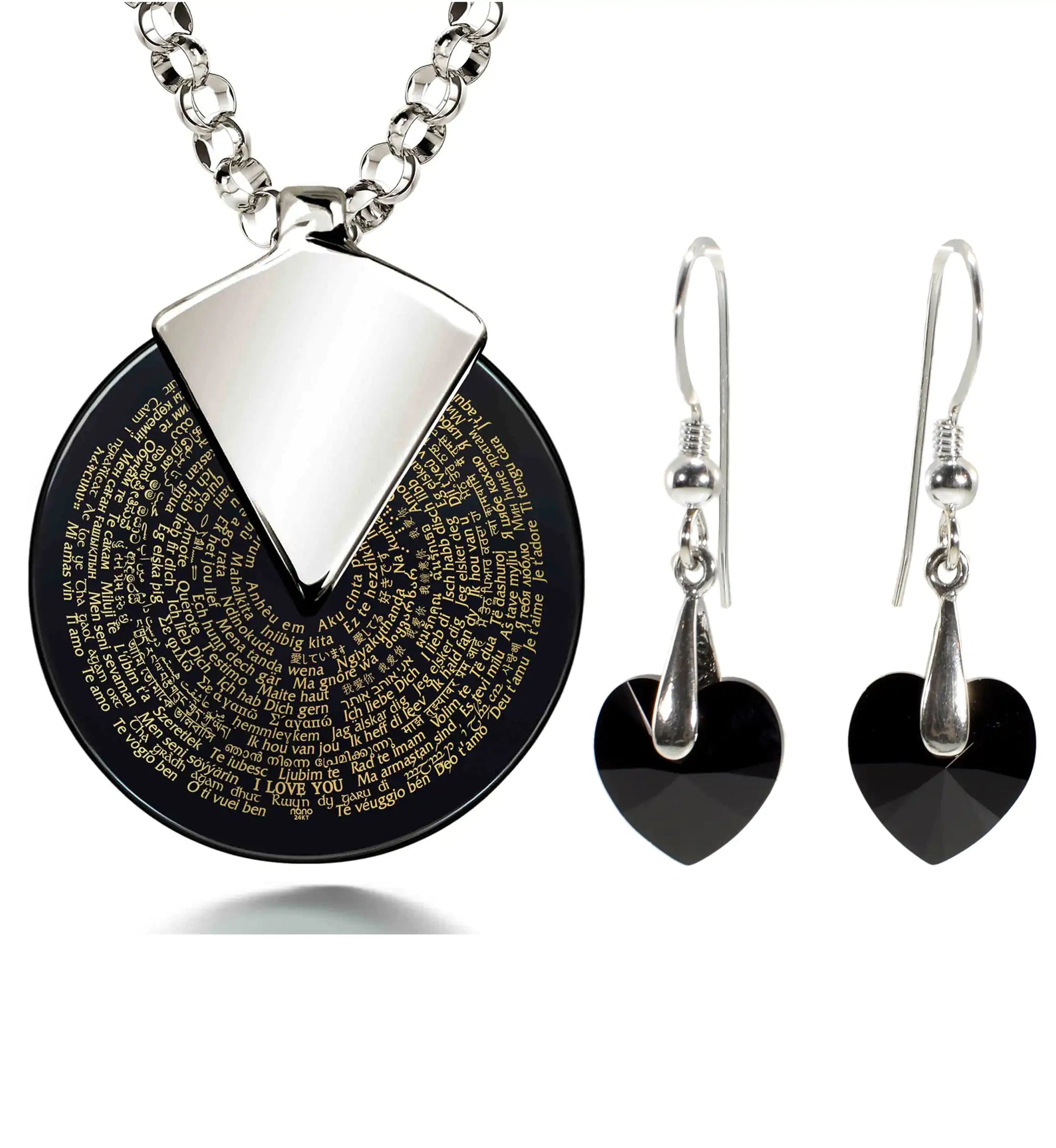 A unique spinning onyx pendant inscribed with "I love you" in 120 different languages in 24k gold detail set in your choice of metal. Beautifully complemented by black Swarovski crystal heart earrings.