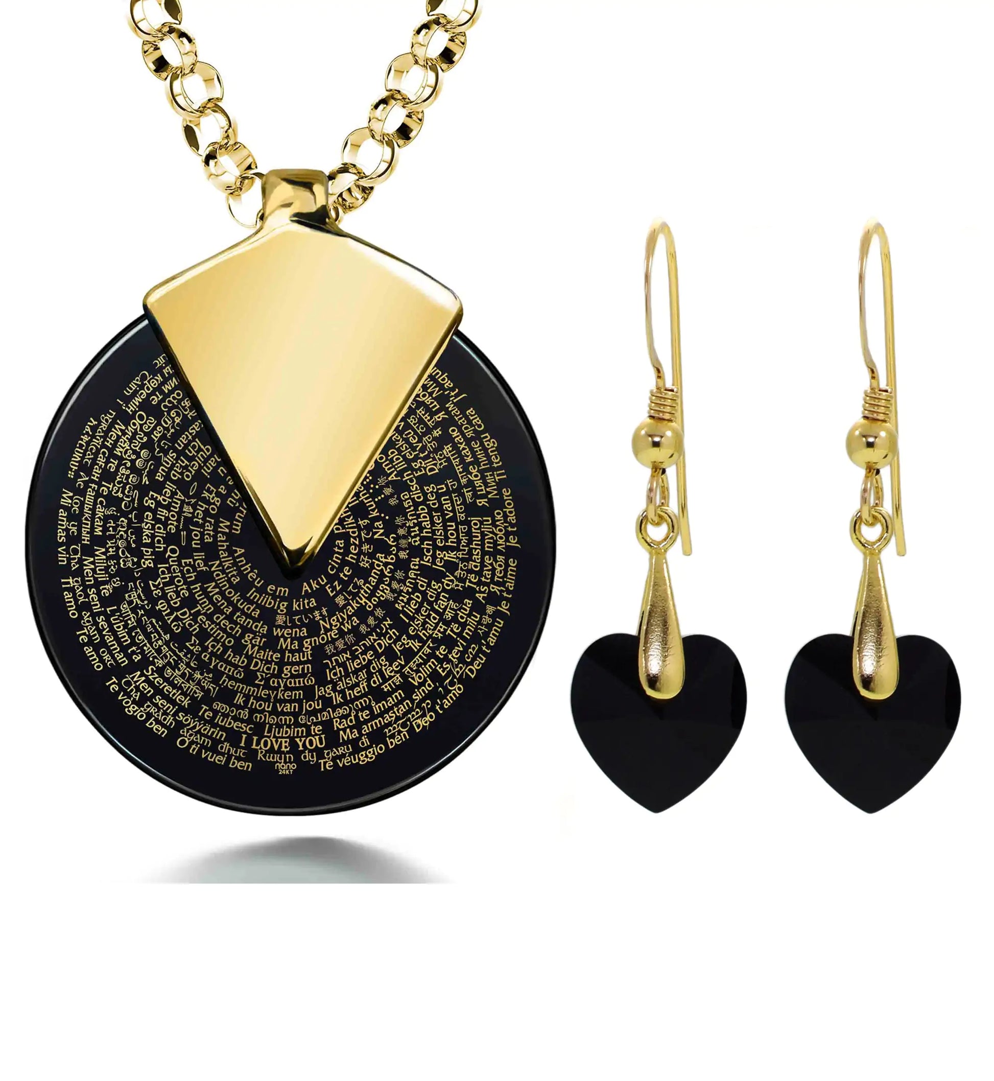 I Love You Necklace Set 24k Gold Inscribed in 120 Languages on Round Spinning Onyx