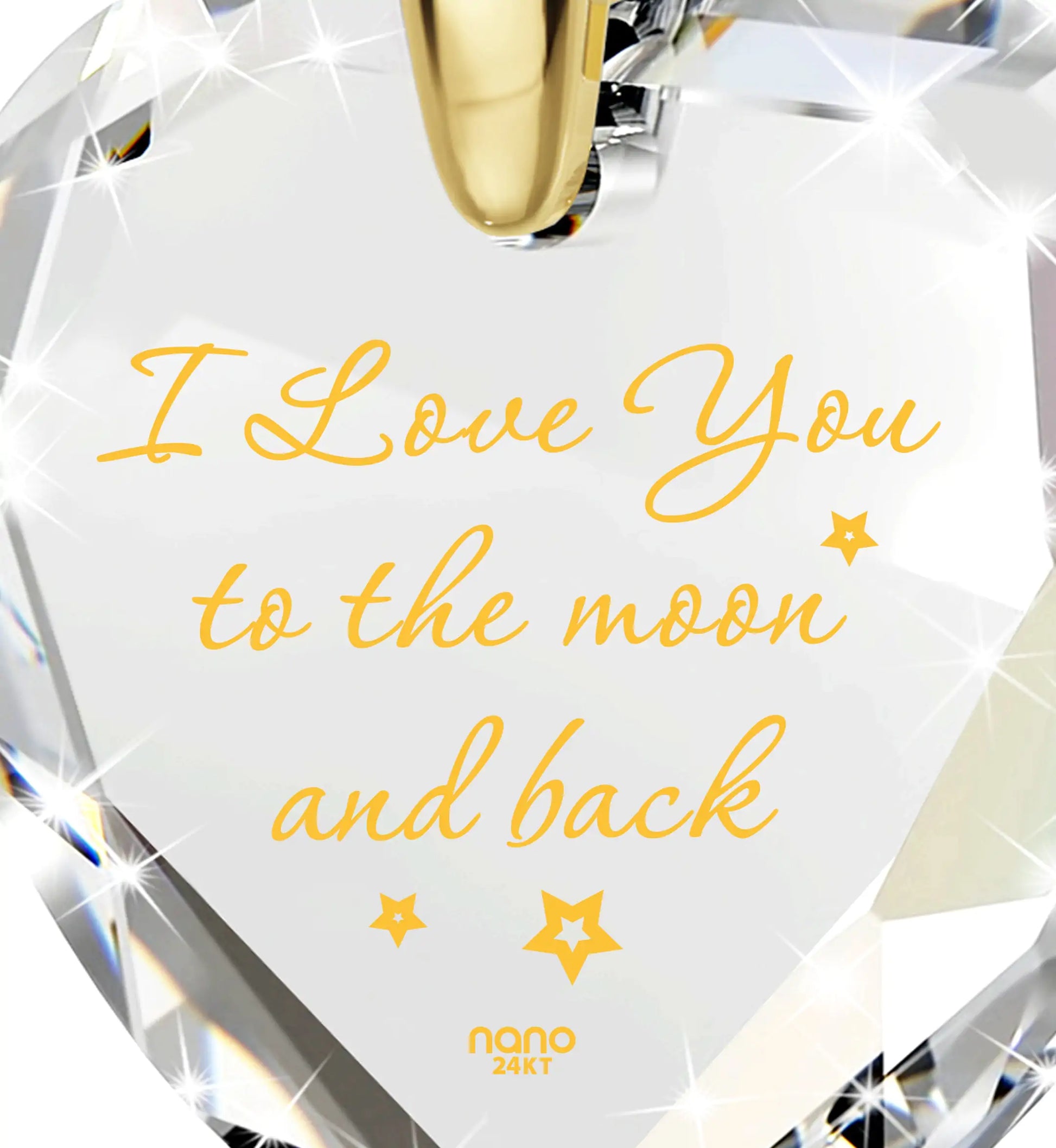 A beautifully crafted jewelry set, heart-shaped faceted cubic zirconia pendant, inscribed with "I Love You to the Moon and Back" in 24k gold, accompanied by crystal Swarovski heart earrings.