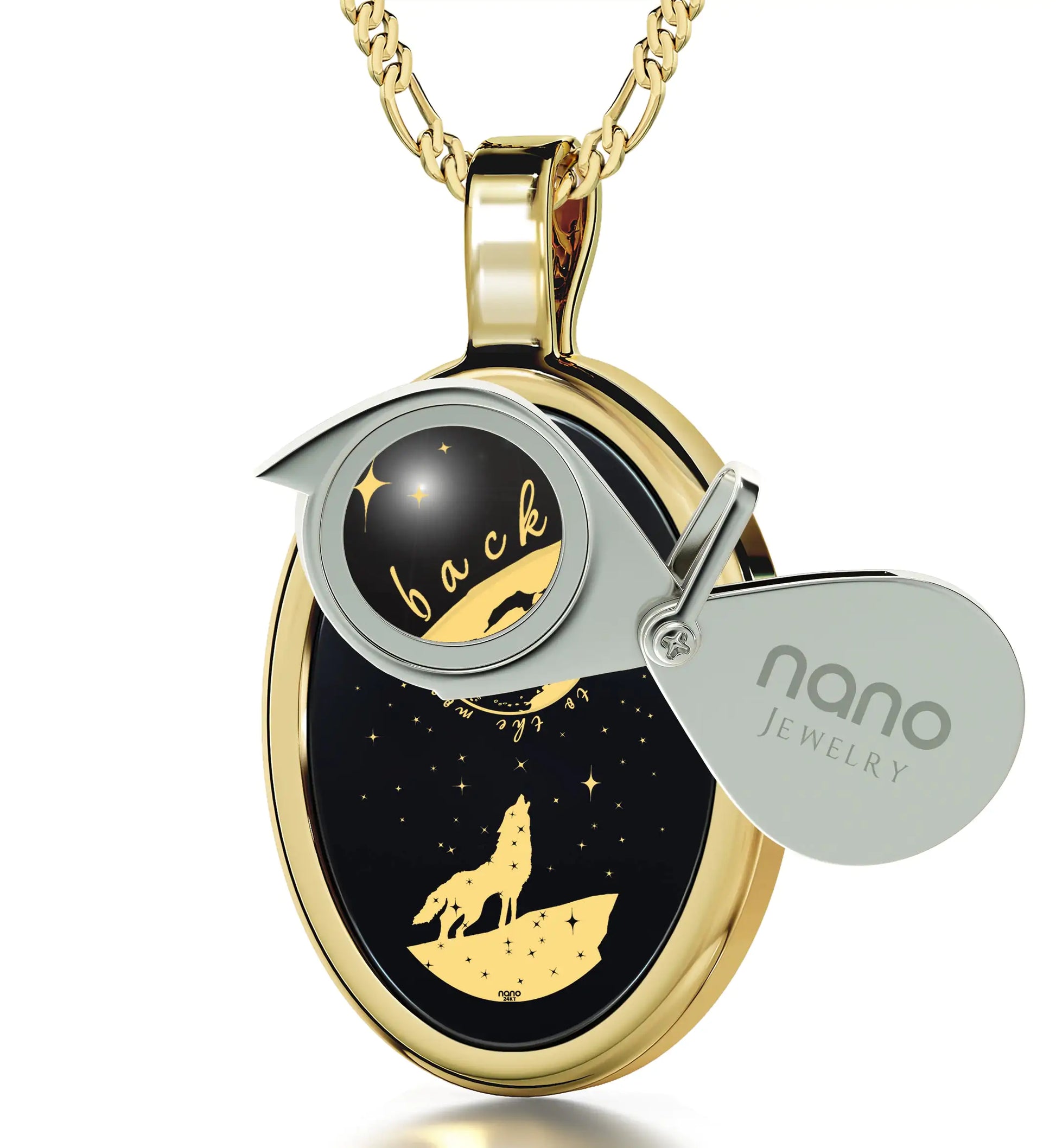 - I love you to the moon and back necklace with a love-stricken wolf howling at a full moon cast against a star-filled sky all inscribed in 24k gold
