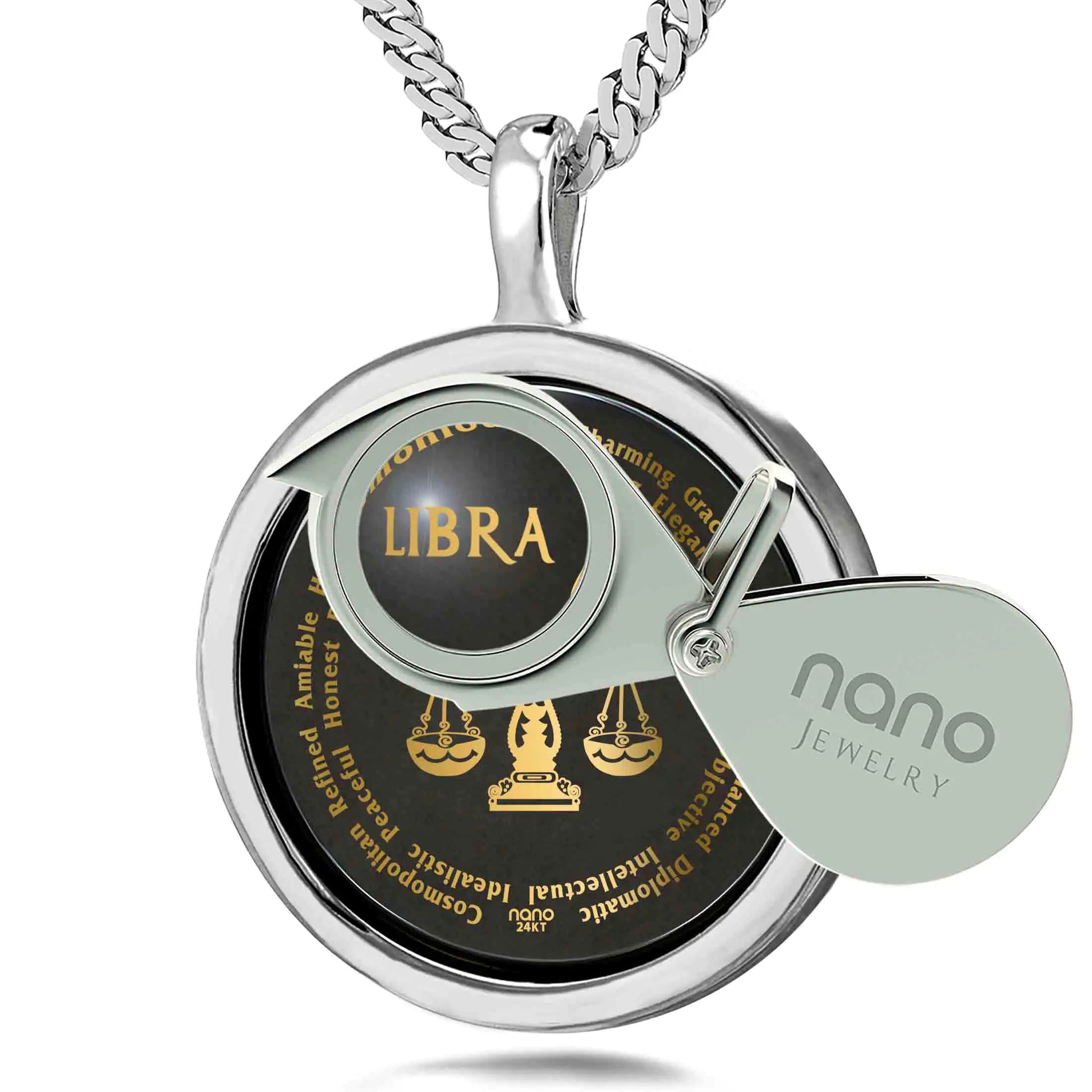 - Elegant Libra necklace inscribed in 24k gold with scale star sign surrounded by personality characteristics in intricate detail