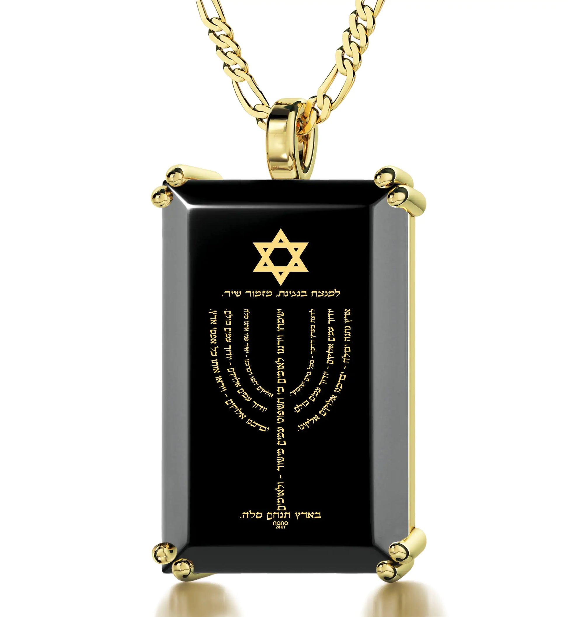 A rectangular onyx pendant inscribed in 24k gold with Psalm 67 in the shape of the 7 branch candelabra, the Menorah, lit with the Star of David. The reflective Jewish prayer was carried by King David in the form of a menorah on his shield (Magen David).
