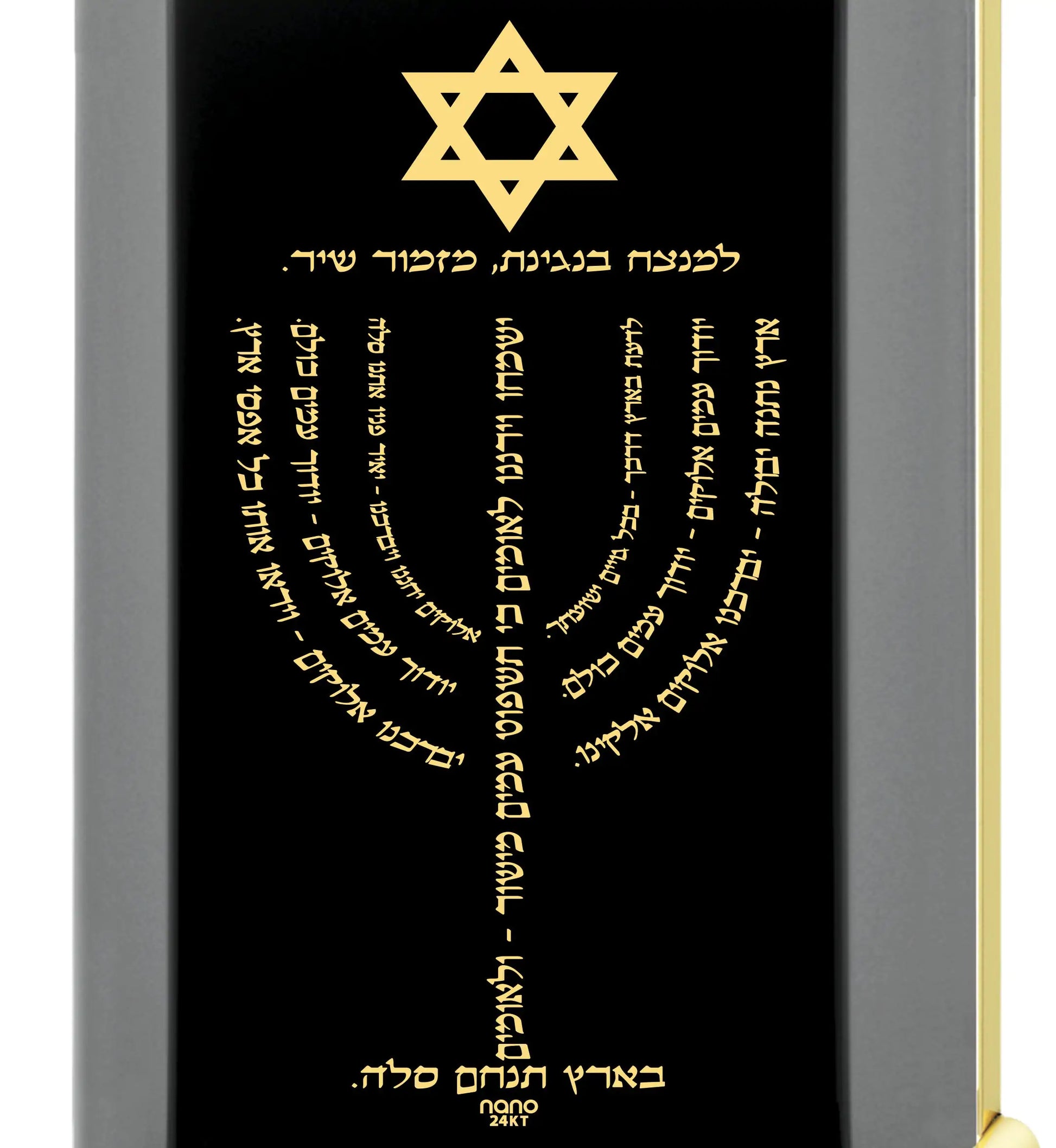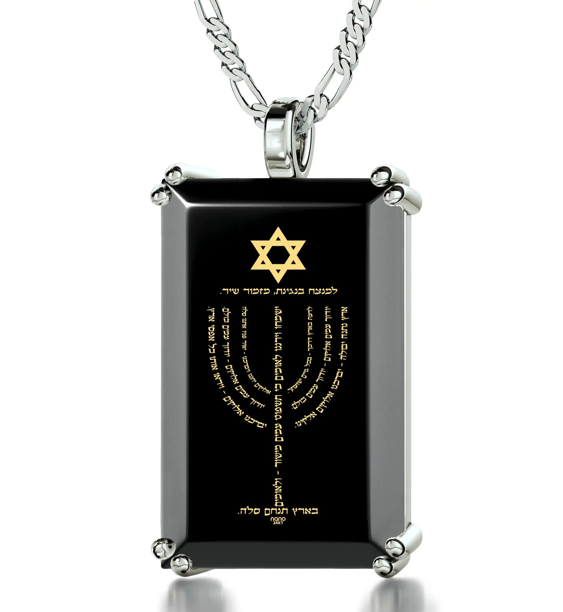 A rectangular onyx pendant inscribed in 24k gold with Psalm 67 in the shape of the 7 branch candelabra, the Menorah, lit with the Star of David. The reflective Jewish prayer was carried by King David in the form of a menorah on his shield (Magen David).