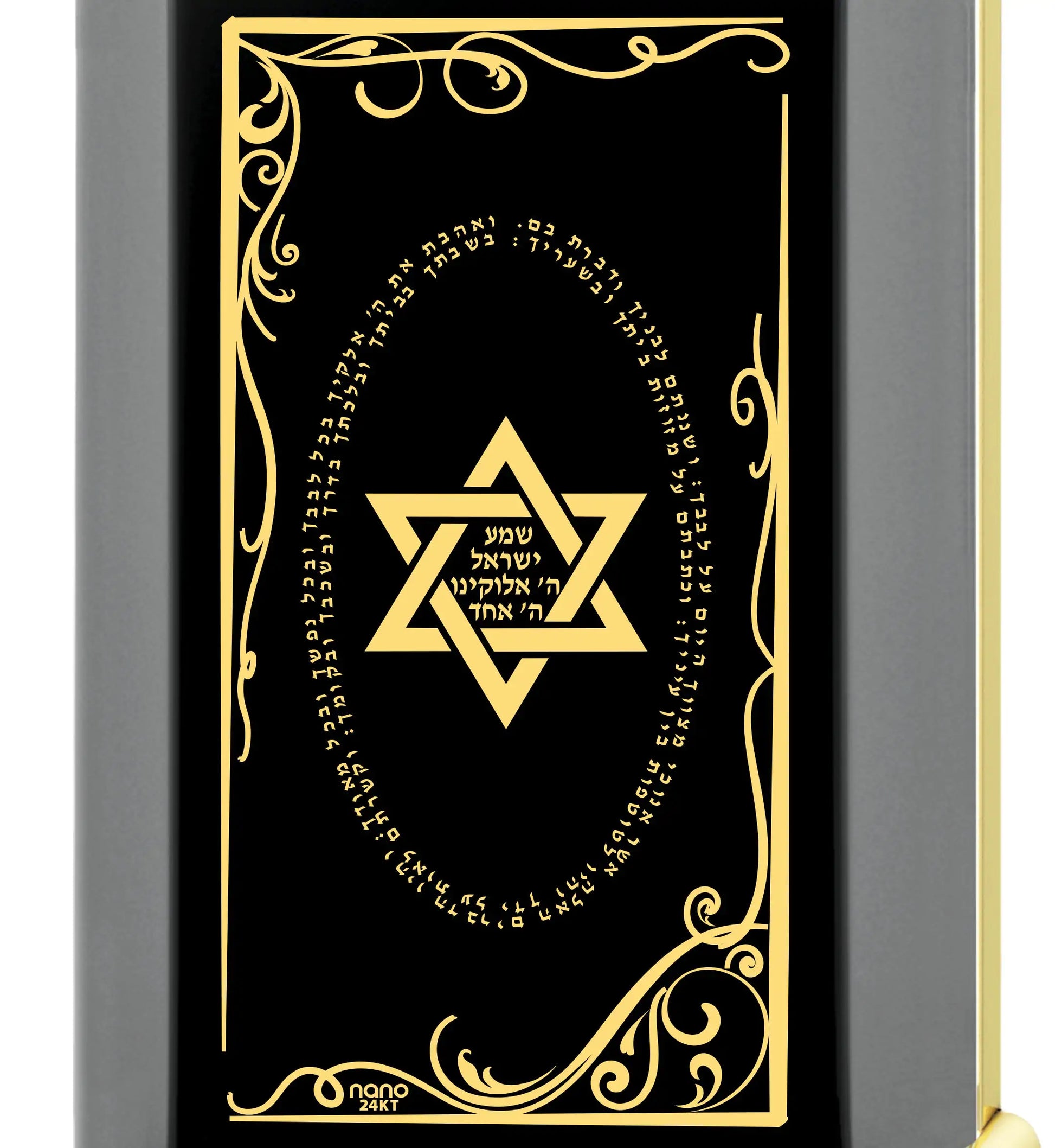An elegant rectangular onyx pendant inscribed in 24k gold with the most profound Hebrew prayer, Shema Israel, within and around the Star of David.