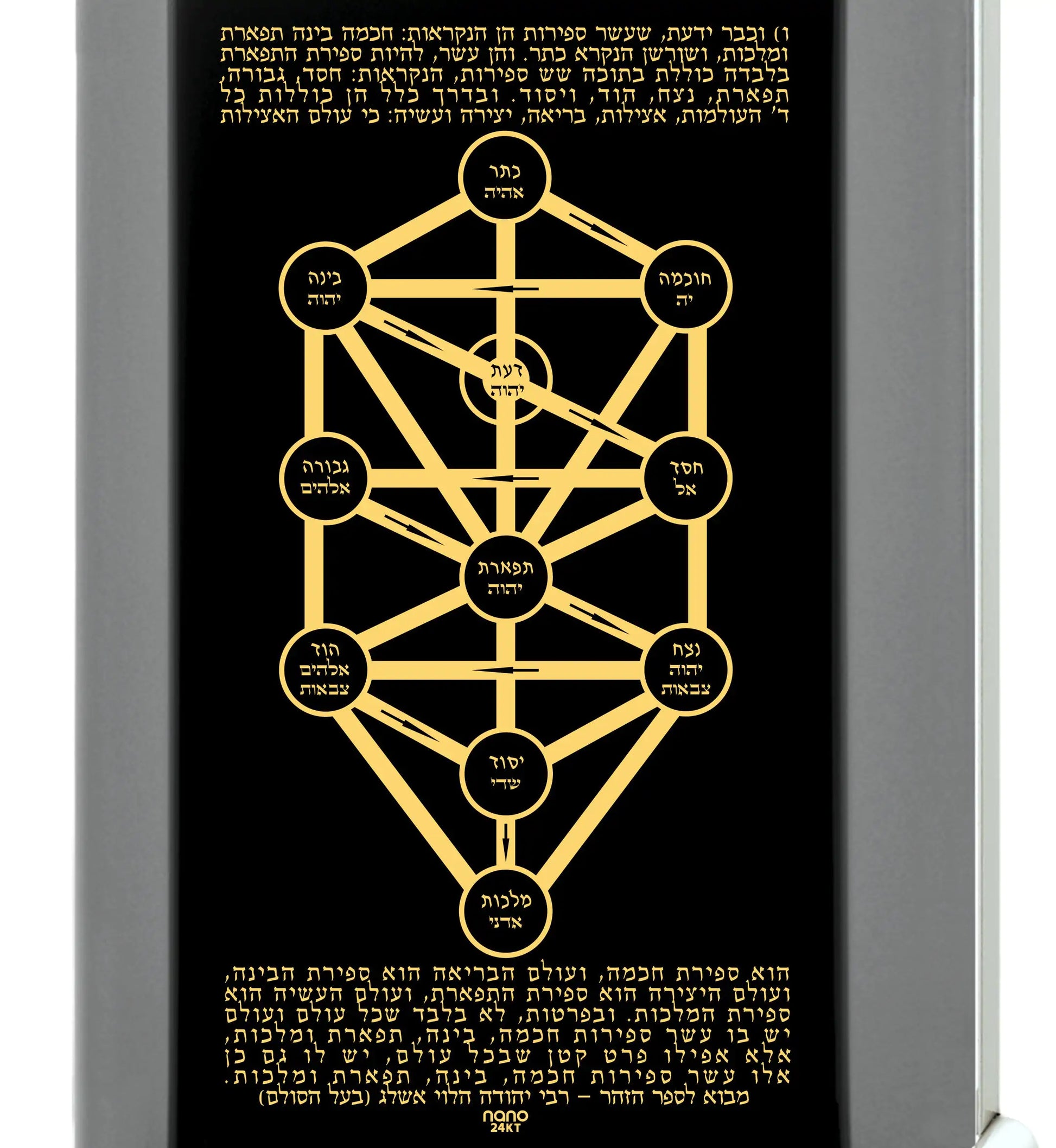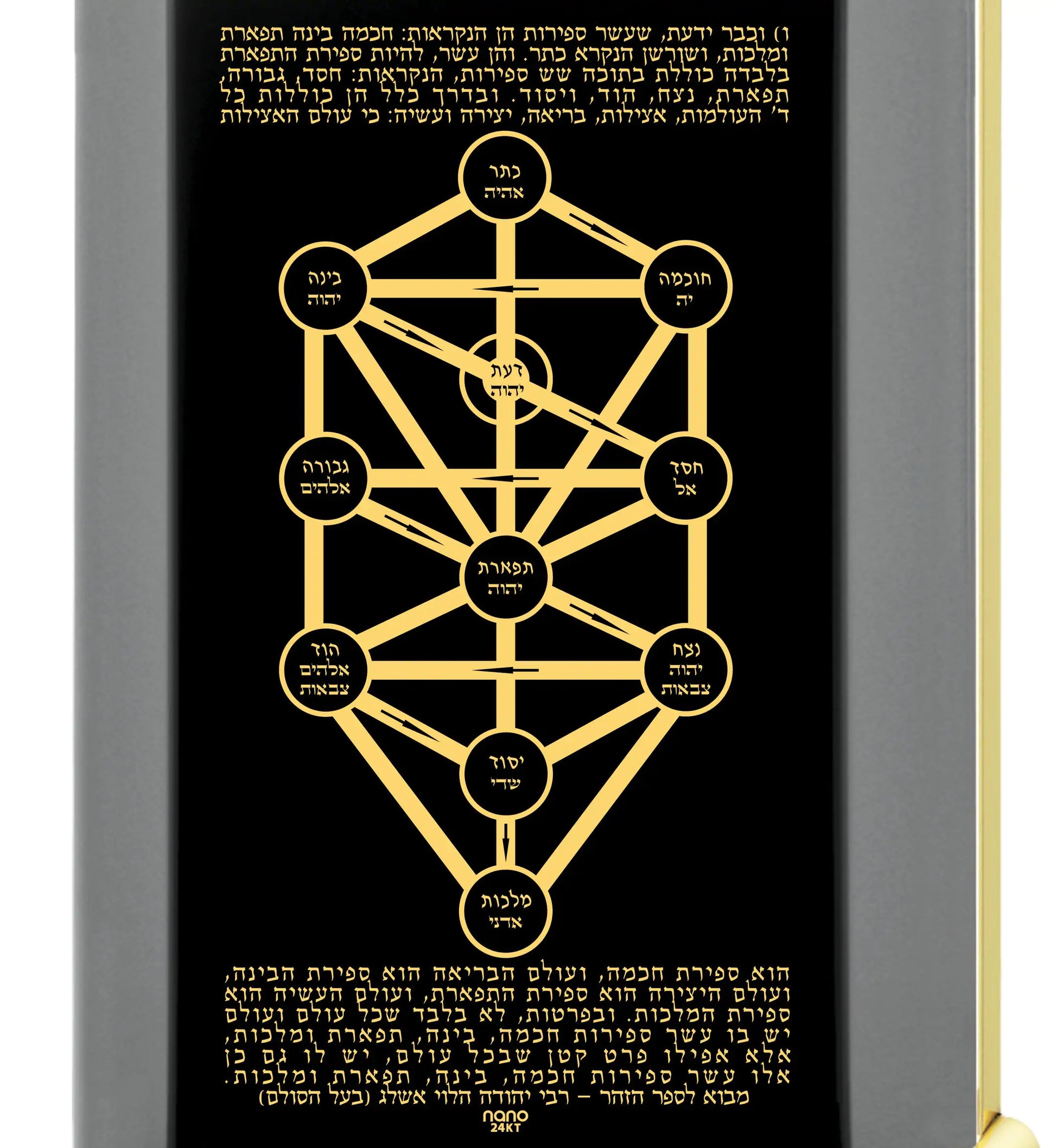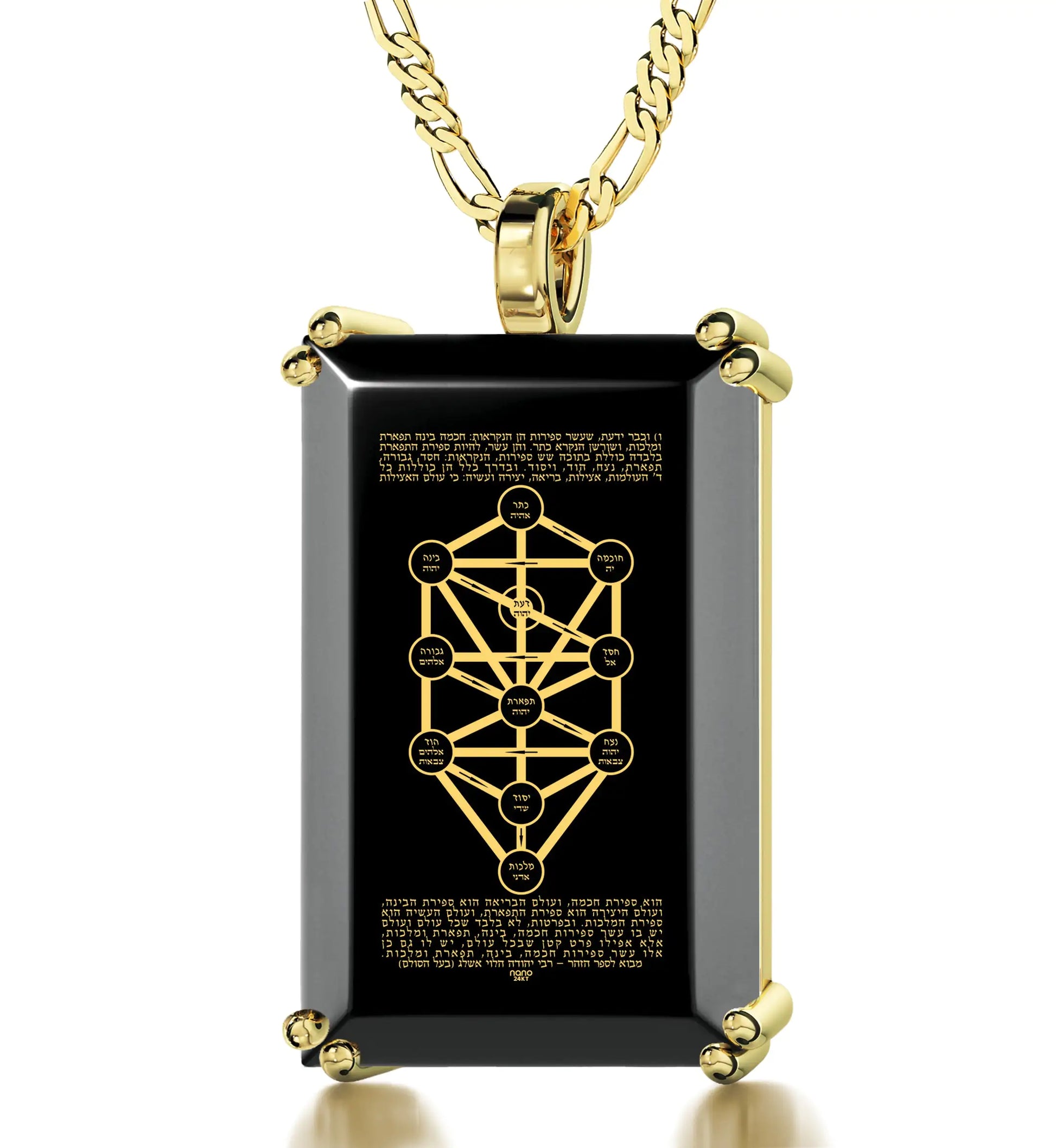 A rectangular onyx pendant inscribed in 24k gold with the sacred 10-spheres (sephirot) tree of life, the ten ways in which the Divine reveals his spirit. The Kabbalistic 10-Spheres is a journey illuminating the Divine plan to bring creation and nature closer to your soul.