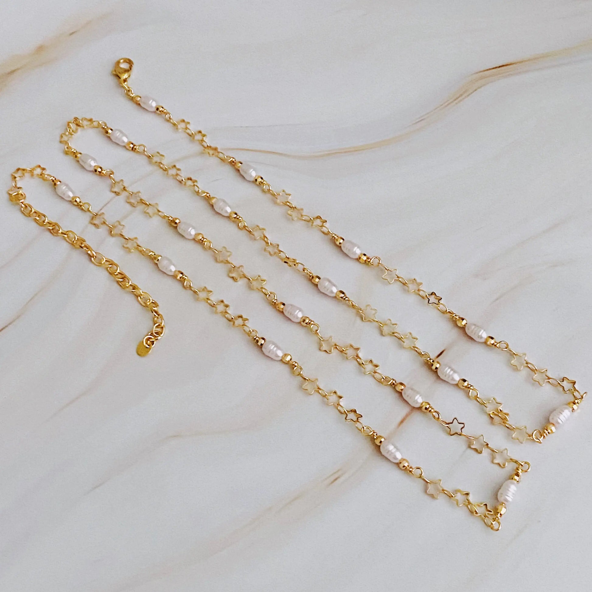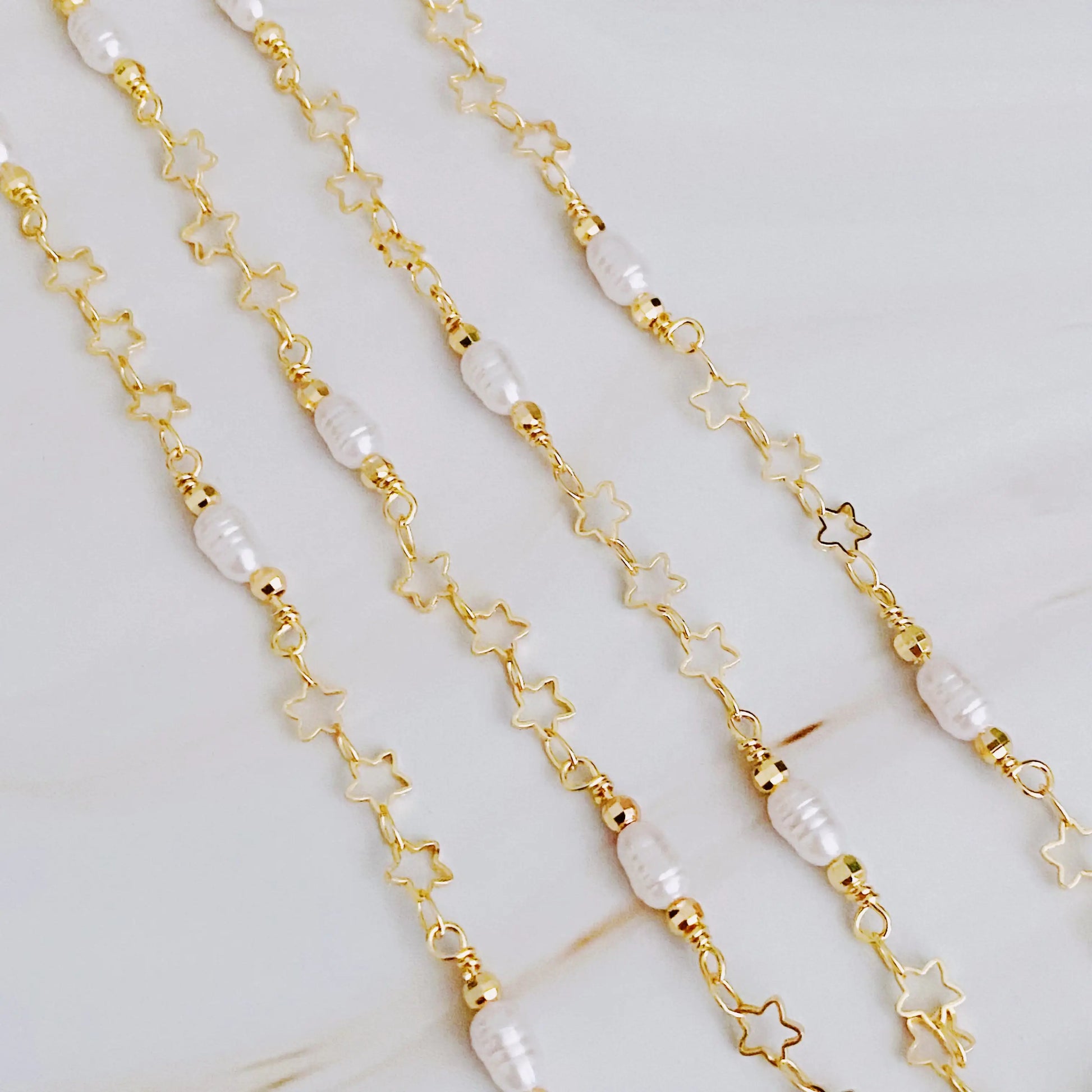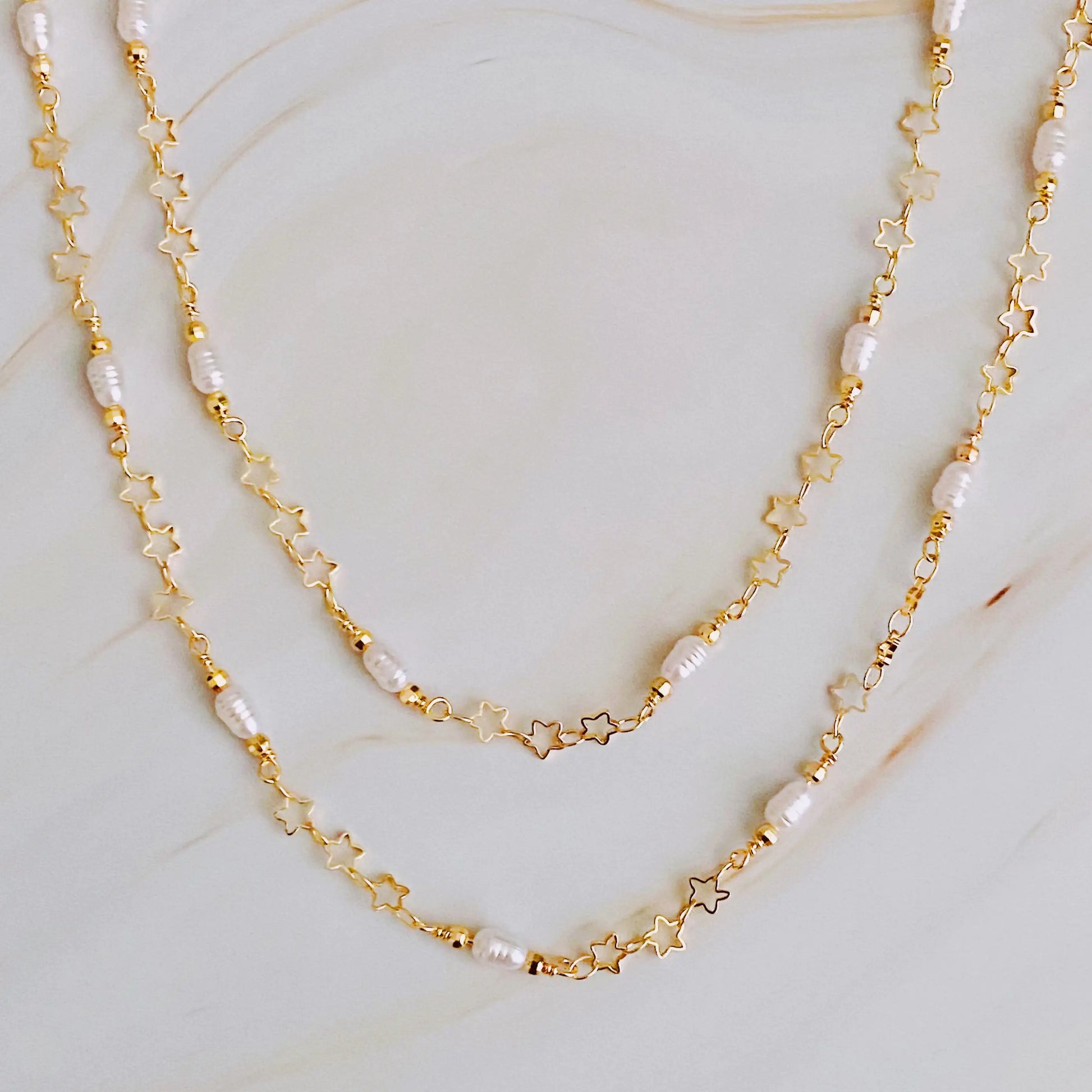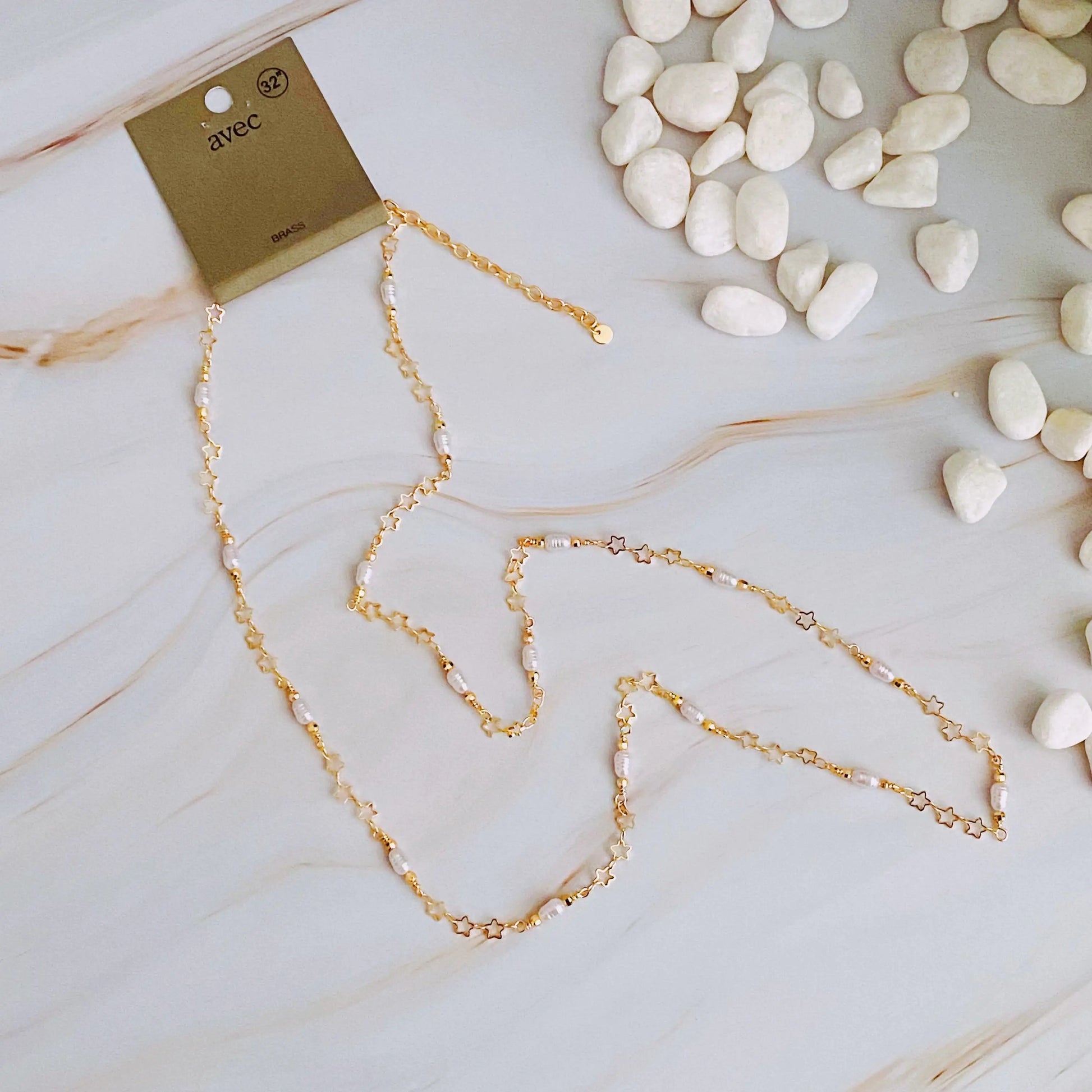 This Mini Pearl Mini Star Long Chain Necklace is the perfect accessory for any outfit. The small stars delicately linked together in the chain, along with the pearl beads, create a beautiful and unique look. The 32"-34" chain length makes the necklace versatile, allowing for double wrapping or a single long look. Dress it up or down for a subtle yet dazzling look.