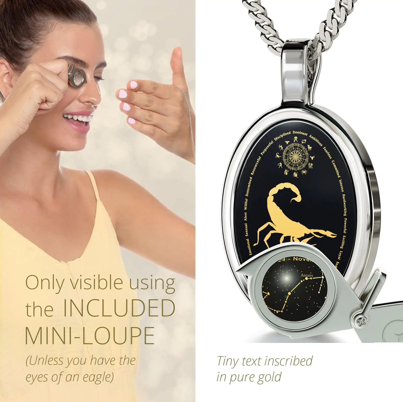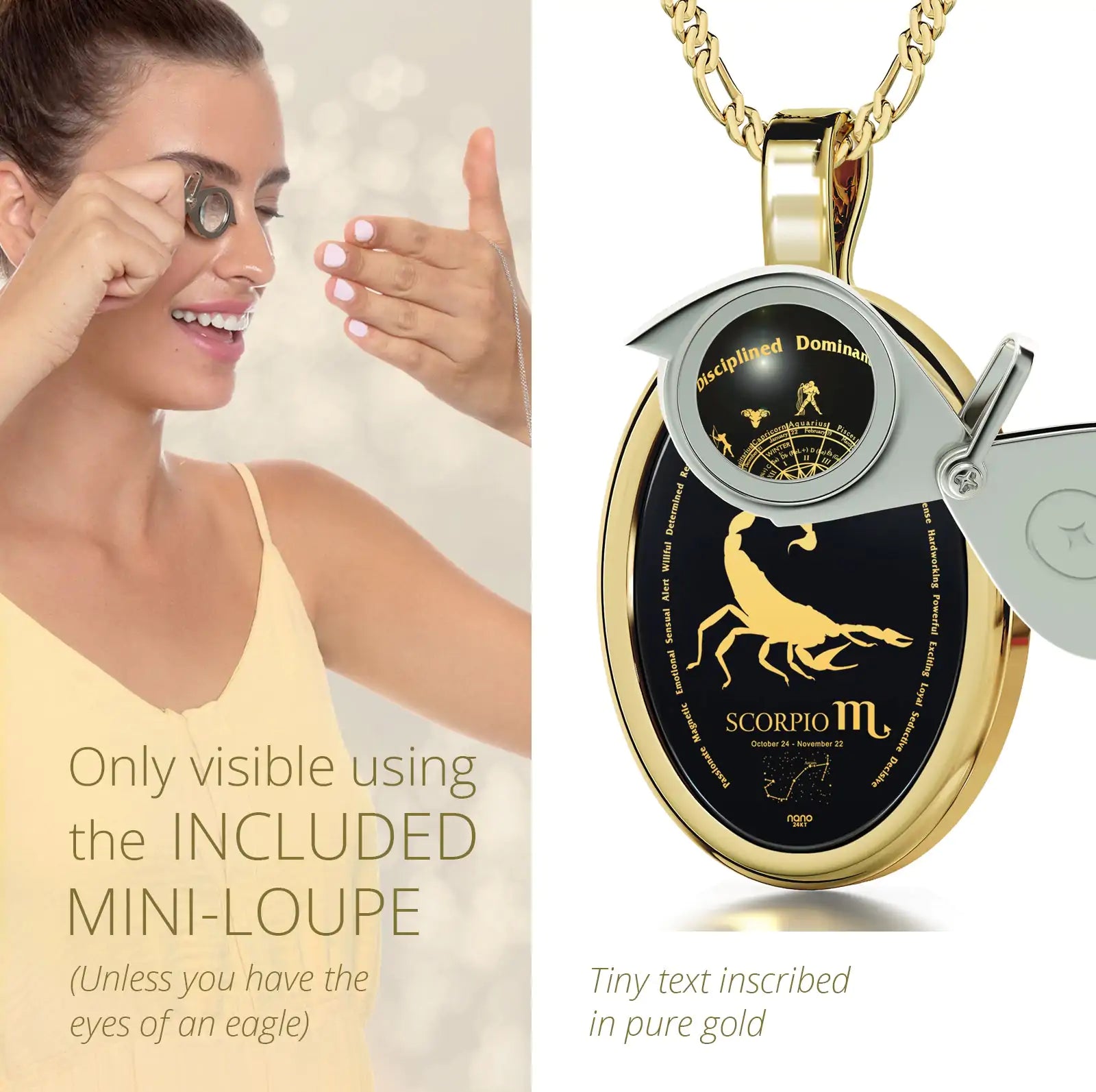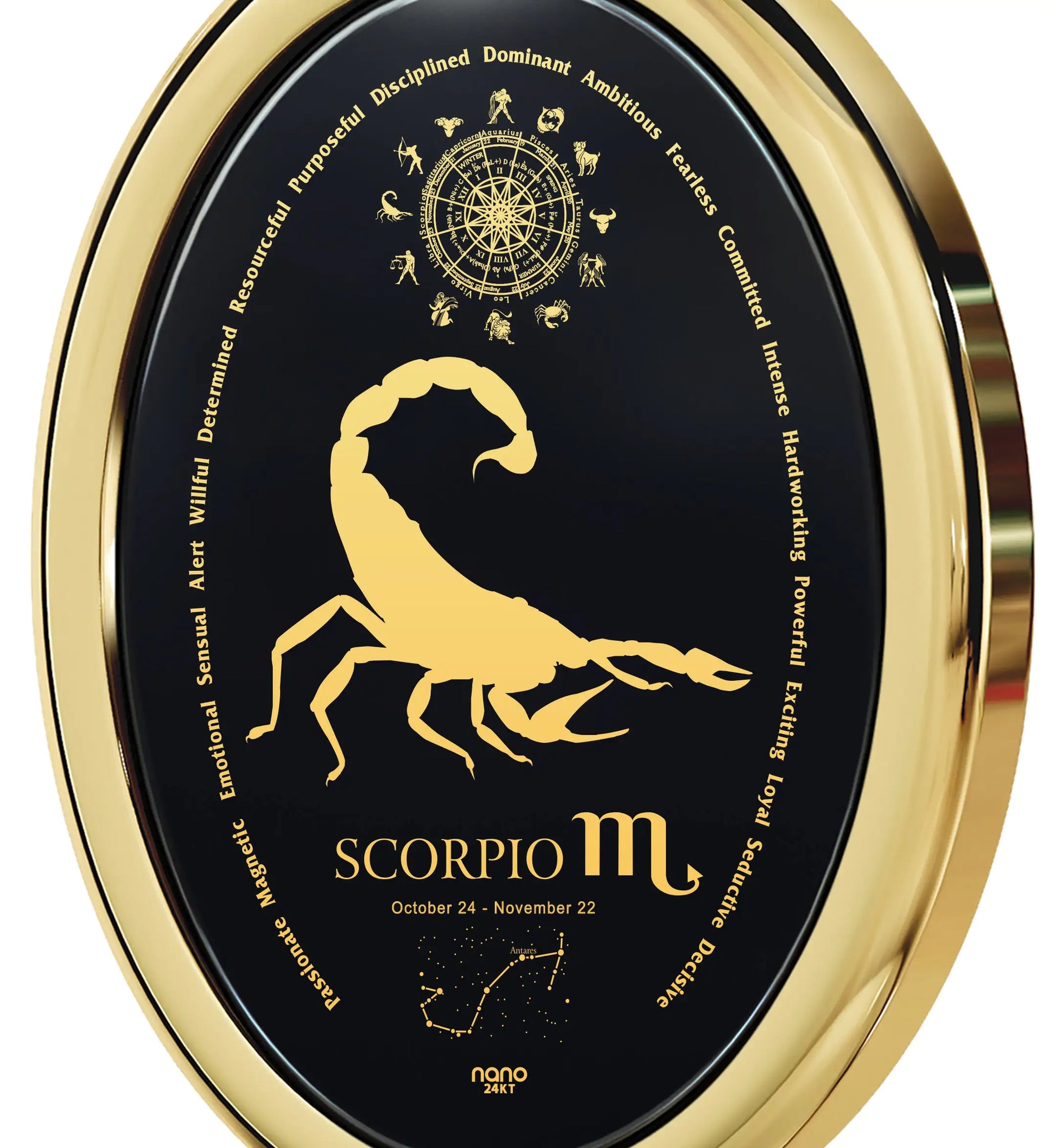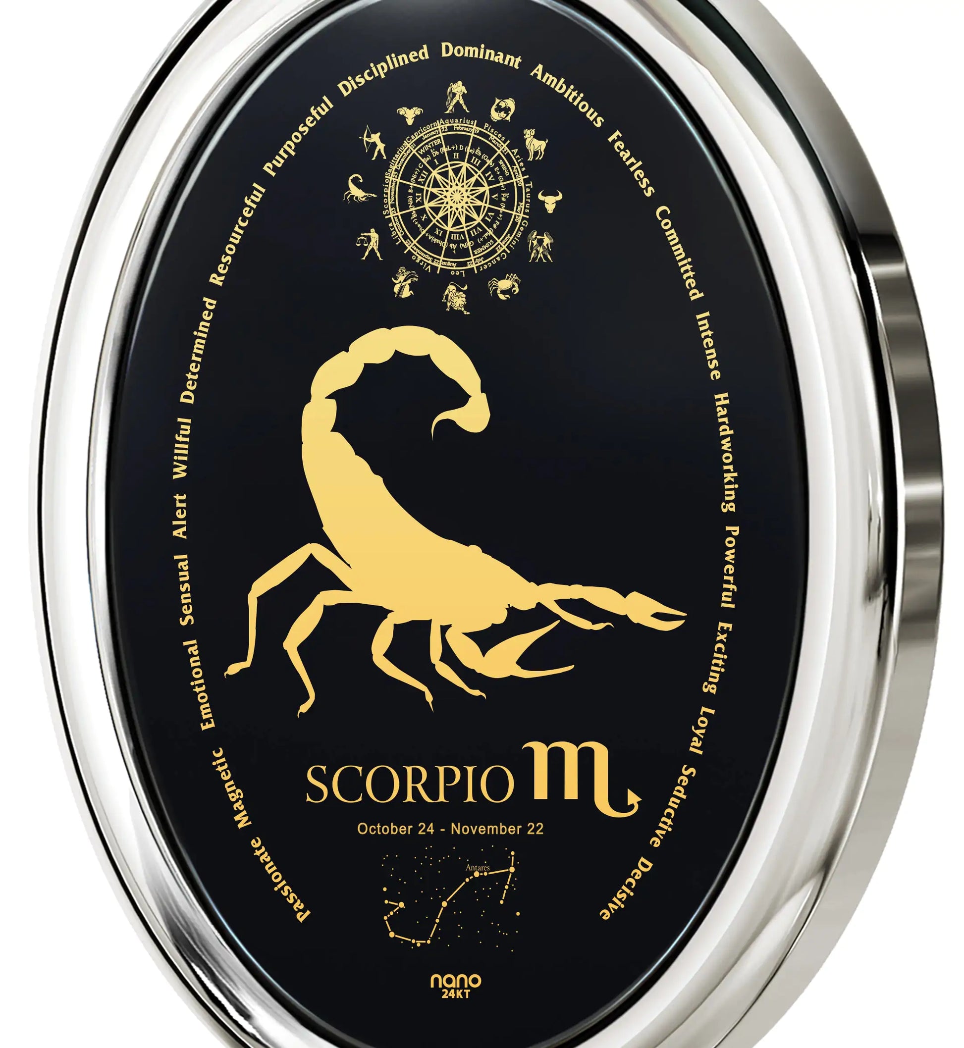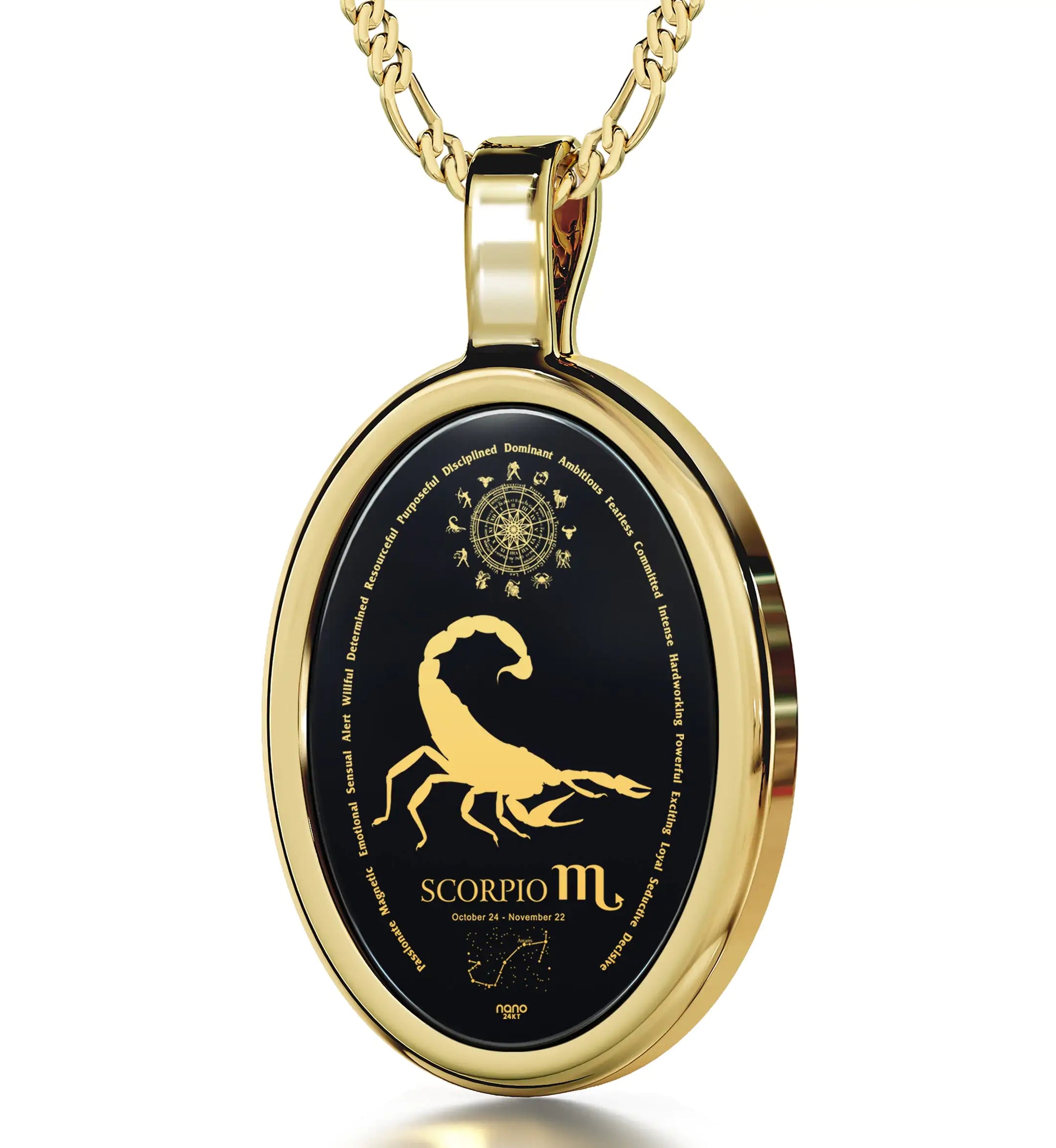 Experience the allure of the Onyx Scorpio Zodiac Pendant, meticulously etched with the intricate image of Scorpio, the scorpion, in radiant 24k gold. Delicately set within your chosen oval metal frame, this pendant beautifully captures the essence of Scorpios – loyal, intense, and ambitious individuals. Whether commemorating your birth month or gifting a horoscope enthusiast, this unique zodiac necklace showcases the full zodiac wheel, Scorpio symbol, and constellation against the celestial sphere, accompanied by personality traits. A thoughtful birthday gift or an imaginative gesture for any woman – your wife, girlfriend, daughter, or best friend – this pendant stands as a symbol of your appreciation for their unique qualities.
