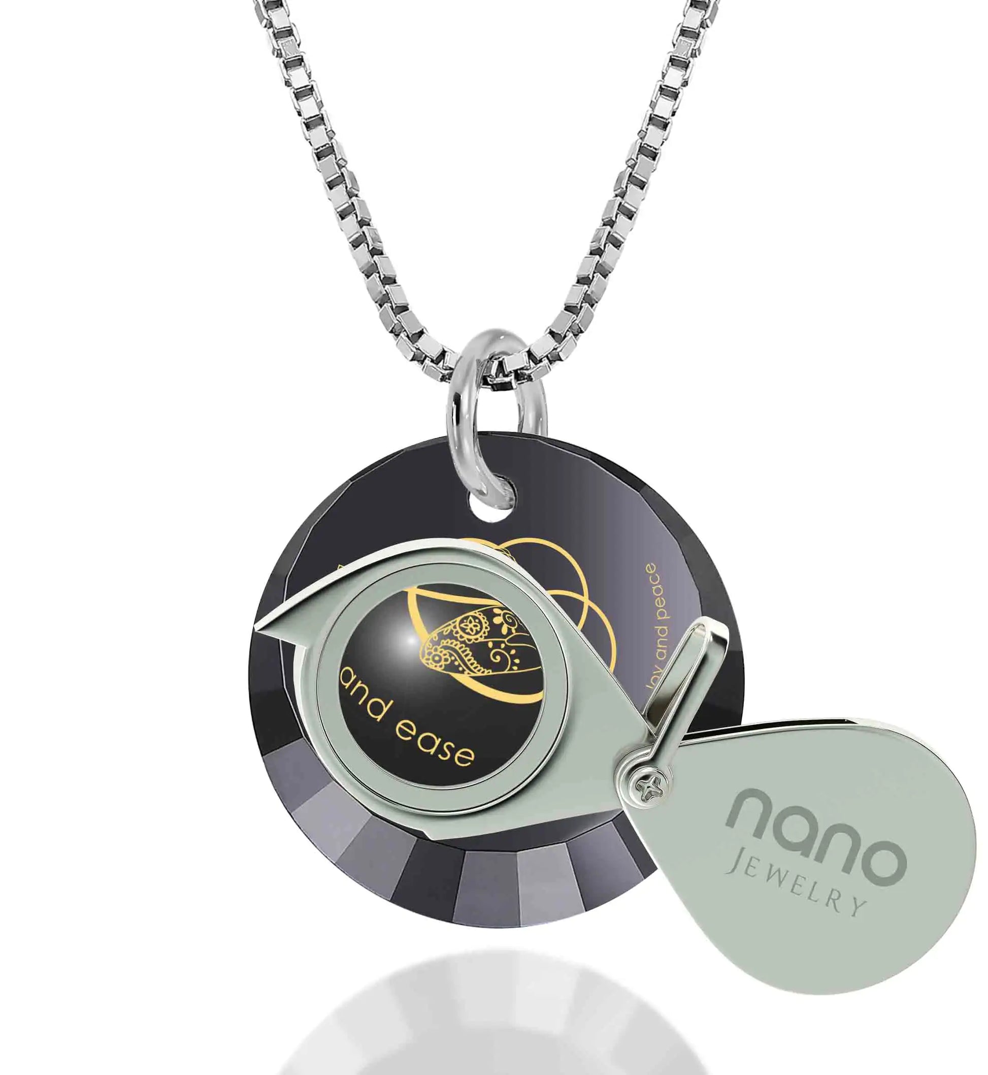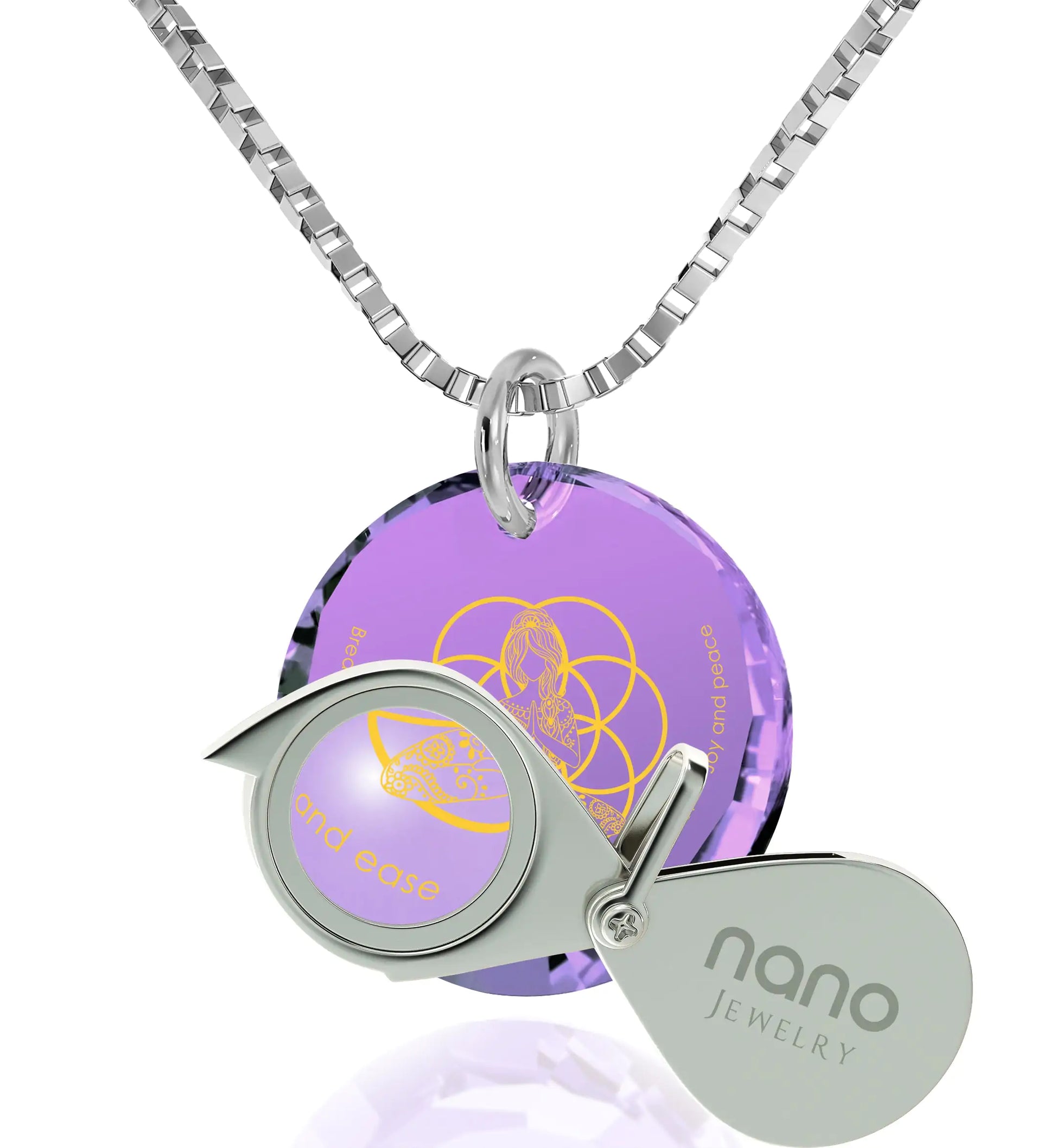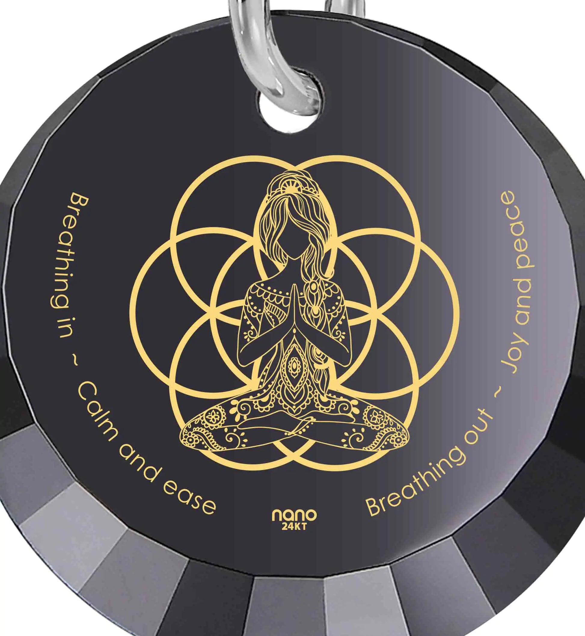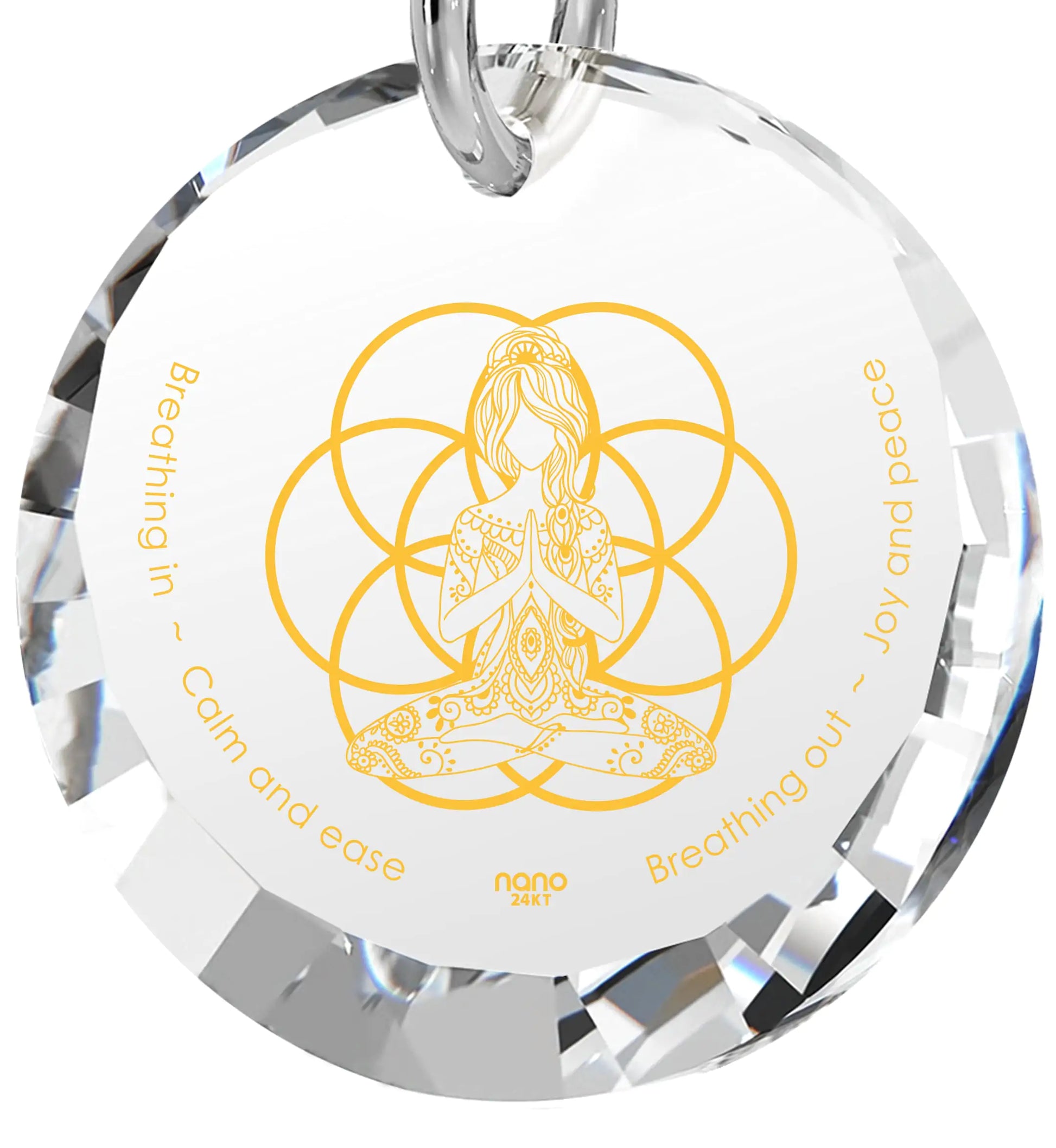 Elevate your spiritual journey with the Symbolic Yoga Pendant, a harmonious blend of design and meaning. This exquisite pendant features the mantra 'Breathing in - calm and ease, Breathing out - love and peace,' gracefully accompanying a tranquil yogi in the lotus pose, padmasana, while centered by the geometric seed of life. Intricately inscribed in radiant 24k gold onto a petite round faceted cubic zirconia gemstone charm, the pendant suspends gracefully from a 925 sterling silver chain. Symbolizing unconditional love, the seven chakras, and the rhythm of life itself, this pendant serves as a poignant reminder to find inner peace through mindful breathing. Whether a gift for a loved yogi or a personal accessory, let the Symbolic Yoga Pendant inspire your journey towards serenity and balance.