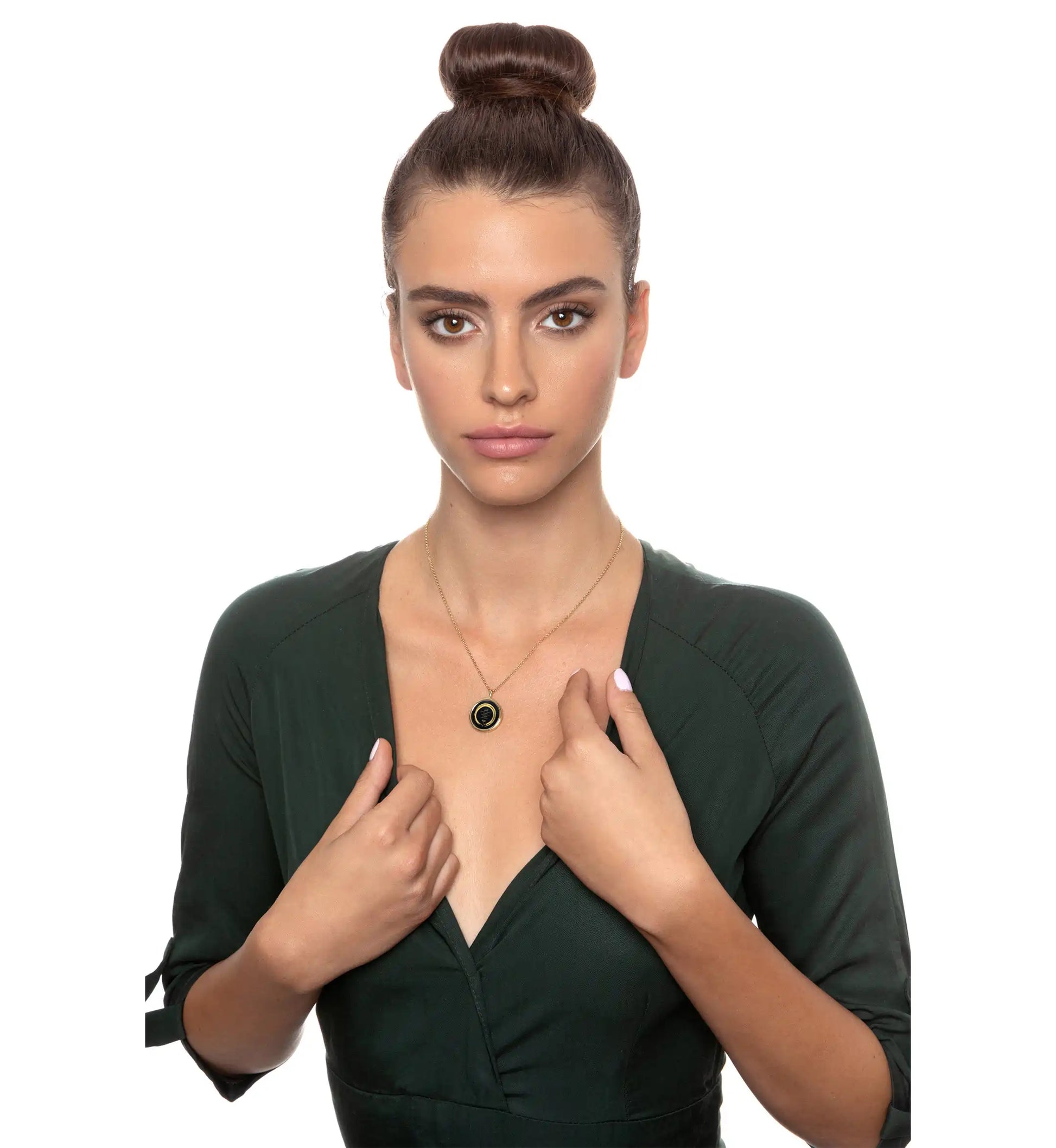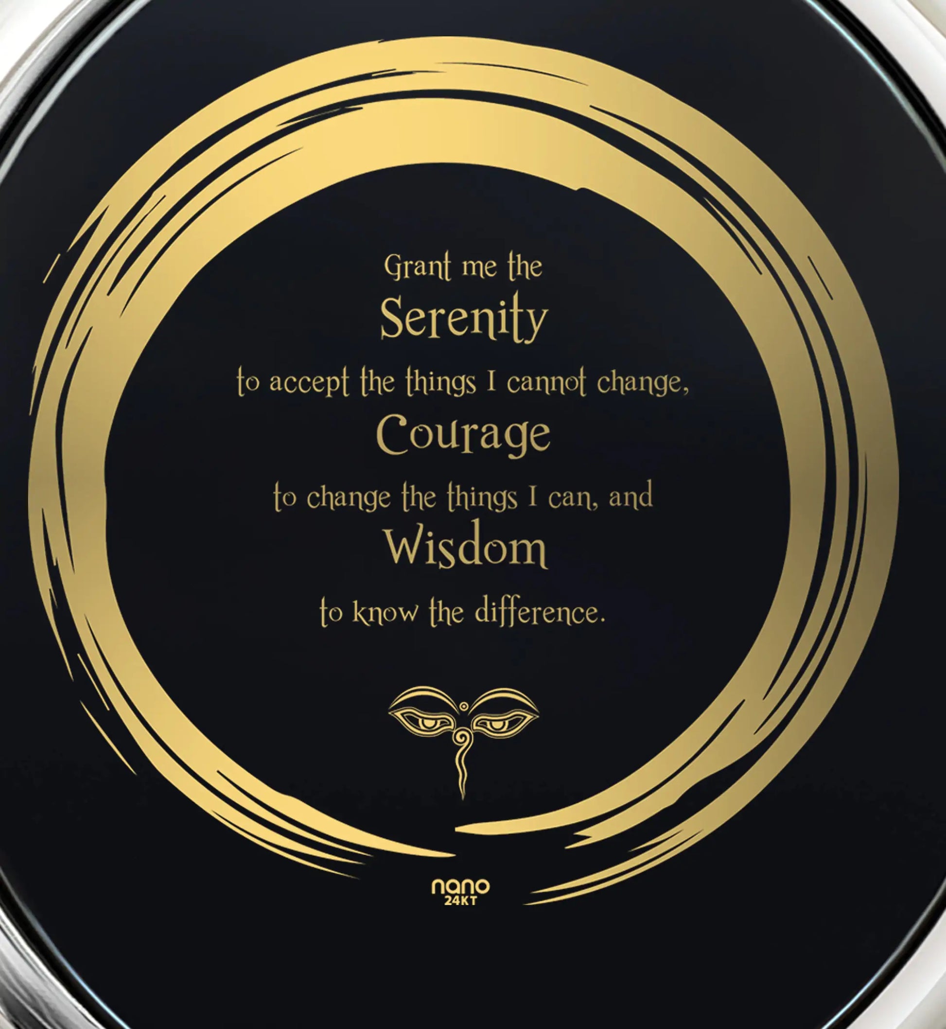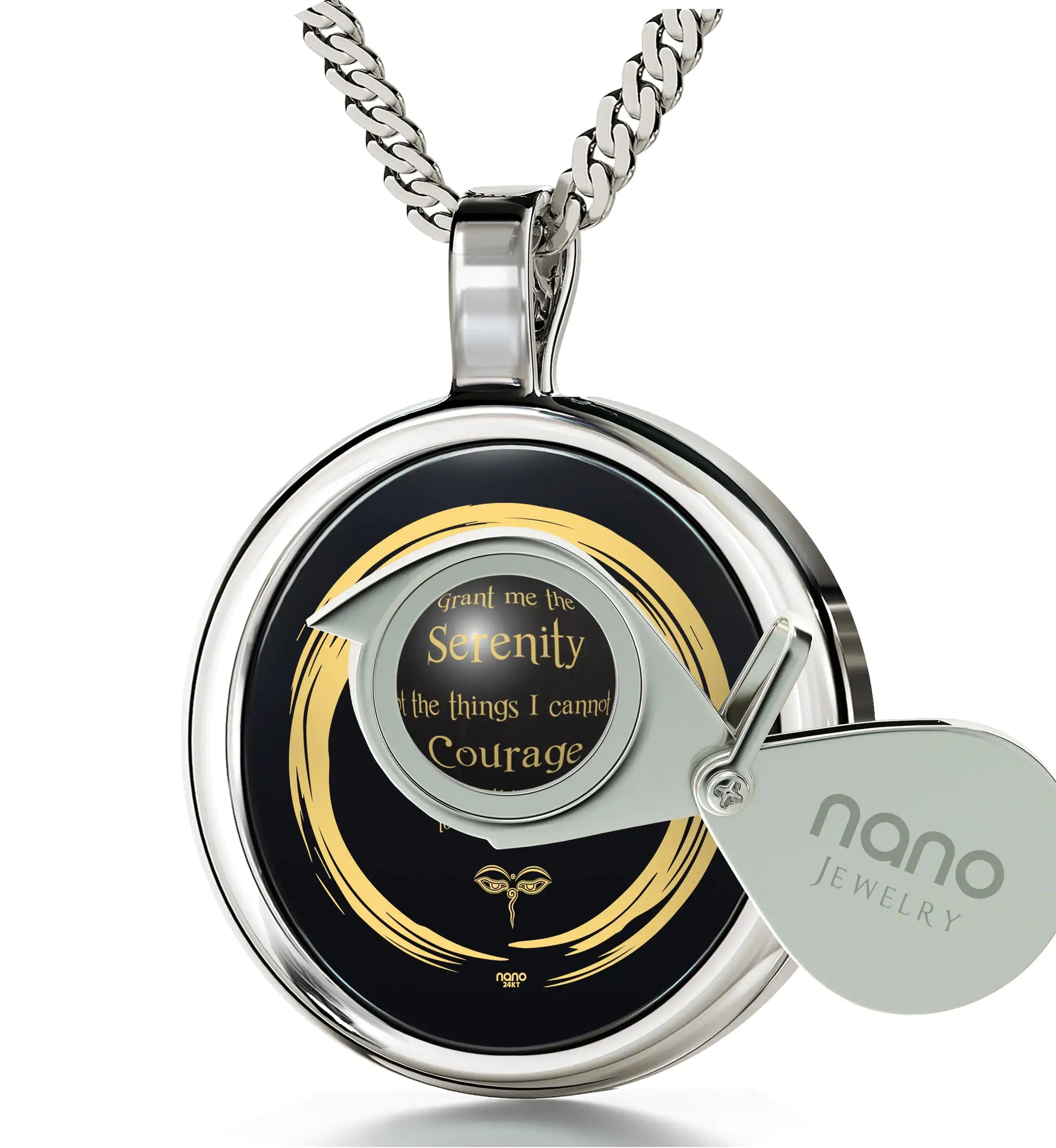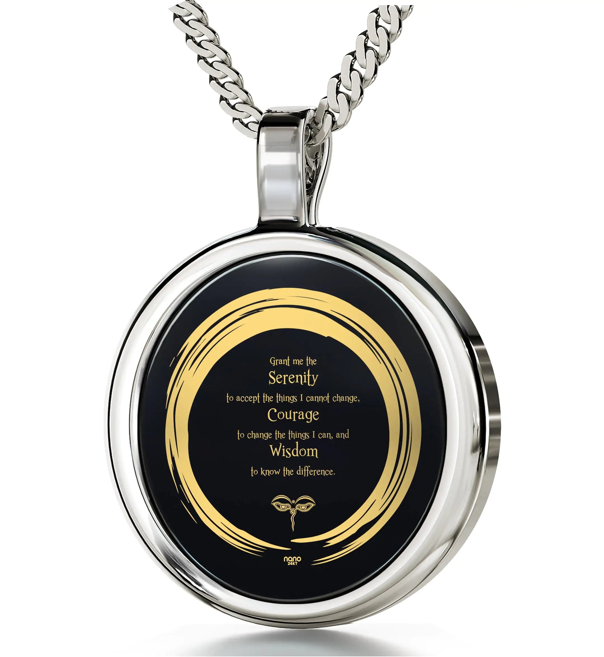 Discover the harmonious fusion of meaning and design with our Inspirational Serenity Prayer Pendant. Intricately inscribed in 24k gold, the profound words of the Serenity Prayer are elegantly encased within the Zen-inspired imperfections of the Enso circle on a round black onyx gemstone, nestled in your choice of a cameo-style metal frame. This pendant is a powerful emblem of serenity and strength, offering a constant reminder of the prayer's wisdom, celebrated by Alcoholics Anonymous and 12-step recovery programs for its message of genuine acceptance and inner peace. Embrace this wearable source of inspiration and let its elegance accompany you on your journey towards enlightenment.
