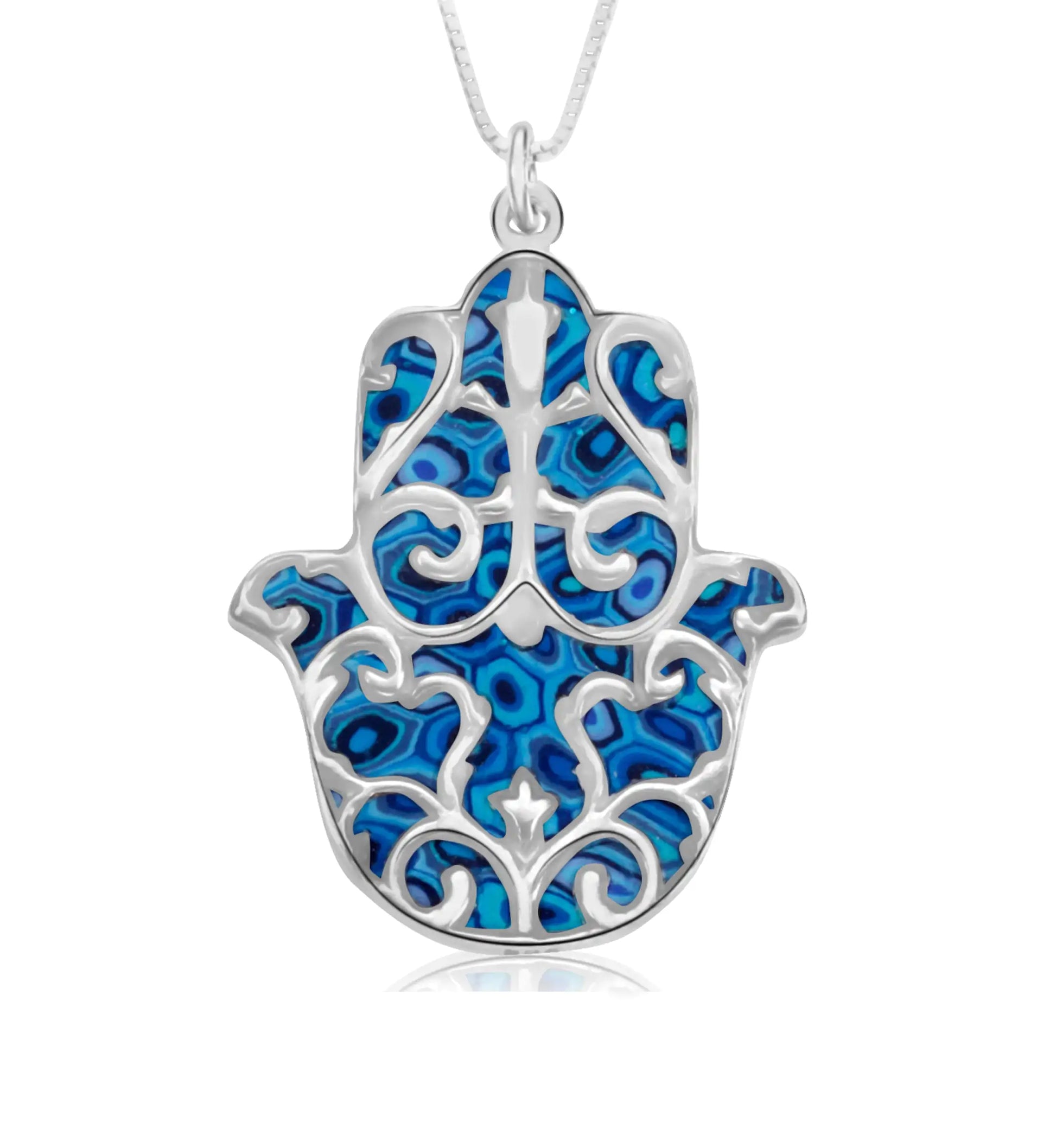 Introducing the Exquisite Fleur de Lis Hamsa Necklace, a captivating fusion of intricate craftsmanship and symbolism. Crafted from high-quality 925 sterling silver, this stunning necklace features meticulously handmade polymer clay patterns that come to life with delicate beauty. The centerpiece of the pendant showcases the revered hamsa, also known as the Hand of Fatima, adorned with a fleur de lis motif that adds an extra layer of elegance. As a powerful symbol of protection, the hamsa is believed to ward off the evil eye and bestow health, strength, and safeguarding to its wearer. Elevate your style and embrace the rich heritage of this timeless piece, a perfect adornment to carry the essence of care and well-being wherever you go.