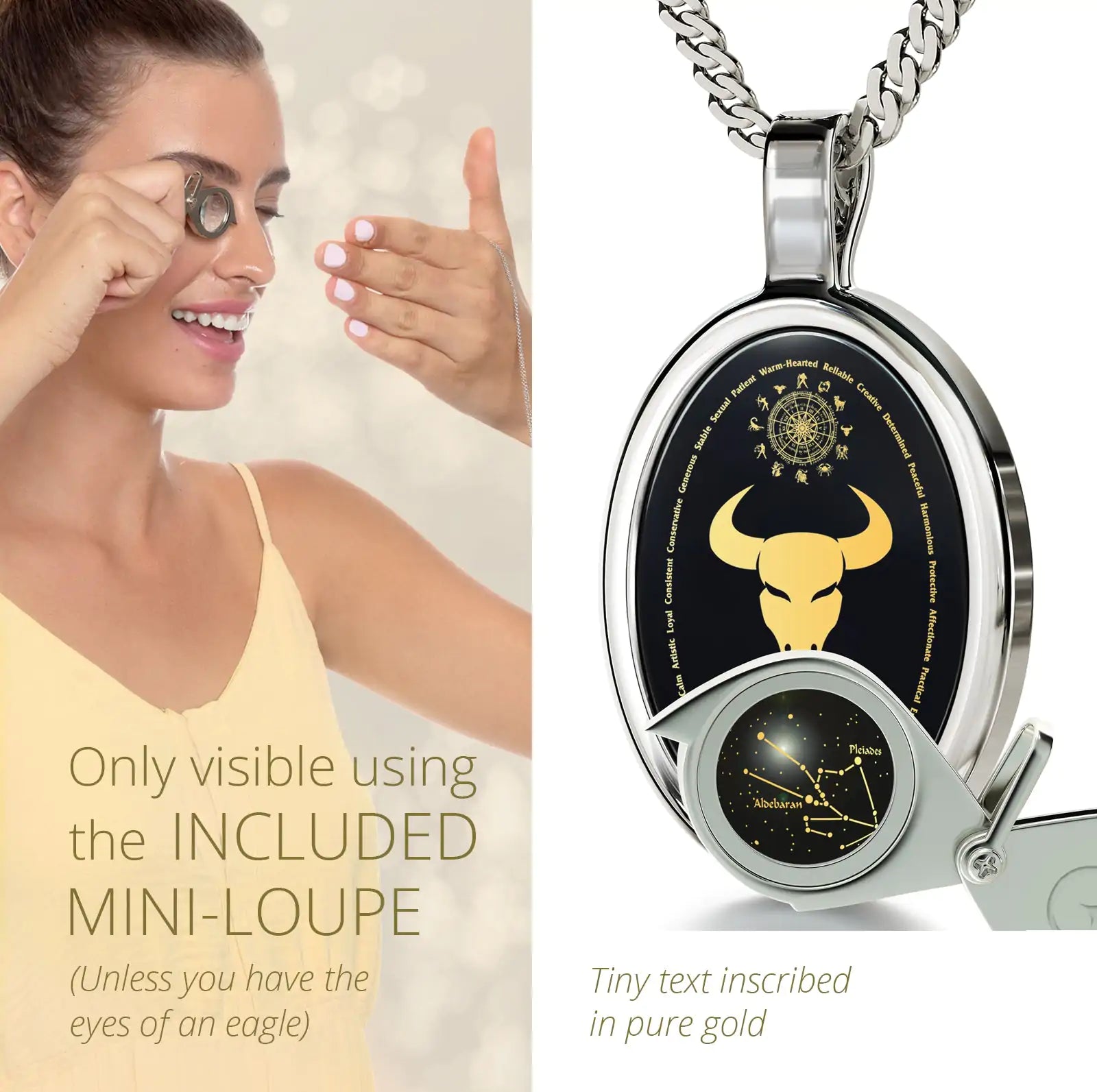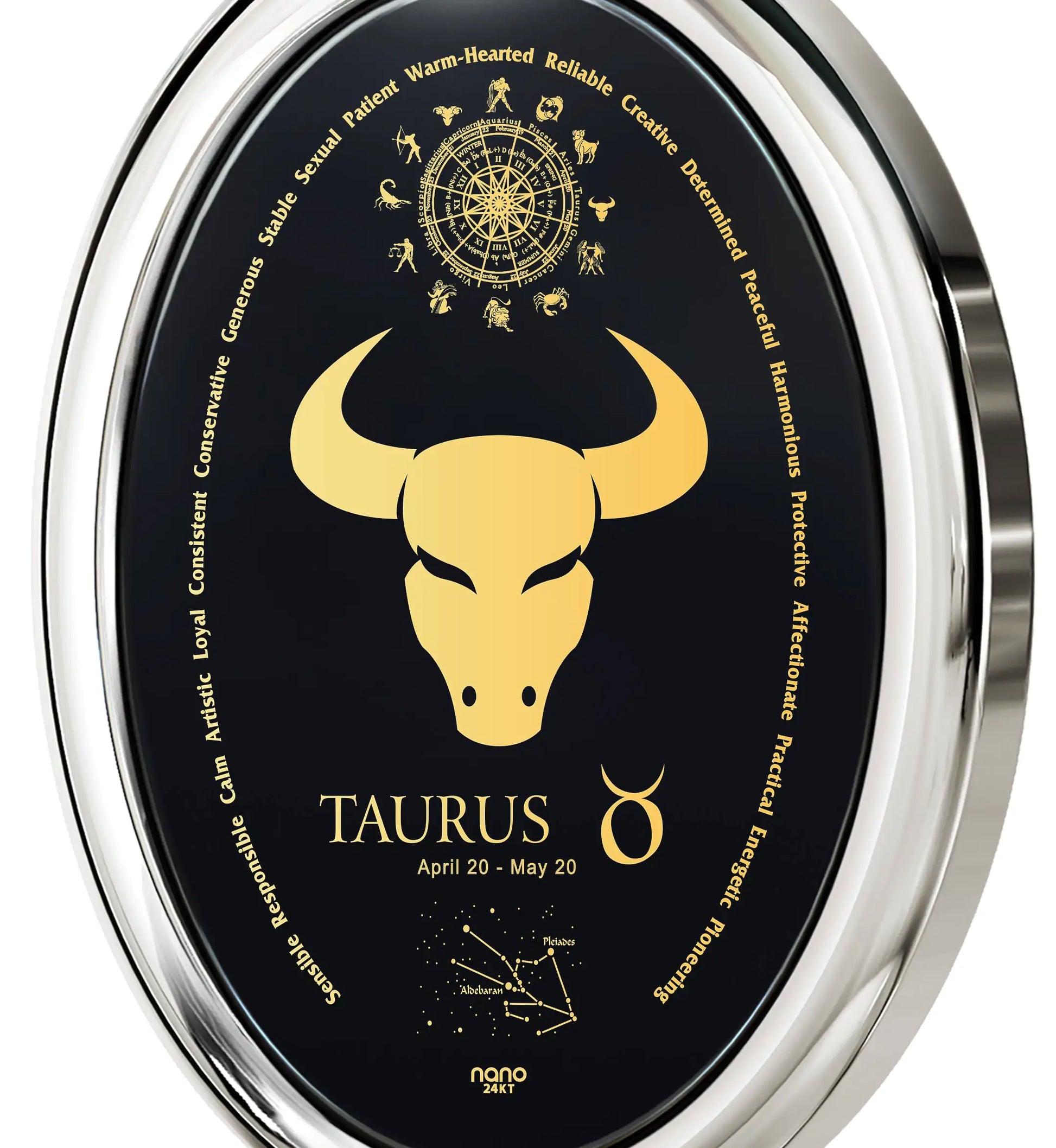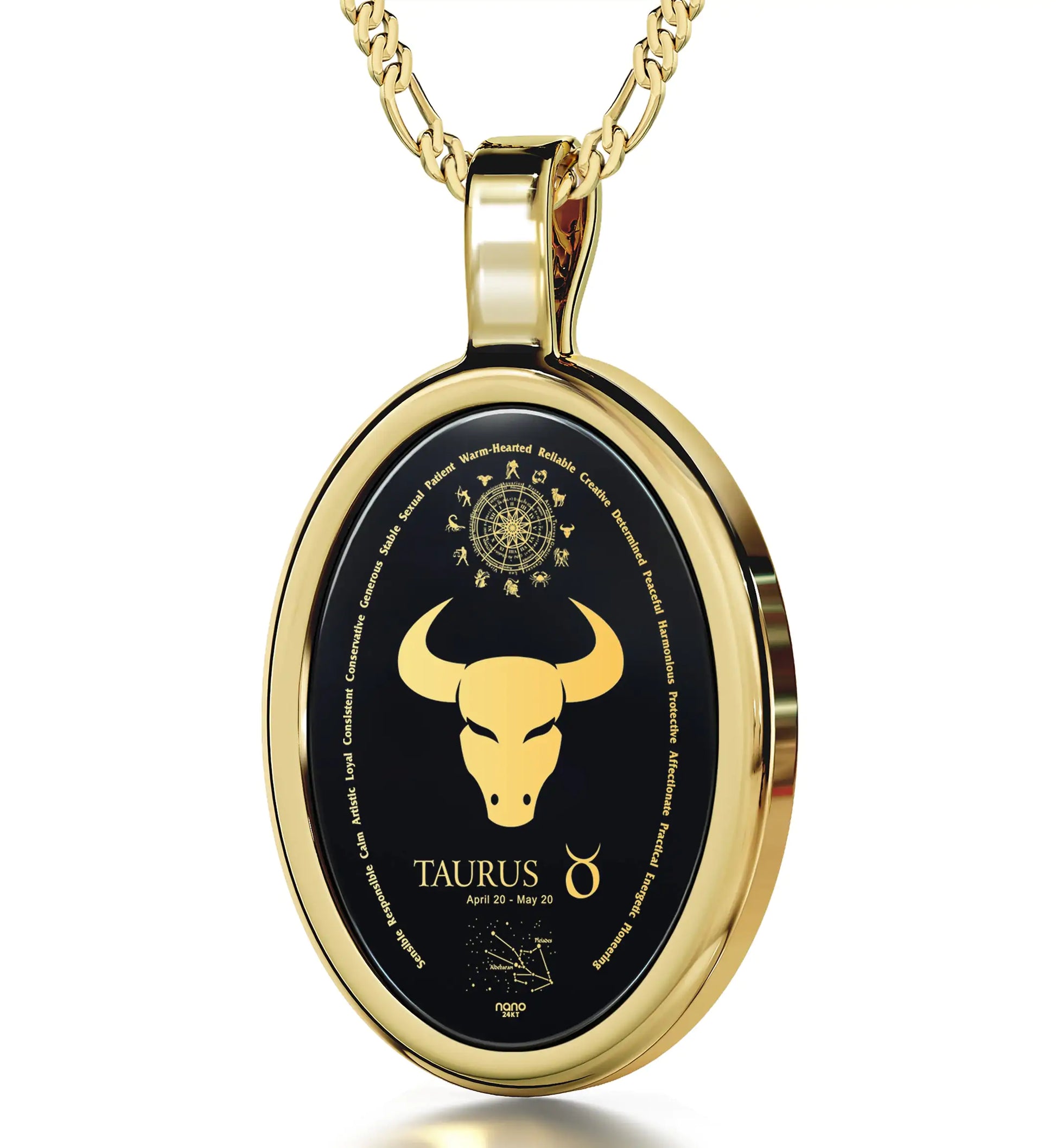 Celebrate the steadfast spirit of Taurus with our exquisite Taurus Zodiac Pendant, a captivating representation of the enduring bull meticulously inscribed in 24k gold and elegantly encased within your choice of an oval metal frame. Taurus individuals, characterized by their warmth, patience, down-to-earth nature, and loving demeanor, embody a true treasure in the lives they touch. Whether honoring your own birth month or gifting a cherished someone, this zodiac necklace elegantly highlights the distinct traits of Taurus. A unique and imaginative birthday gift, it holds special allure for astrology enthusiasts who embrace their horoscopes. With its detailed zodiac wheel, Taurus symbol, constellation, and accompanying personality traits, this pendant is a thoughtful gesture that will be cherished by anyone, from wives and girlfriends to daughters and best friends.