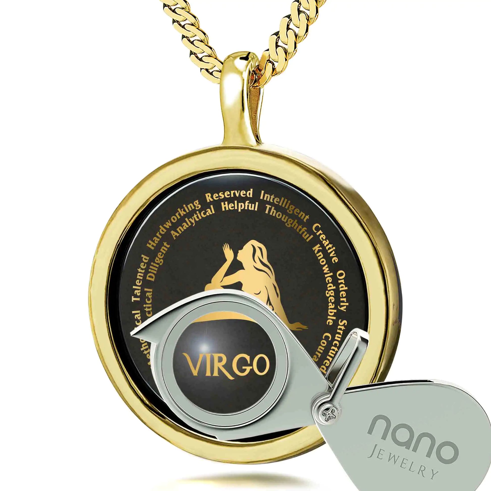 - Elegant Virgo necklace inscribed in 24k gold with virgin star sign surrounded by personality characteristics in intricate detail